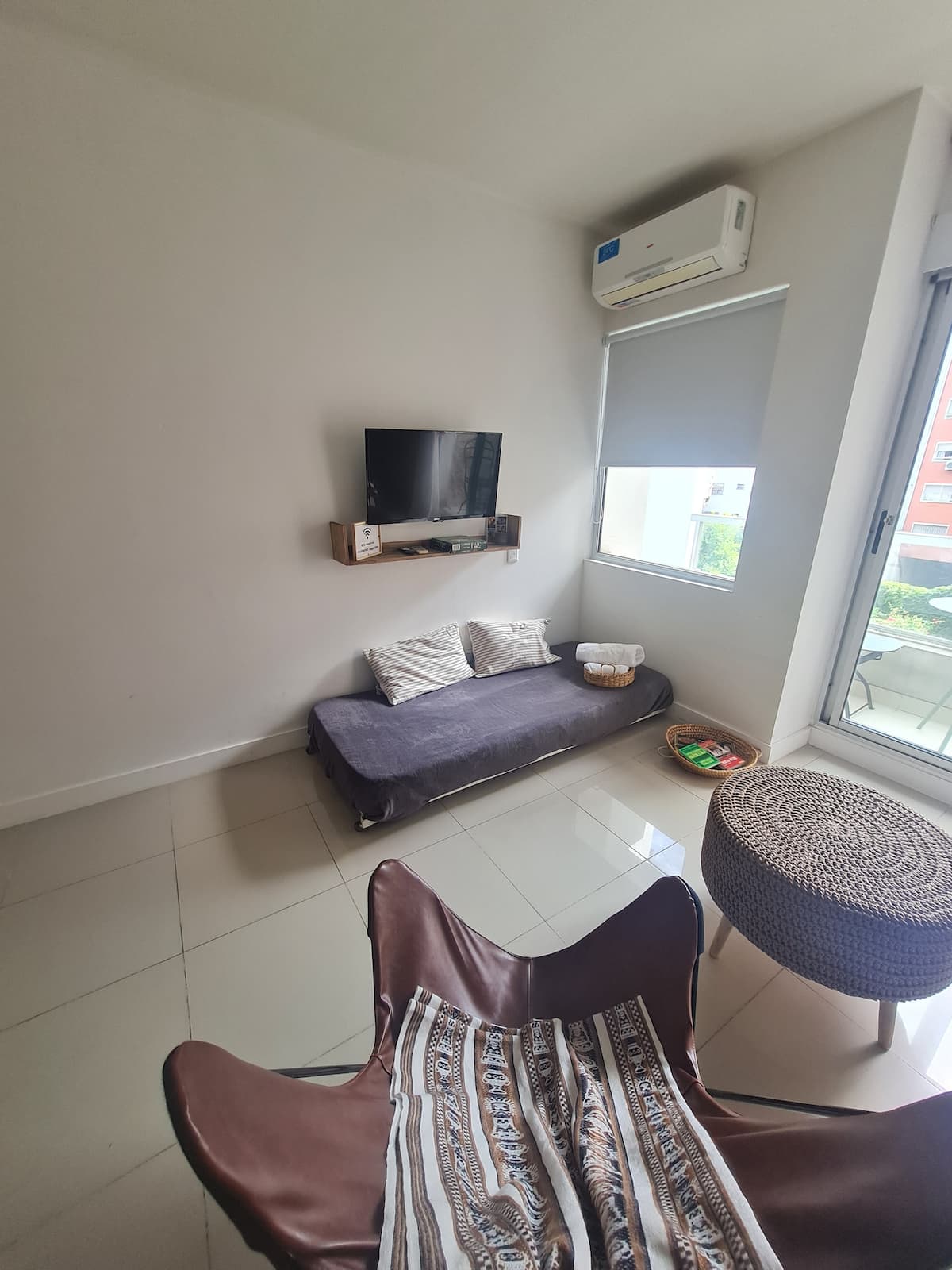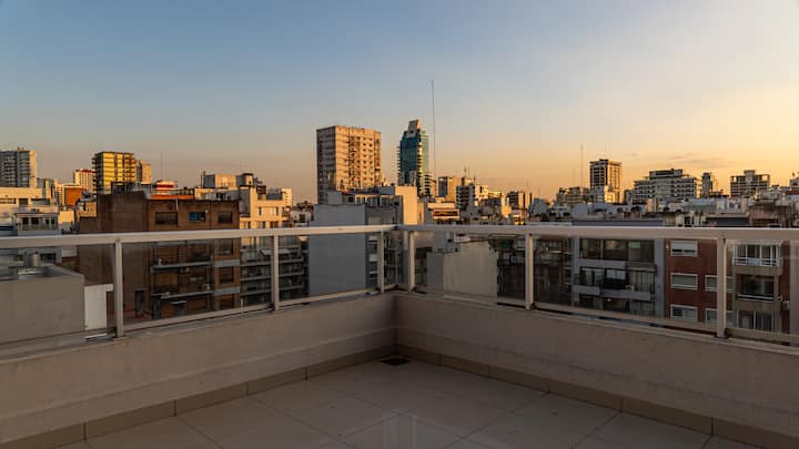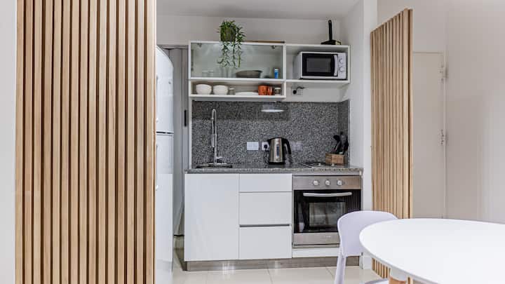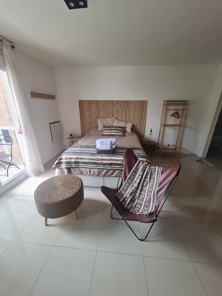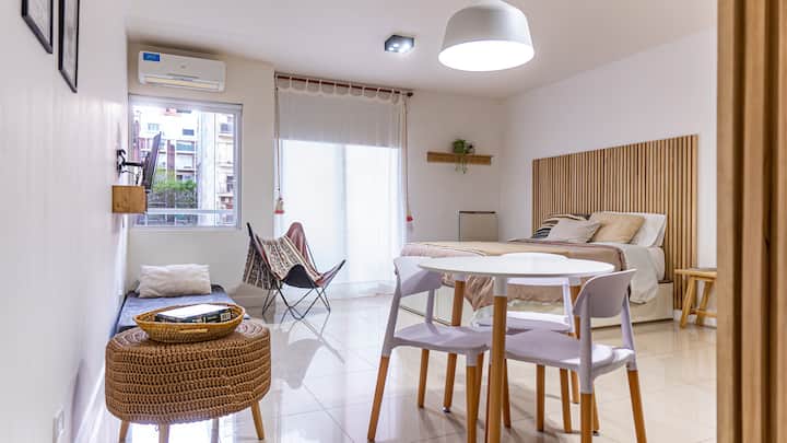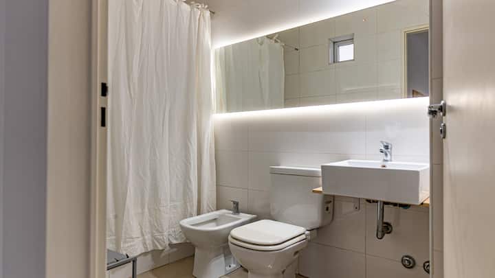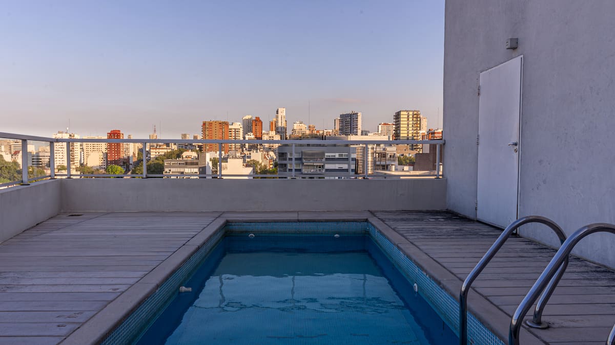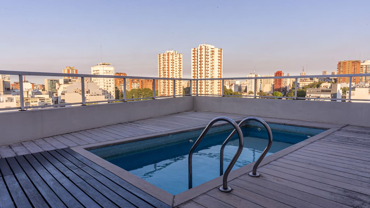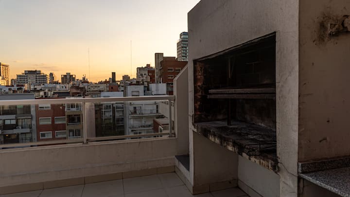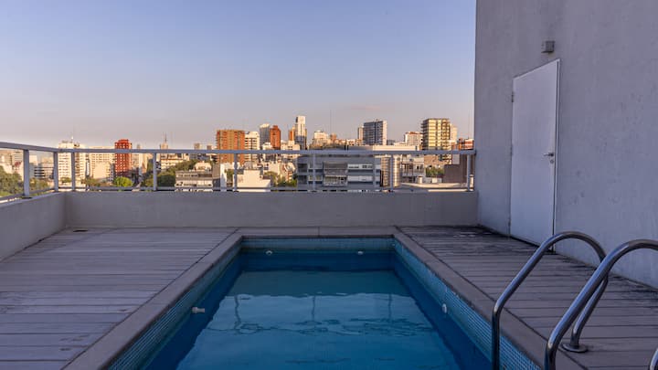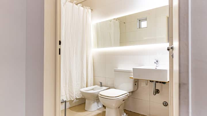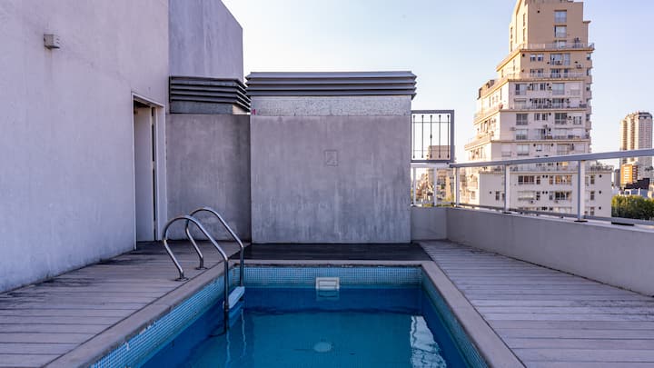 Fully furnished and equipped studio apartment in Belgrano, in a quiet area. One room with a double bed and an extra single bed, plus a full bathroom with a bathtub and bidet; fully equipped kitchen. The building has a terrace with a grill, as well as access to a pool and laundry for guests.