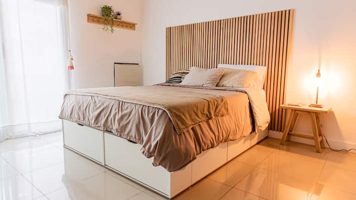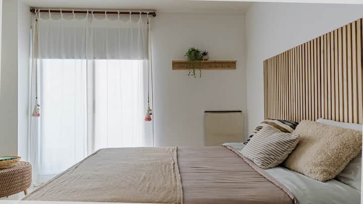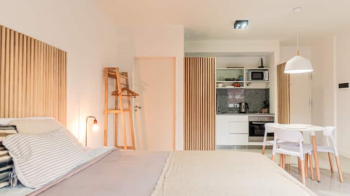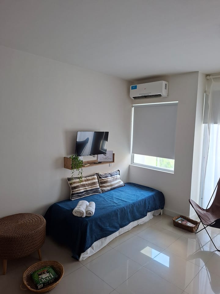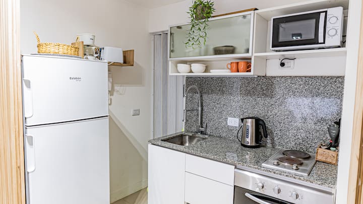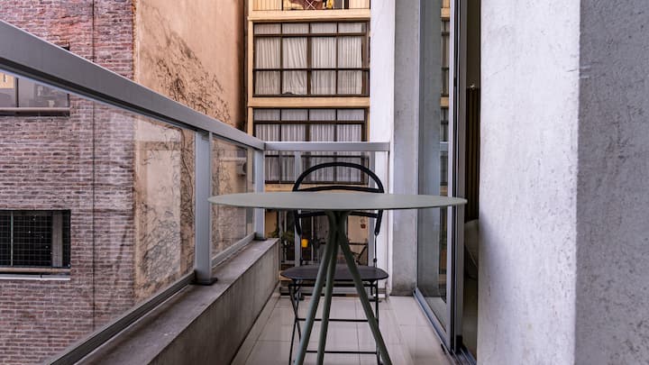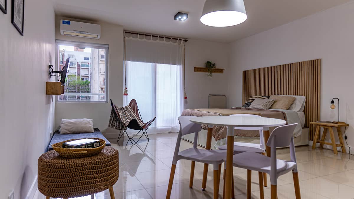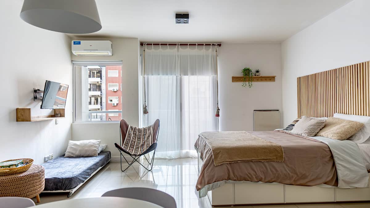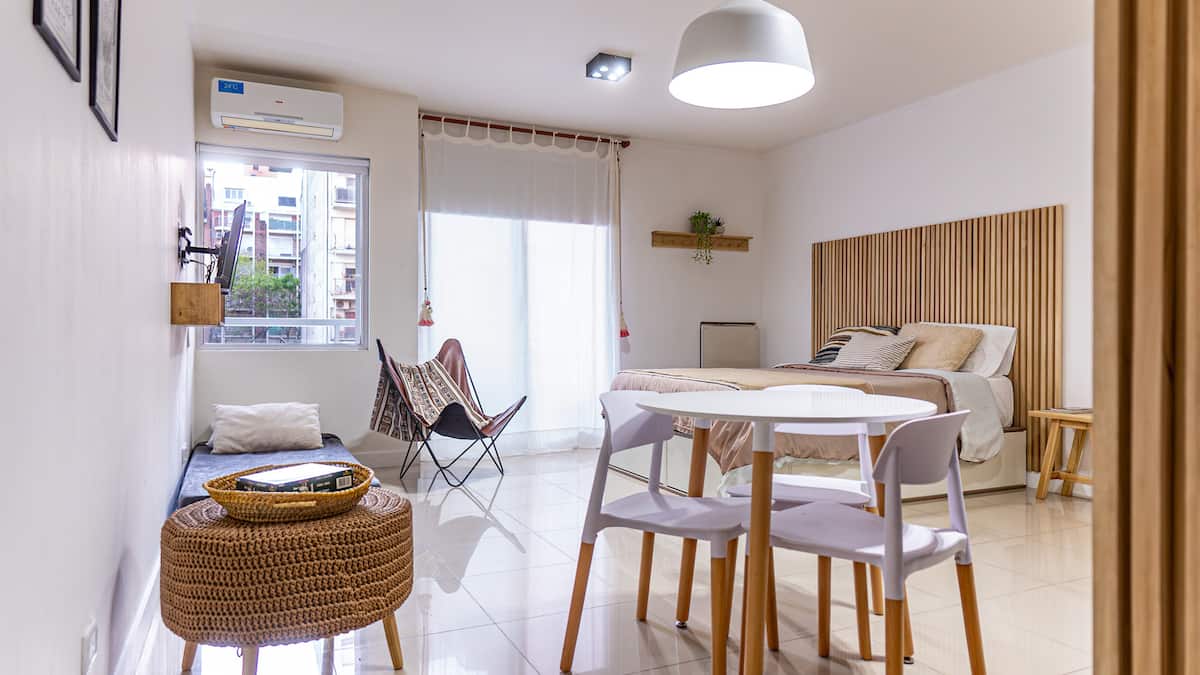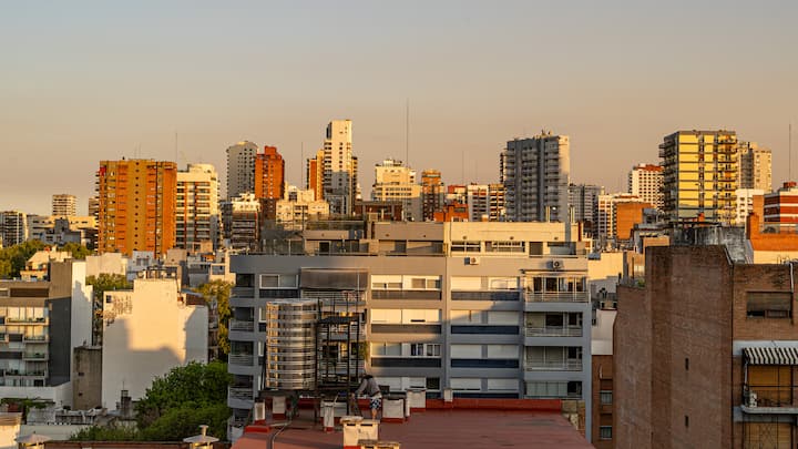 Fully furnished and equipped studio apartment in Belgrano, in a quiet area. One room with a double bed and an extra single bed, plus a full bathroom with a bathtub and bidet; fully equipped kitchen. The building has a terrace with a grill, as well as access to a pool and laundry for guests.