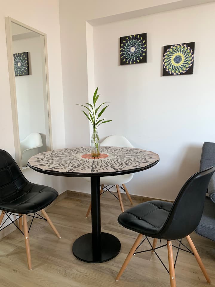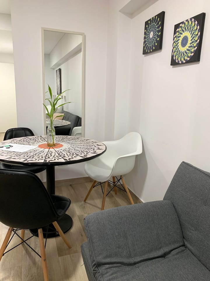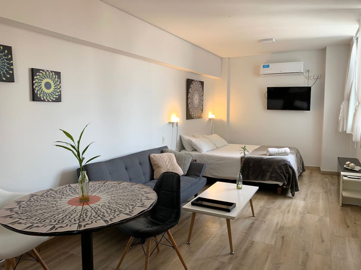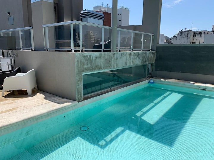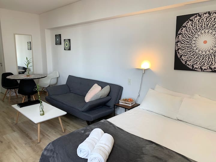 One-and-a-half-room apartment in Belgrano, furnished. It has a double bed, a private bathroom and a fully equipped kitchen with cooking utensils. WiFi, Smart TV and hot-and-cold air conditioning are included, along with parking space in the building. Guests have access to a laundry room on the 10th floor, with washers and dryers operated using Lava Ya tokens. A pool is located in the twin building on the same block, accessed via a digital key.