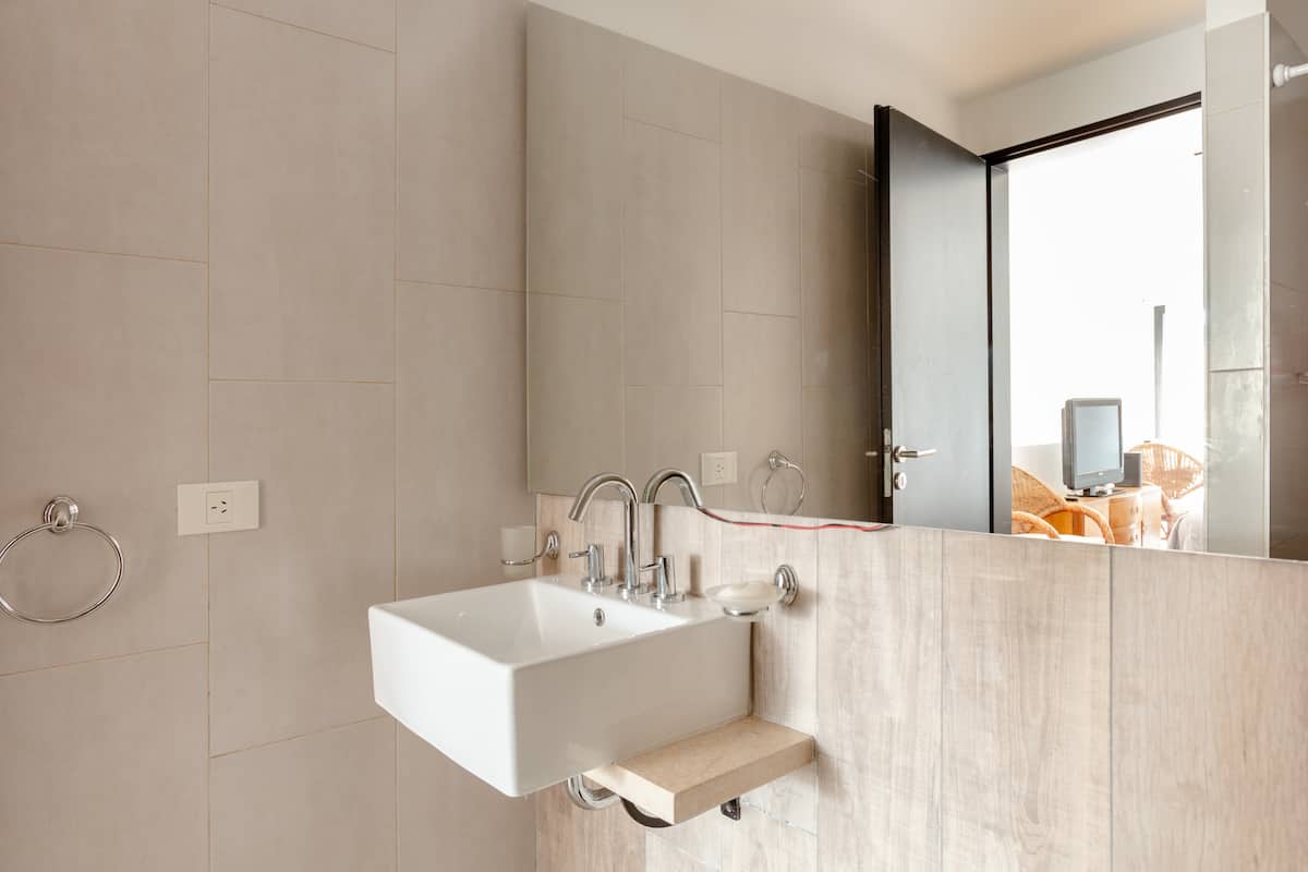 Duplex apartment in Belgrano on the 5th floor, street-facing on Av. Ricardo Balbín. The unit includes a living area with a bathroom, a combined kitchen with laundry, a city-view balcony, and a bedroom on the upper floor with built-in wardrobe and an en-suite bathroom. It is equipped with a refrigerator with freezer, microwave, washing machine, Smart TV, safe, Wi‑Fi, and an electronic lock.
