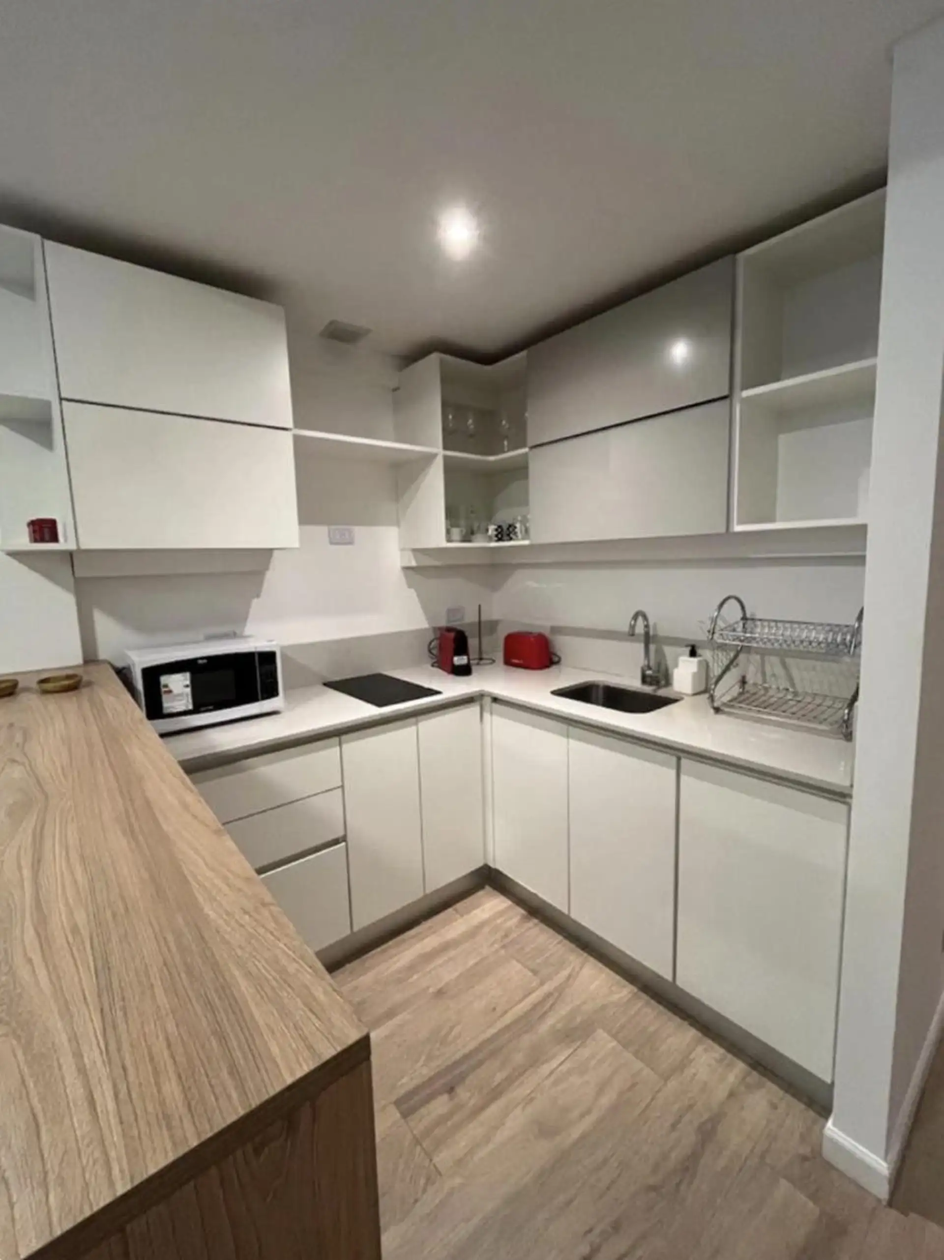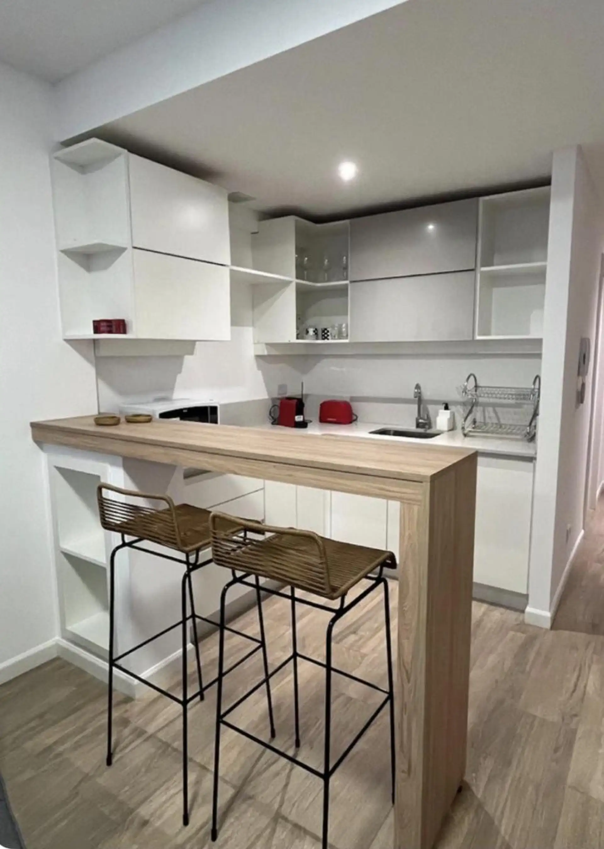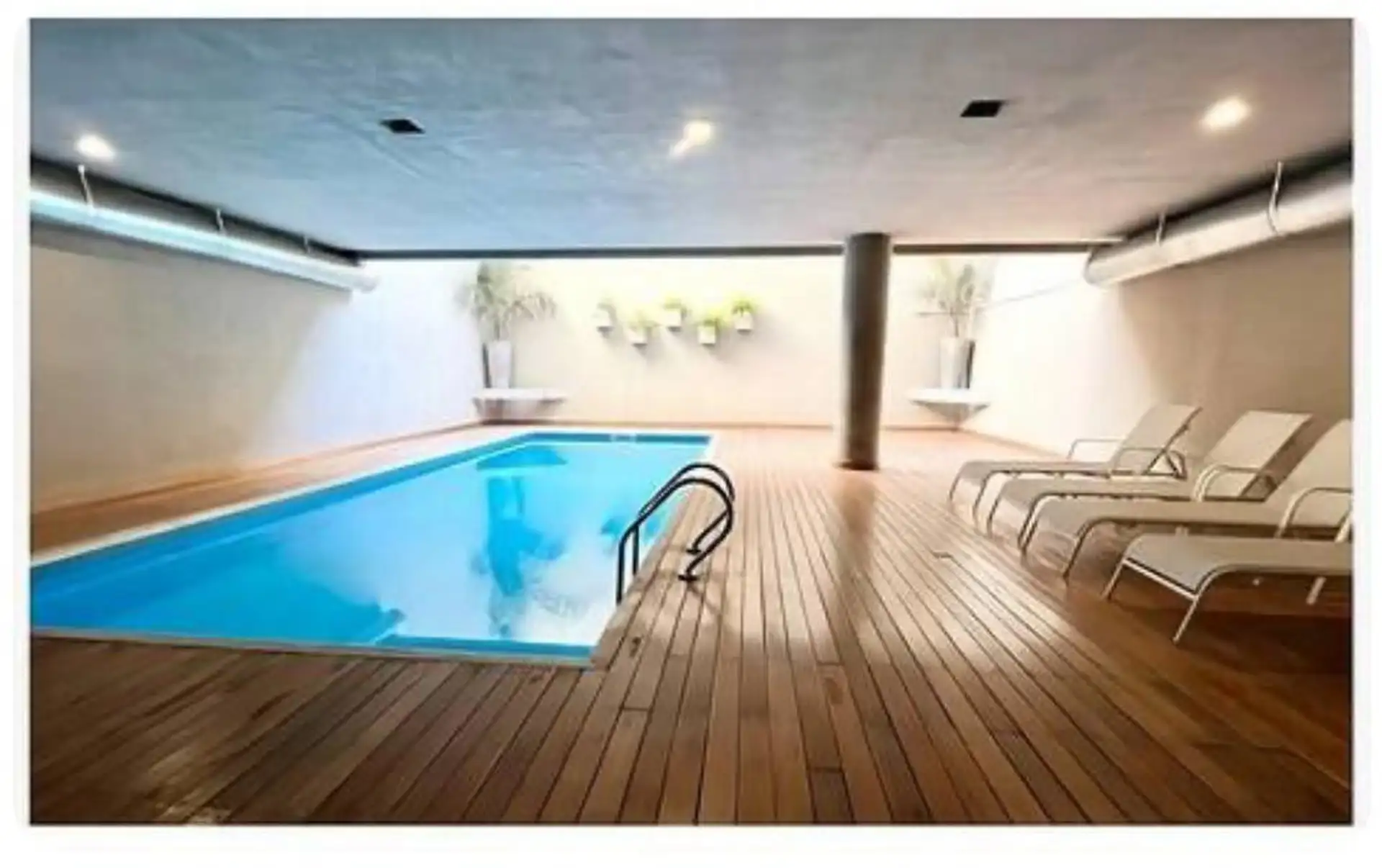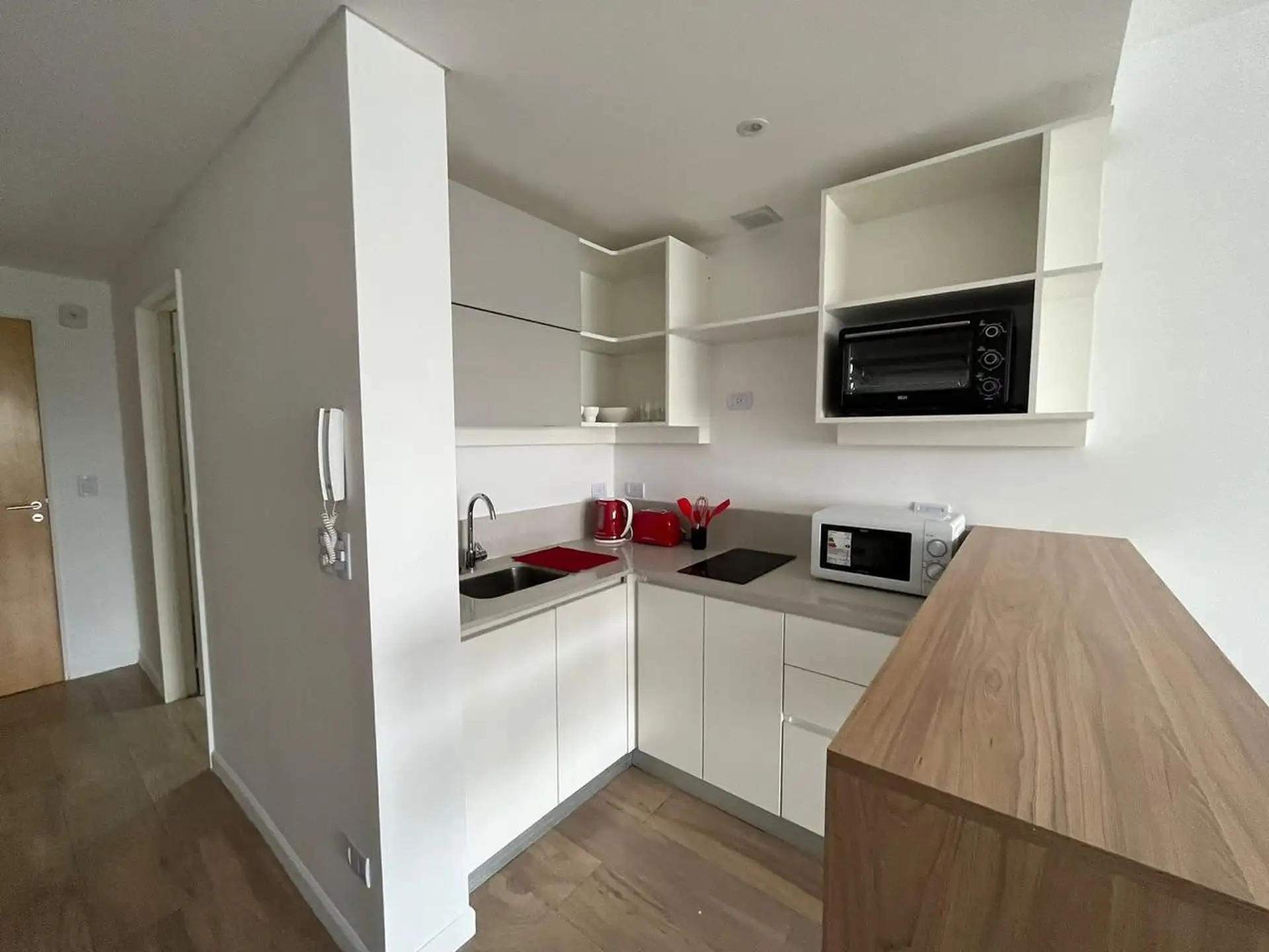 Studio apartment in Belgrano with a large living area and street-facing balcony access. Open-plan kitchen with hotplates and an electric oven, plus a full bathroom. Delivered freshly painted; amenities include a laundry room, communal room (SUM), grill area and pool. Available from April 2024.