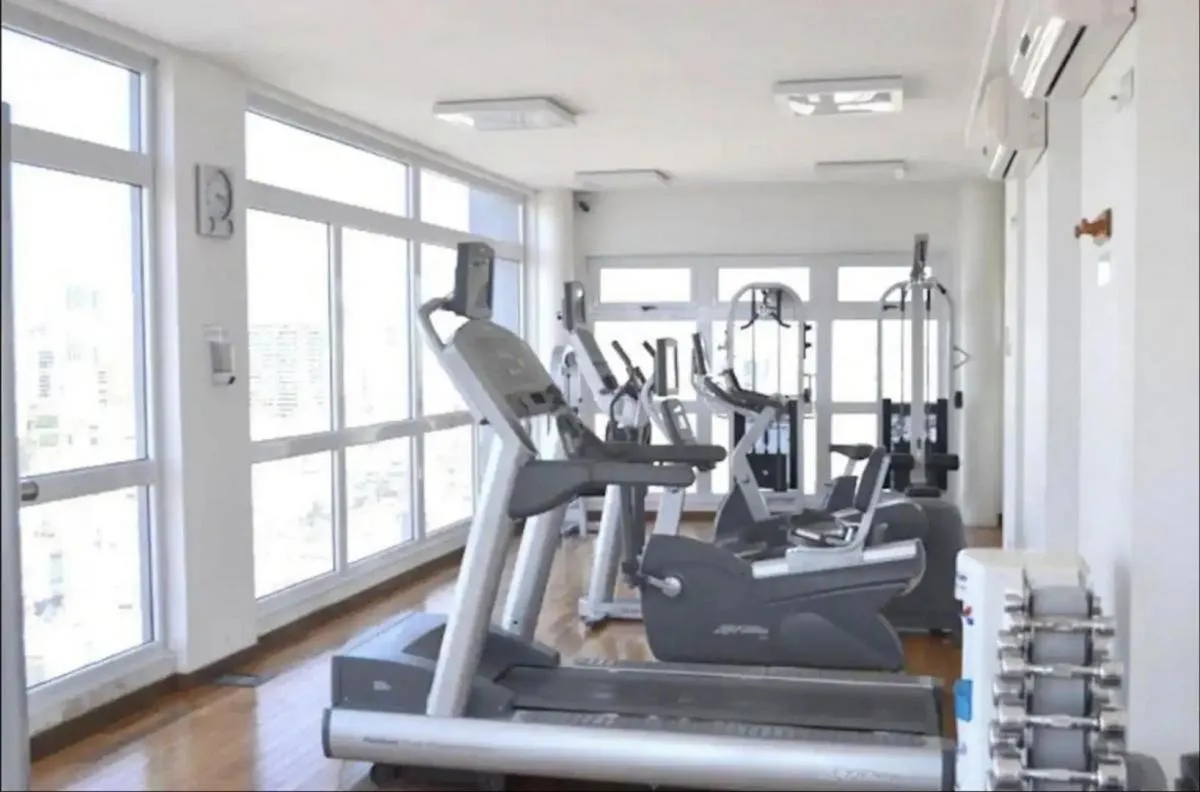 Two-room furnished apartment in Belgrano, 19th floor, with a balcony. The unit includes a living-dining area with access to the balcony, a semi-integrated equipped kitchen with a breakfast bar, a full bathroom, and a bedroom with built-in closets. It has porcelain tile floors, air conditioning in all rooms, and heating via a boiler. A covered assigned parking space is included. The building offers a solarium with deck, a large residents’ lounge (SUM), a cinema room with projector, sauna, Scottis