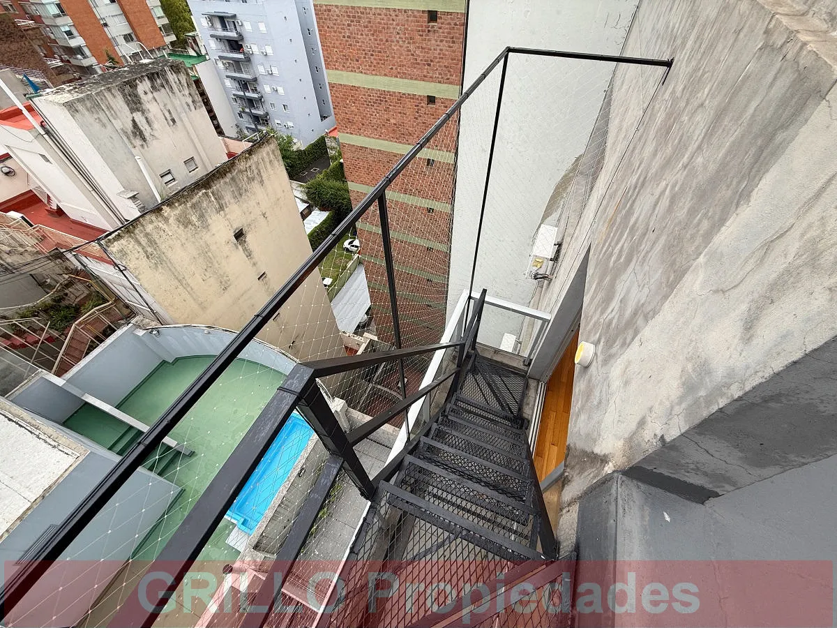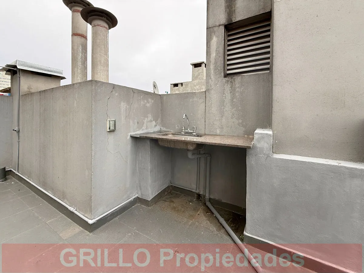 Studio apartment of 61 m² total (31 m² covered), 10th floor, courtyard-facing (contrafrente) with a balcony and access to a private terrace via a private staircase. Living-dining area with integrated kitchen; electric cooktop and electric oven, built-in wardrobes, full bathroom with bathtub, and installed hot-and-cold air conditioning. Private terrace includes a grill; building amenities include a pool and a communal lounge (SUM). Building is 9 years old with 10 floors and access by stairs and/o