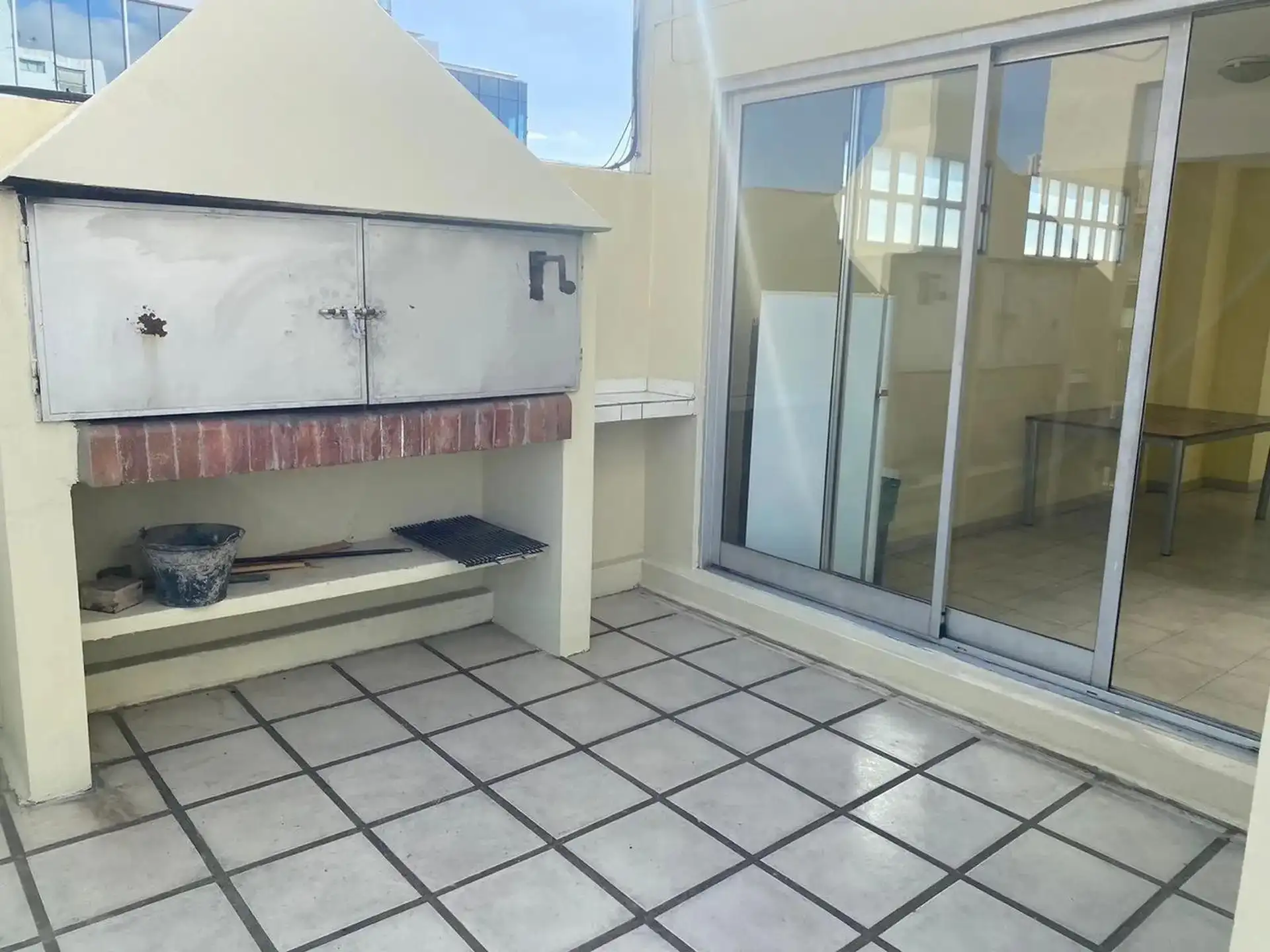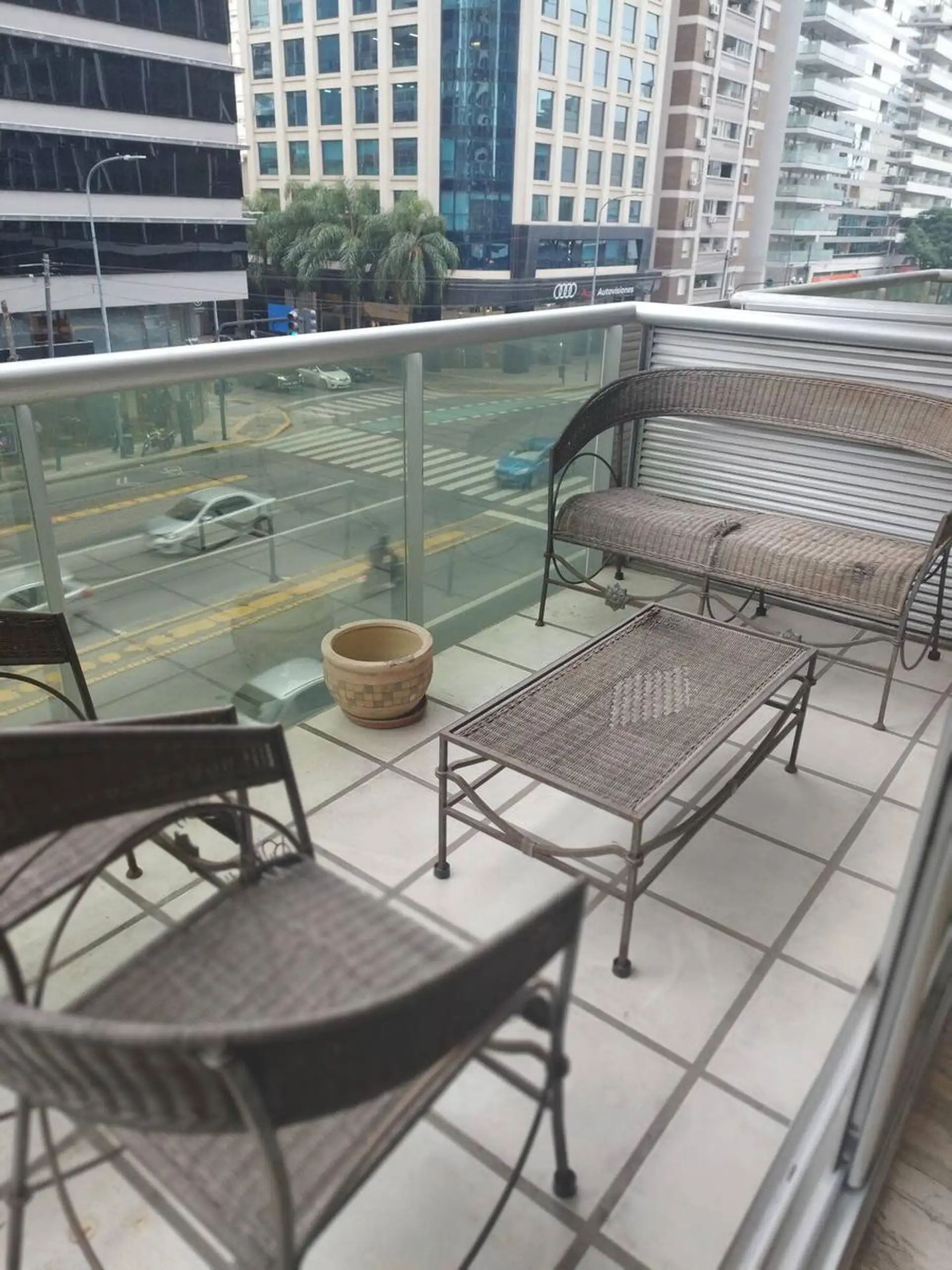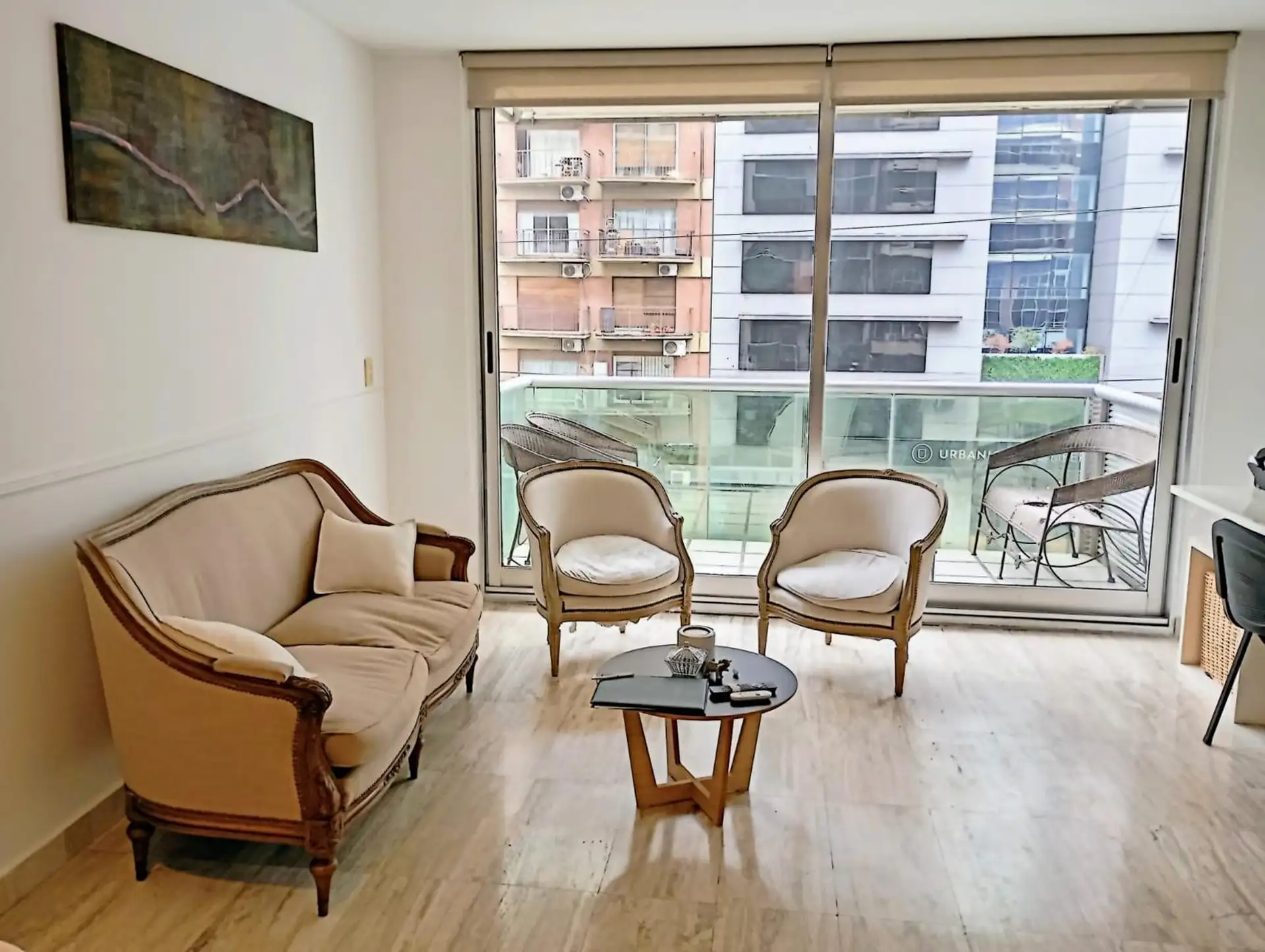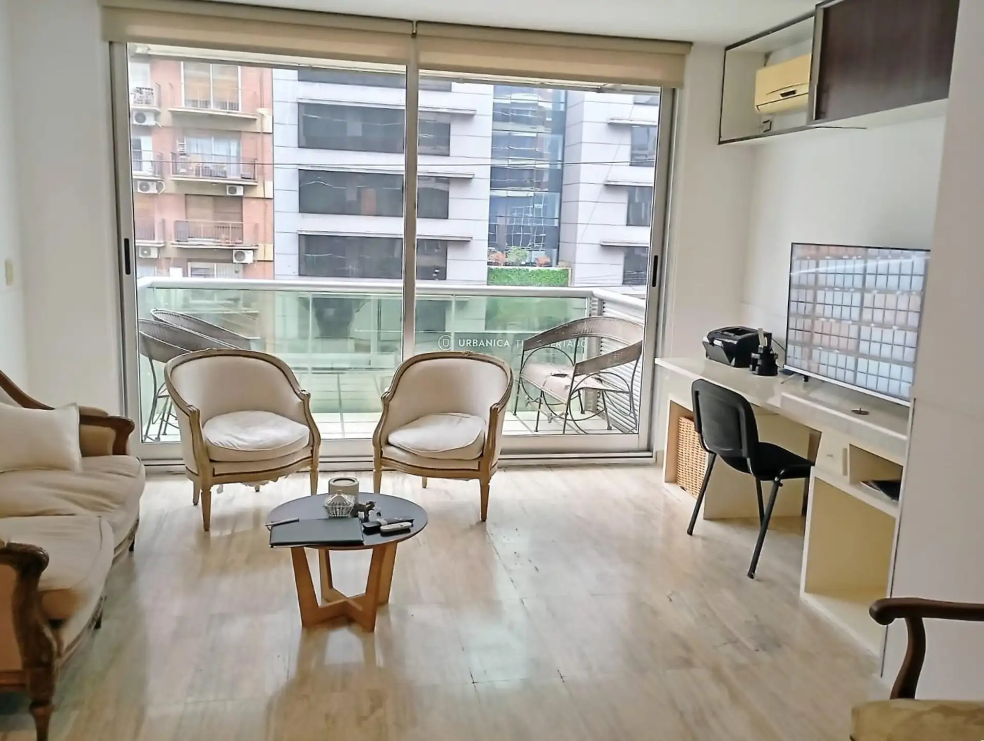 Furnished semi-floor apartment available from 1 May 2026, on Av del Libertador with full equipment. It includes a fitted balcony, a guest toilet, a suite with built-in closet, bathtub and exterior ventilation, and a separate kitchen with an electric 4-burner cooktop and oven, a large refrigerator, and kitchenware and appliances for daily use. Roller curtains are installed in the suite and living room. The building has 24-hour doorman and security (cameras and on-site staff), a ground-floor parki