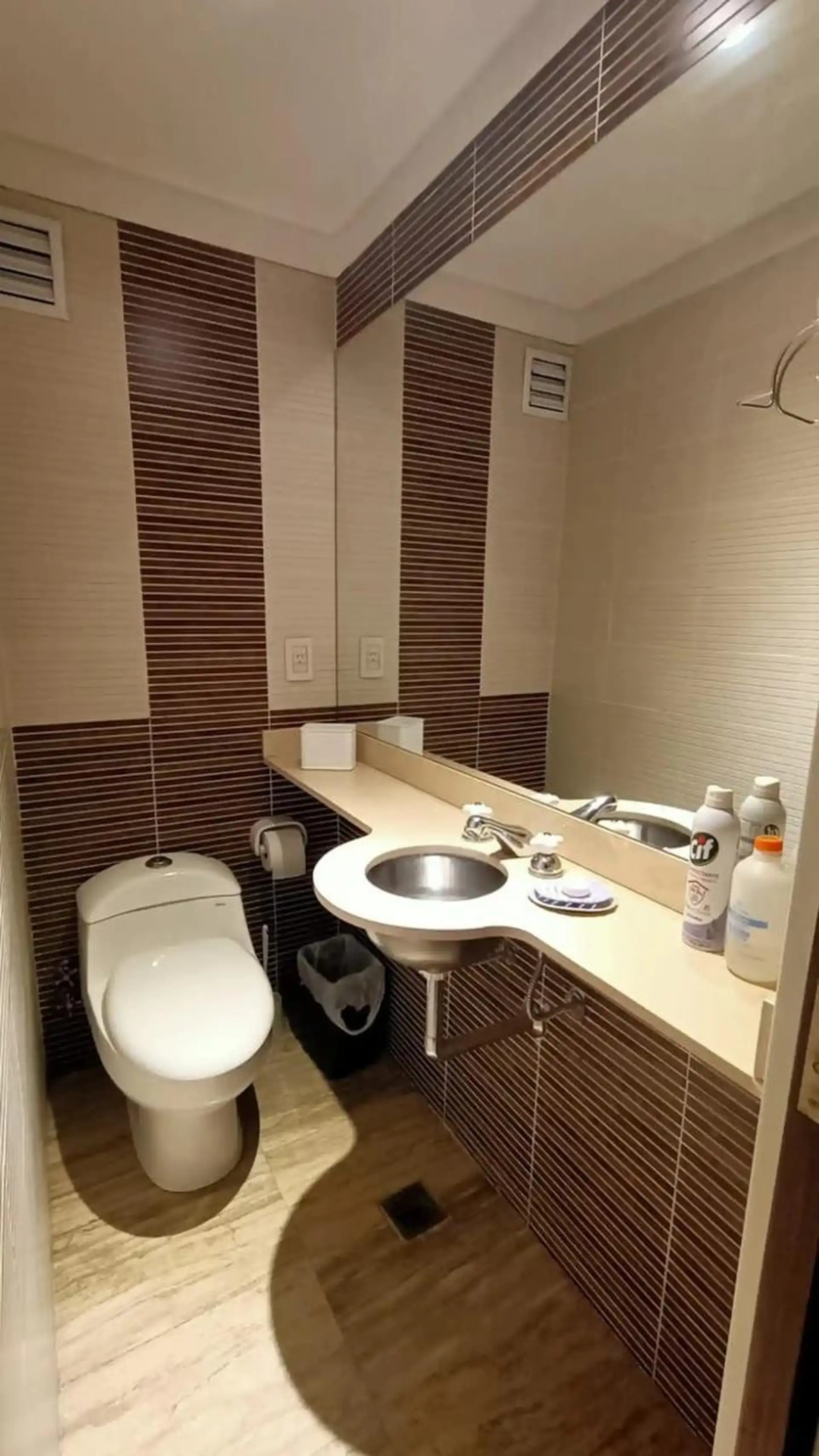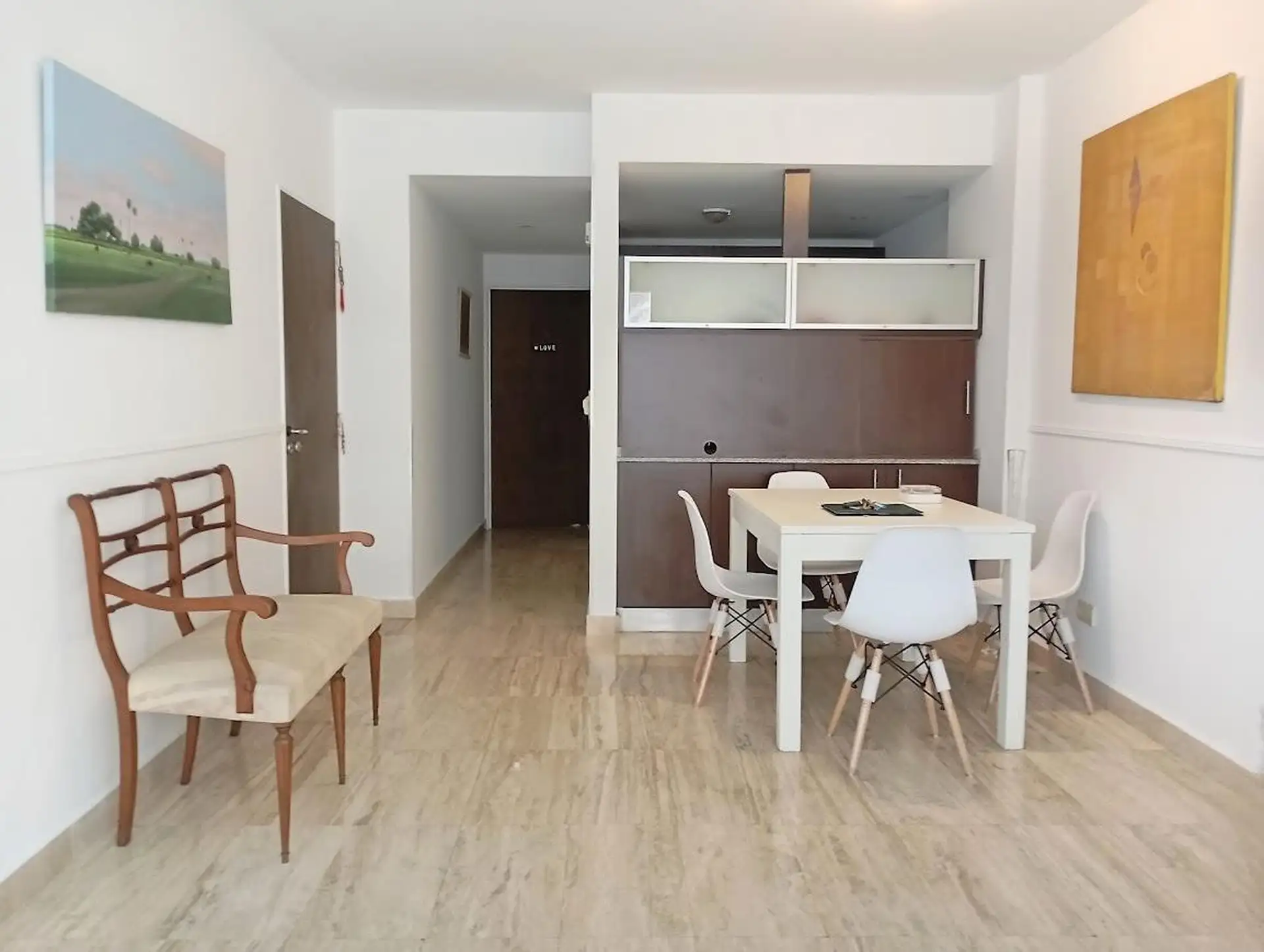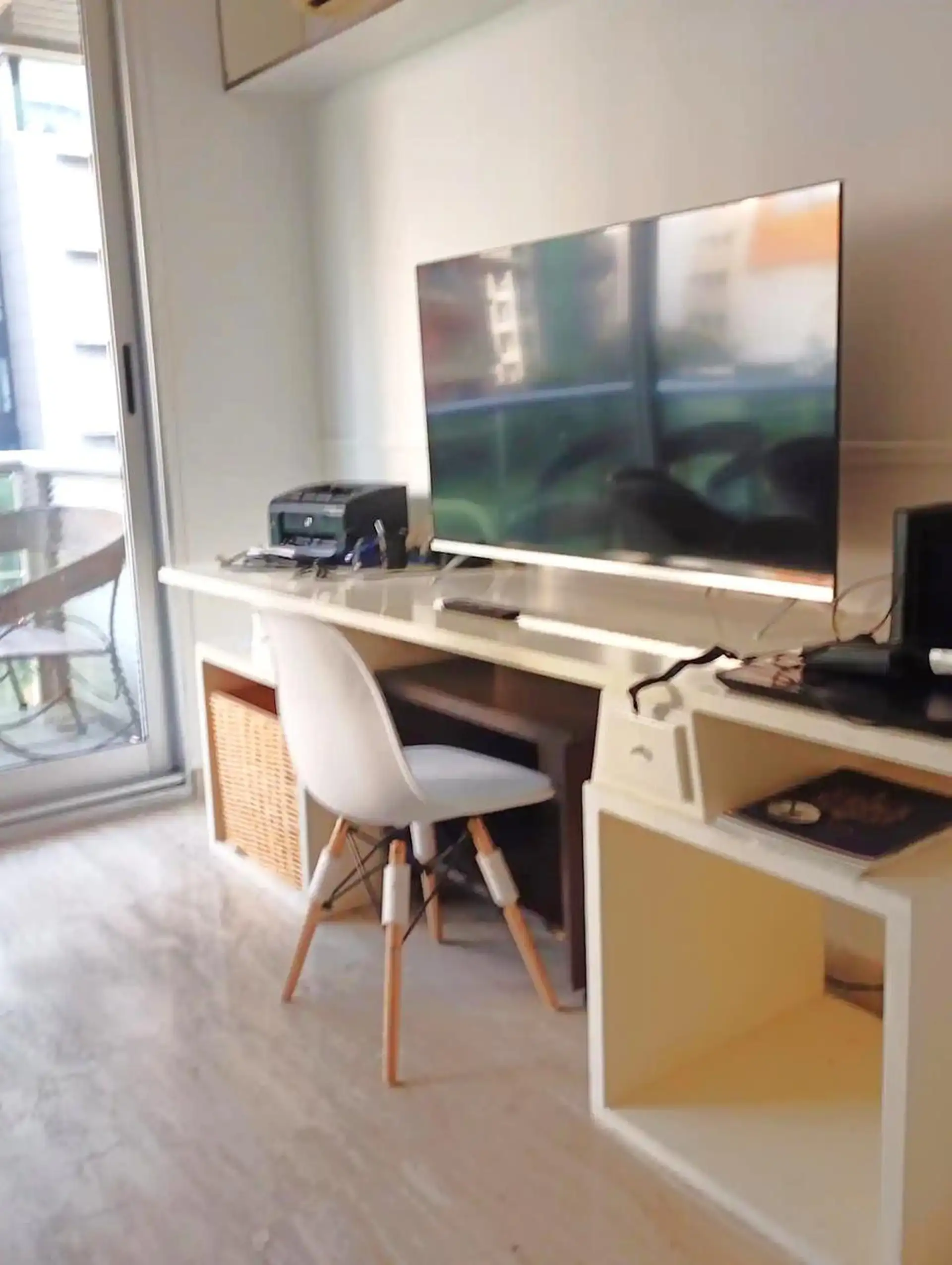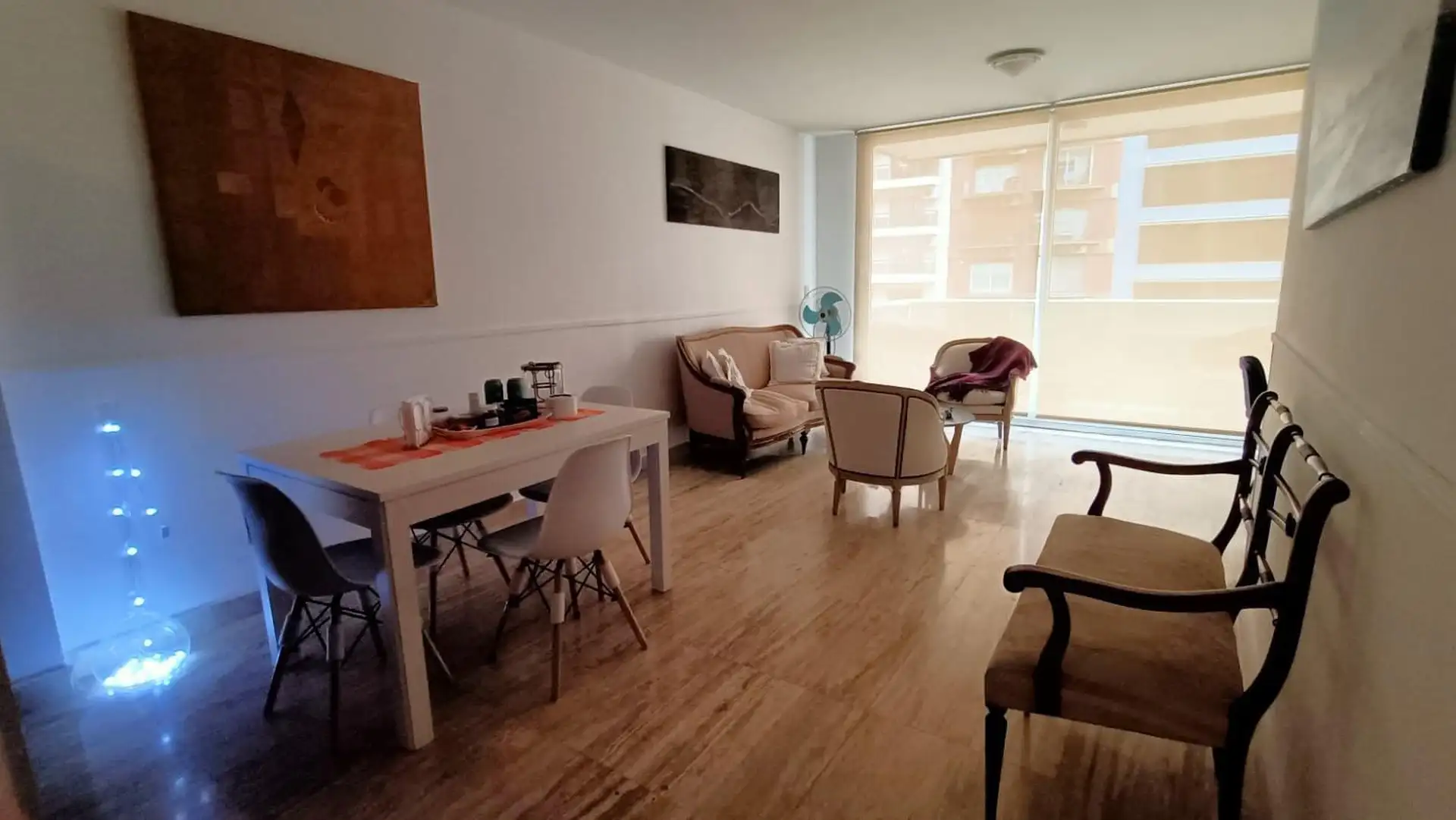 Furnished semi-floor apartment available from 1 May 2026, on Av del Libertador with full equipment. It includes a fitted balcony, a guest toilet, a suite with built-in closet, bathtub and exterior ventilation, and a separate kitchen with an electric 4-burner cooktop and oven, a large refrigerator, and kitchenware and appliances for daily use. Roller curtains are installed in the suite and living room. The building has 24-hour doorman and security (cameras and on-site staff), a ground-floor parki