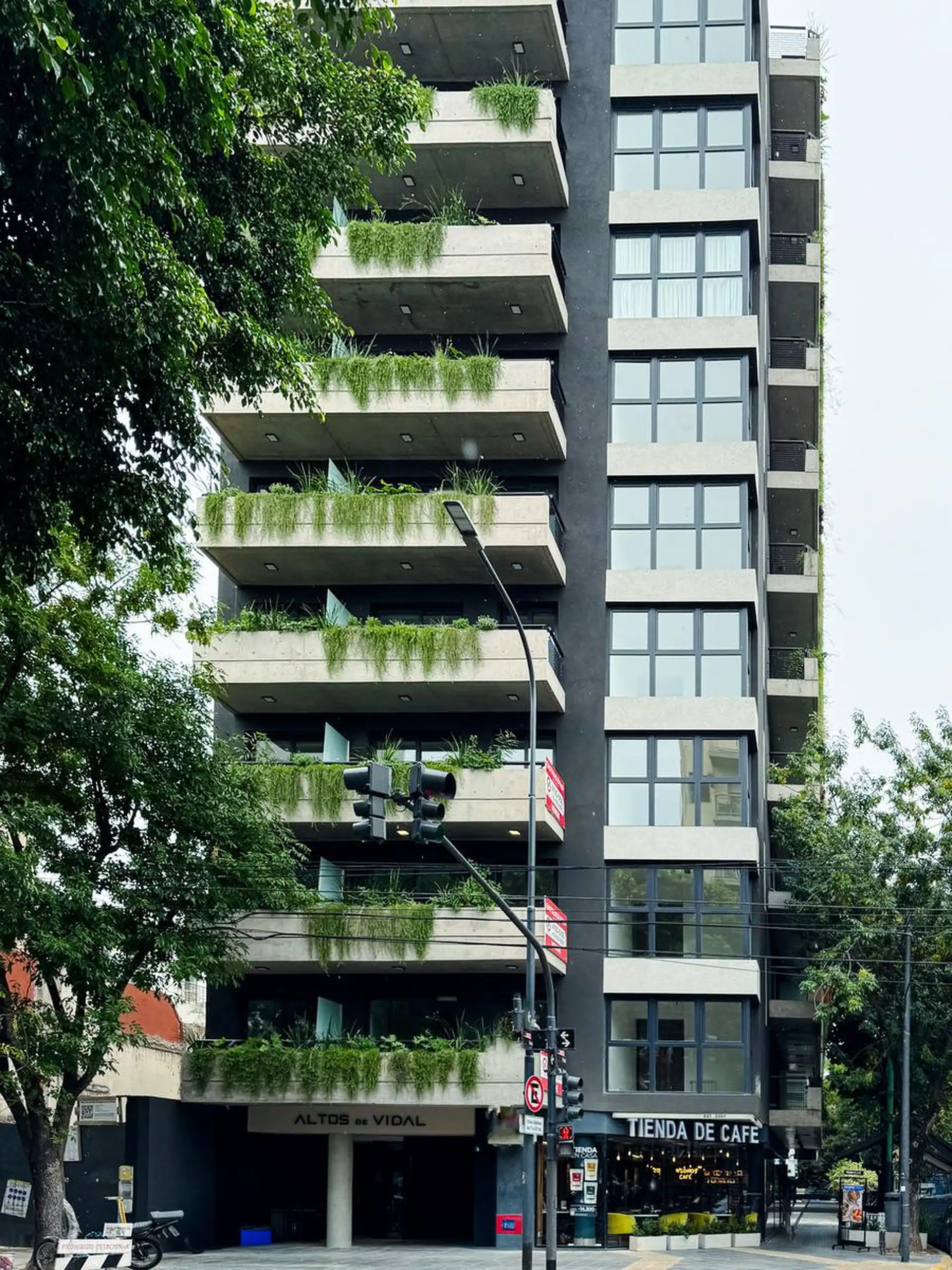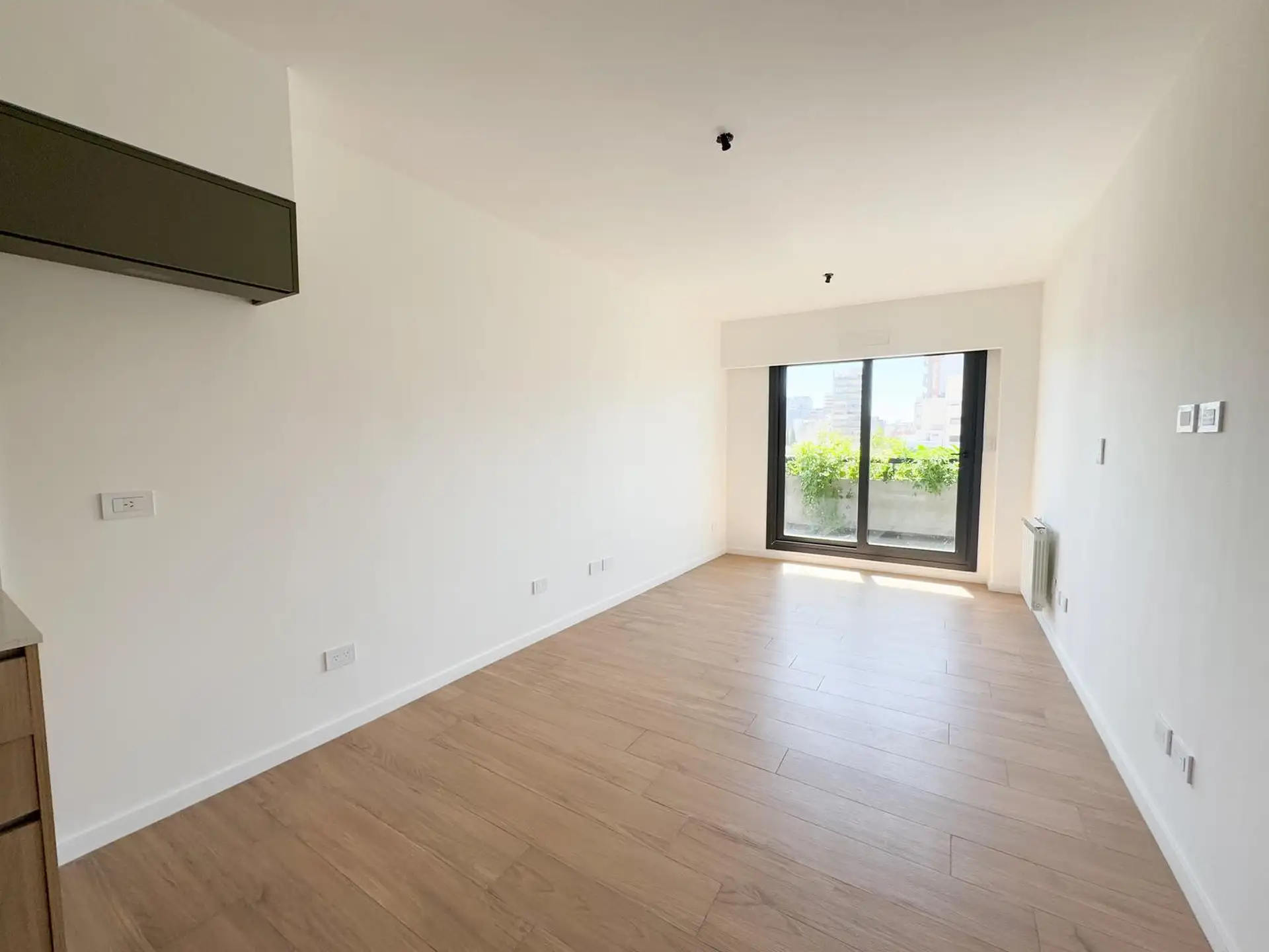 Studio apartment in Altos de Vidal, a residential development on the border of Nuñez and Belgrano. The unit has a private balcony and a private rooftop terrace with an uncovered pool, deck and grill. The kitchen includes a countertop and sink, under-counter cabinets and wall cabinets in melamine, plus a cooktop and electric oven; there is PVC joinery with double-glazed laminated glass, pre-installation for split air-conditioning (hot/cold), and central electric boiler heating (PEISA) with radiat