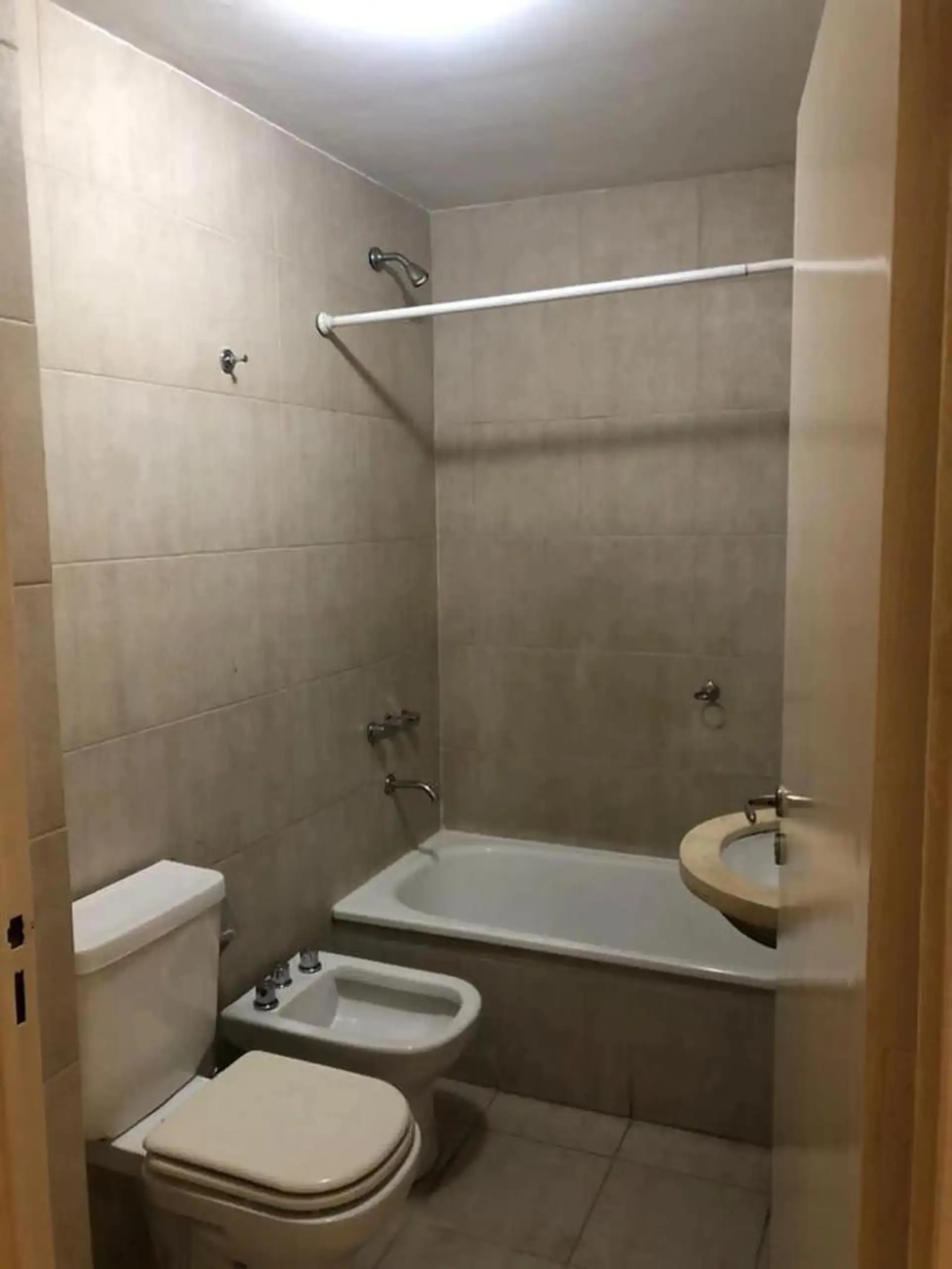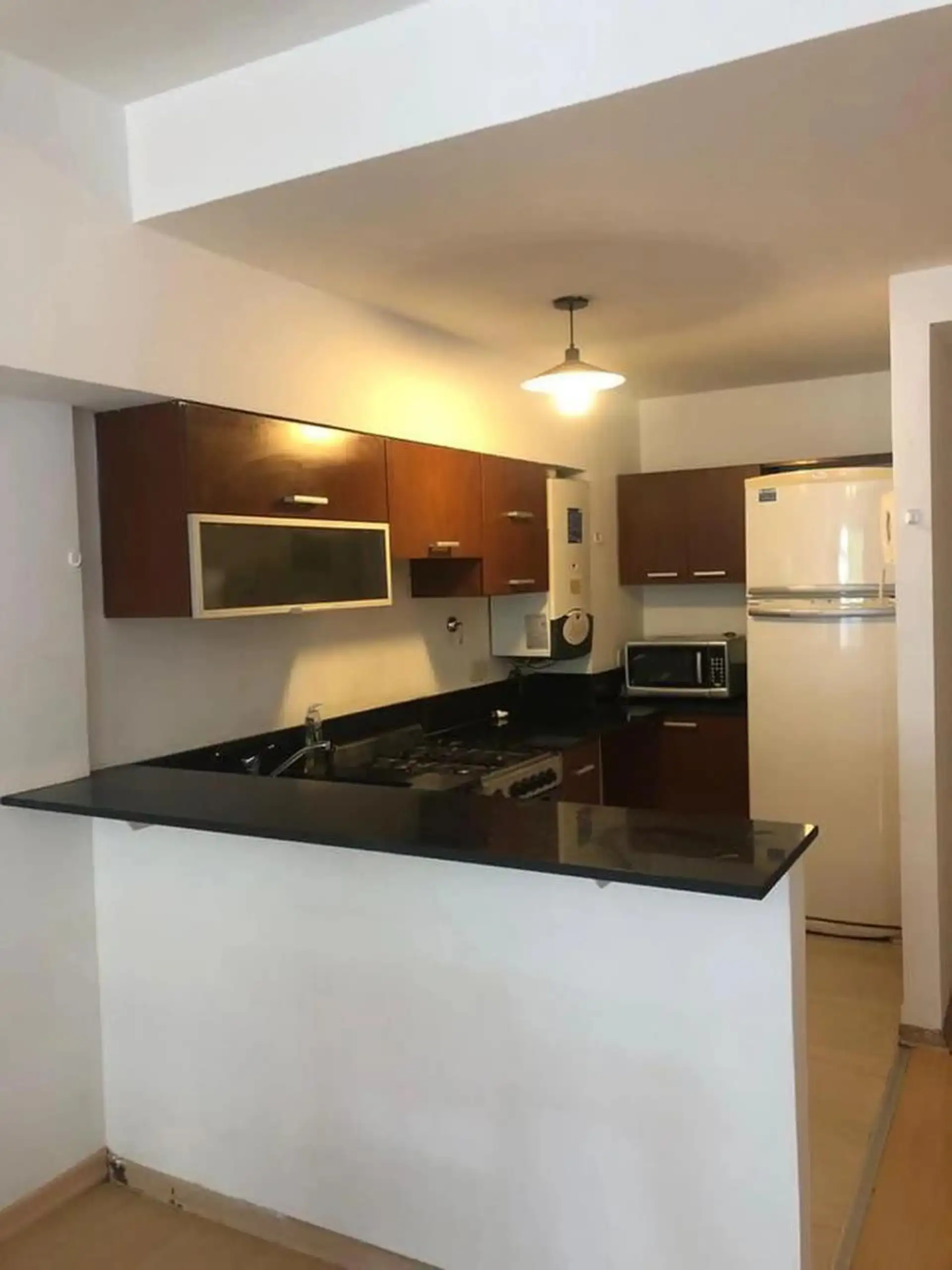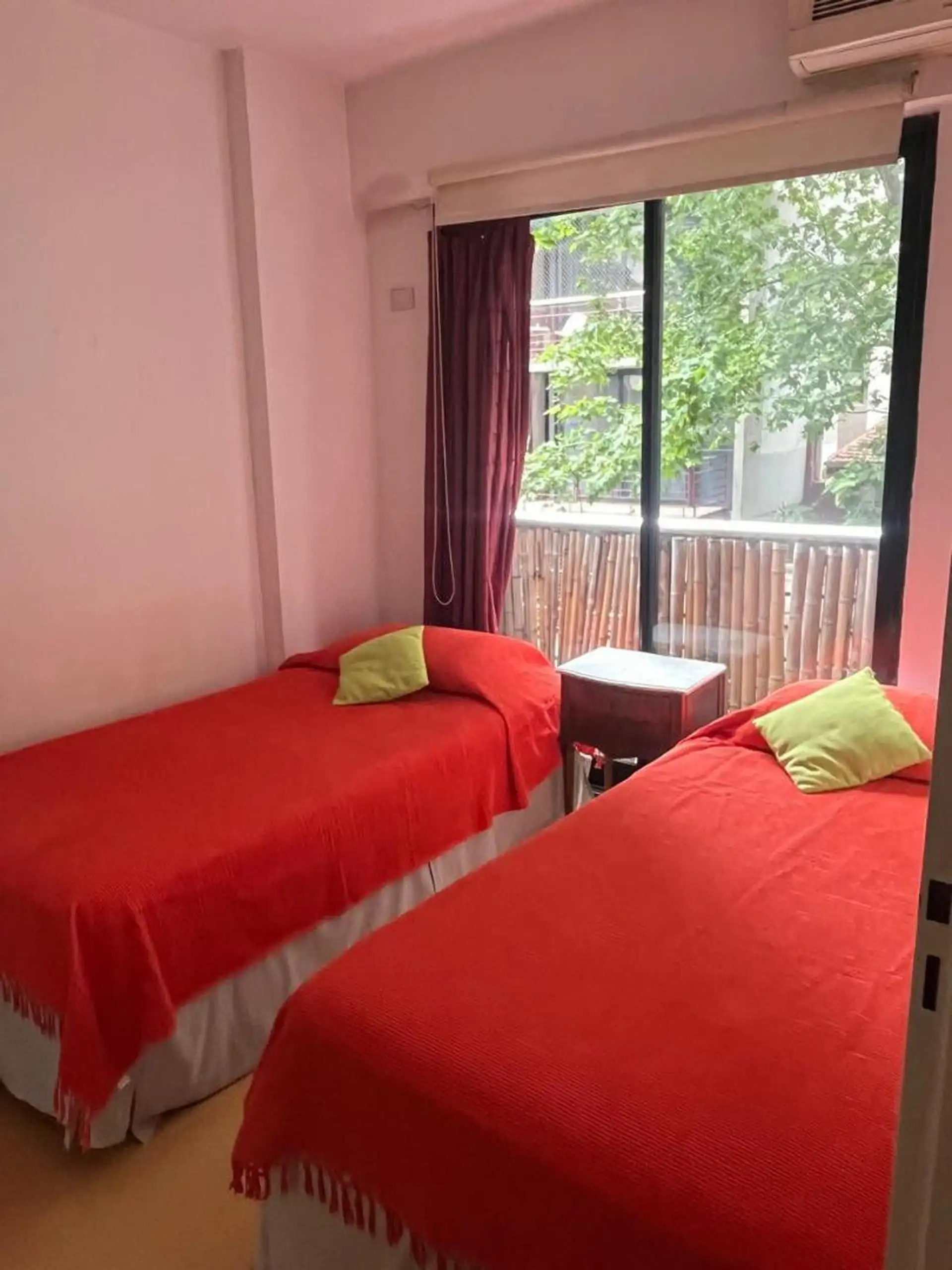 Front-facing studio apartment for short-term rent in Belgrano. Fully furnished and equipped, with a living-dining area, balcony, two single beds, mirrored wardrobes, and a full bathroom with a bathtub. Kitchen includes a fridge with freezer and a microwave. The unit has air conditioning and heating, TV, WiFi, and a built-in safe. Building amenities include a rooftop pool, solarium, gym, grill area, meeting room with table and chairs, and laundry with a washer and dryer. Monthly costs include ABL