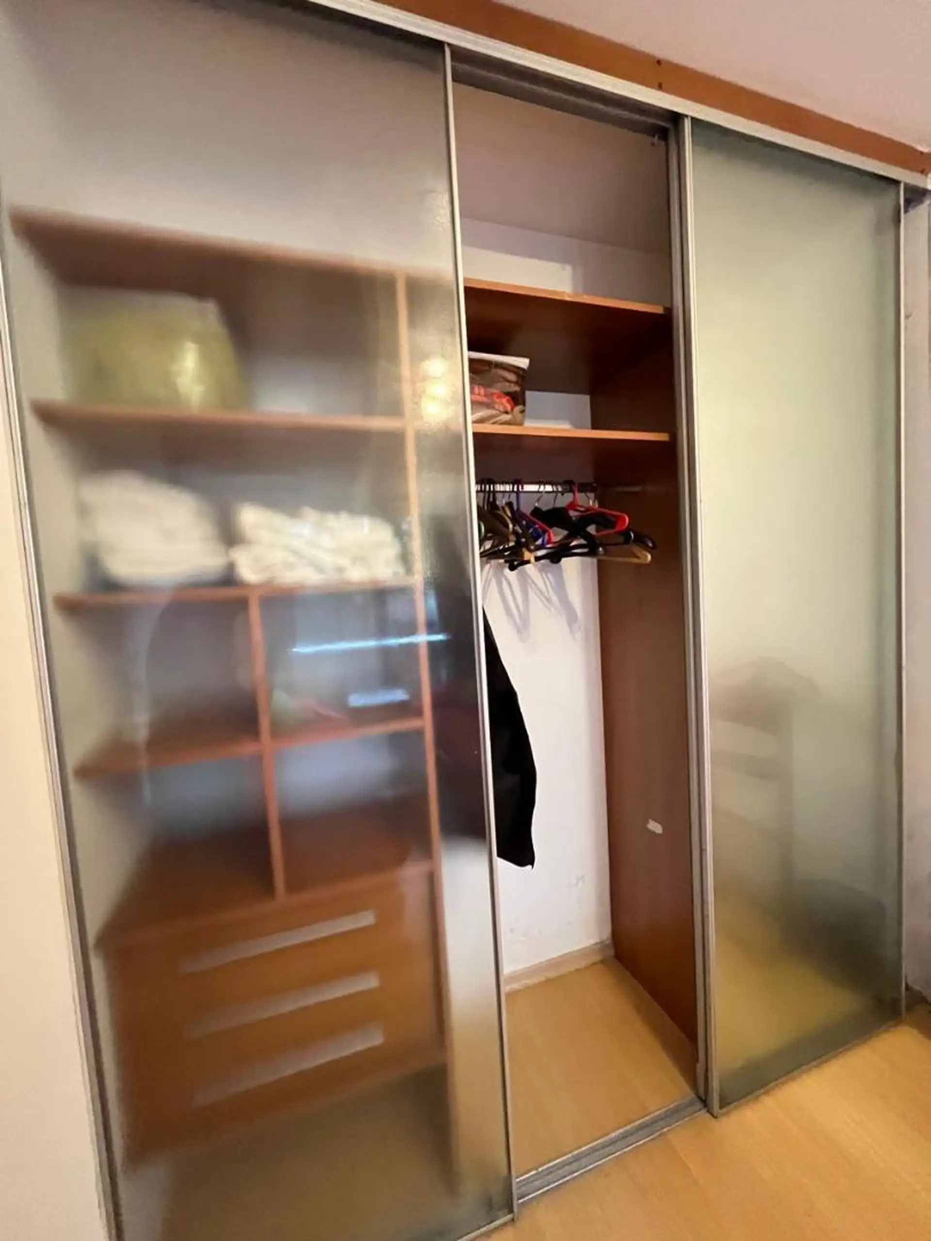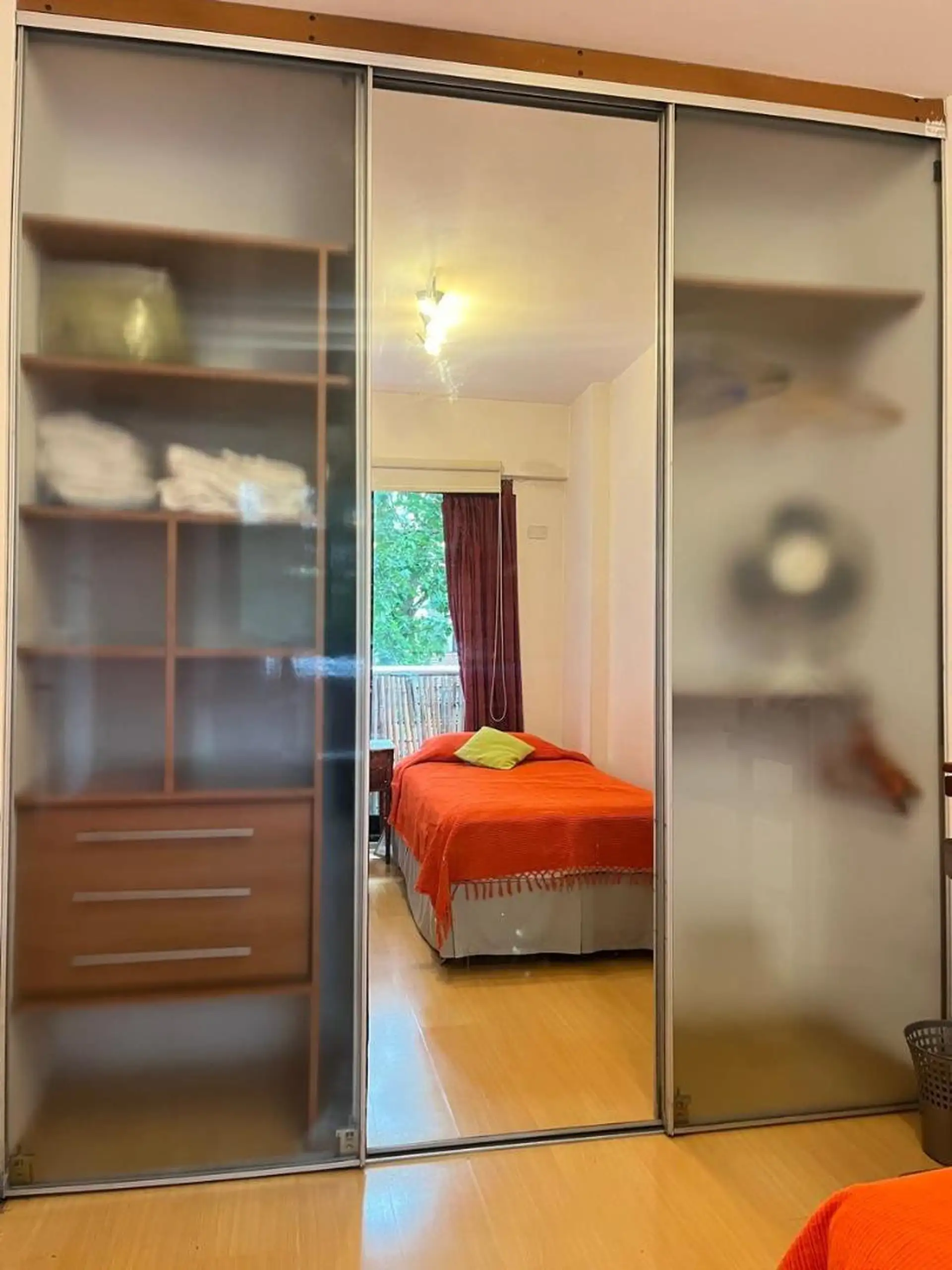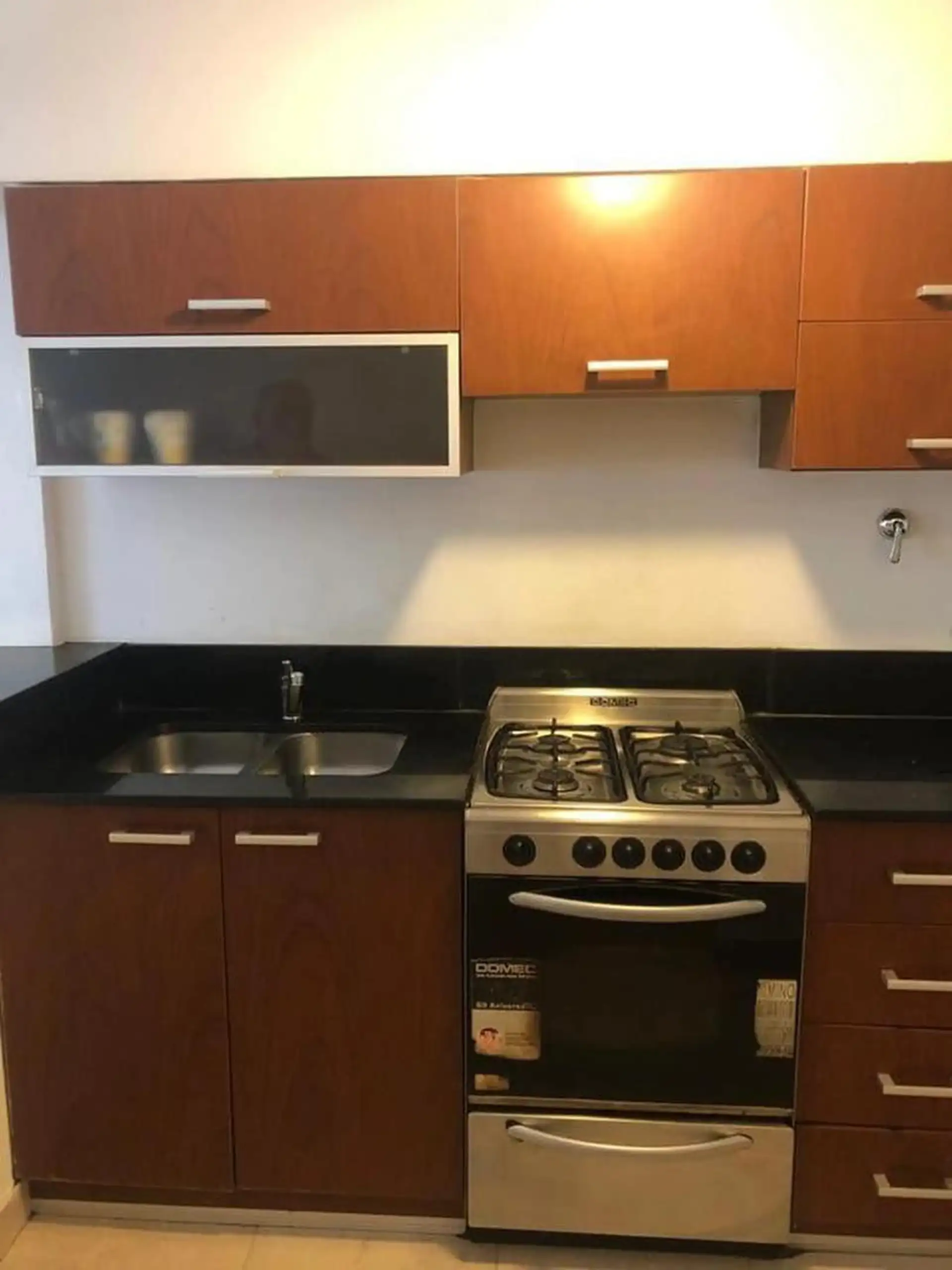 Front-facing studio apartment for short-term rent in Belgrano. Fully furnished and equipped, with a living-dining area, balcony, two single beds, mirrored wardrobes, and a full bathroom with a bathtub. Kitchen includes a fridge with freezer and a microwave. The unit has air conditioning and heating, TV, WiFi, and a built-in safe. Building amenities include a rooftop pool, solarium, gym, grill area, meeting room with table and chairs, and laundry with a washer and dryer. Monthly costs include ABL