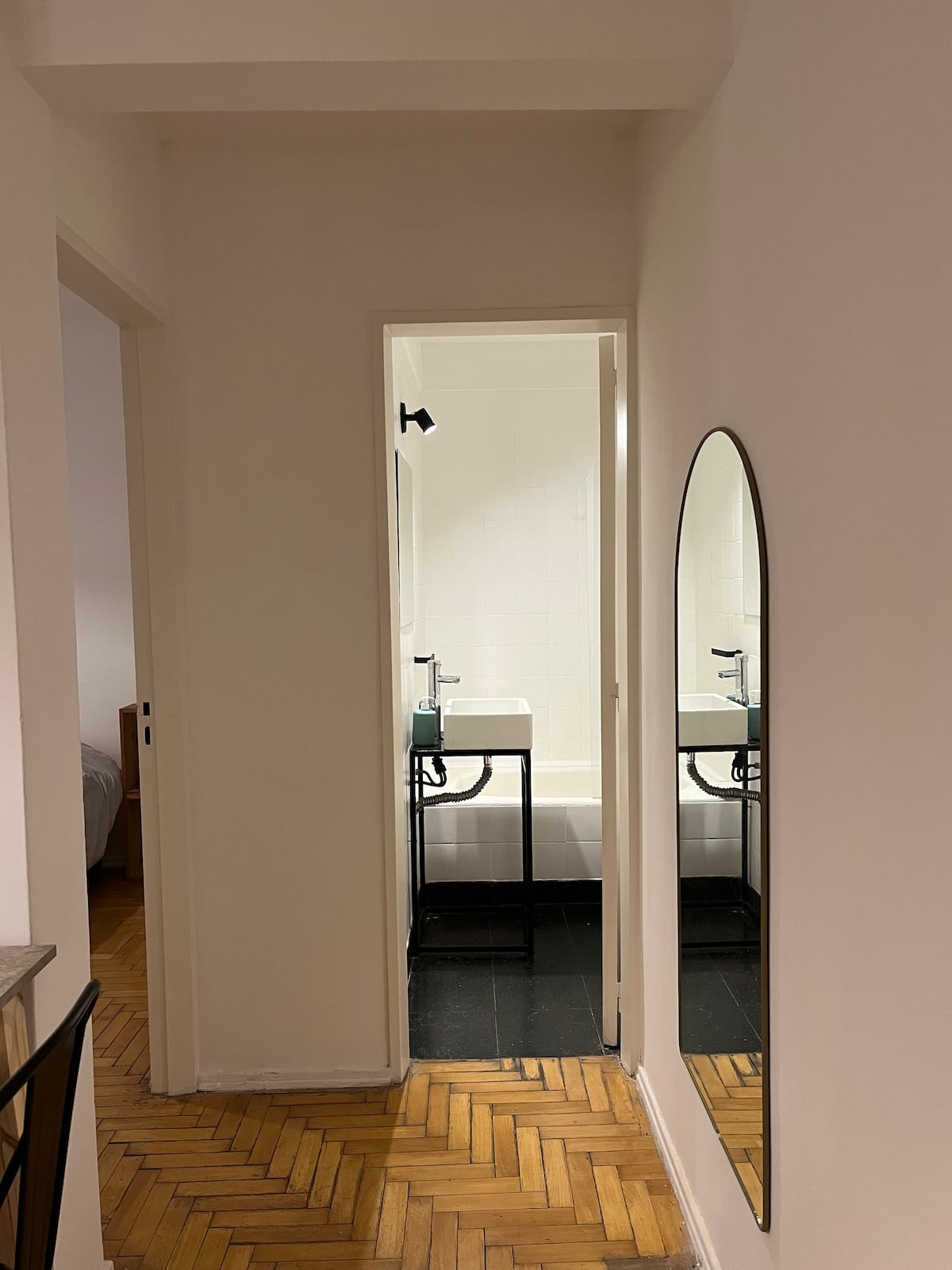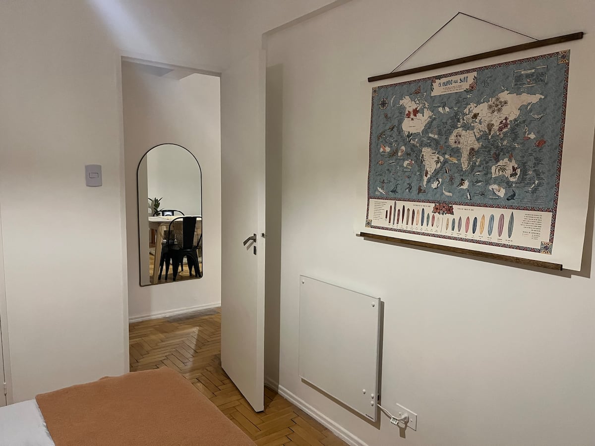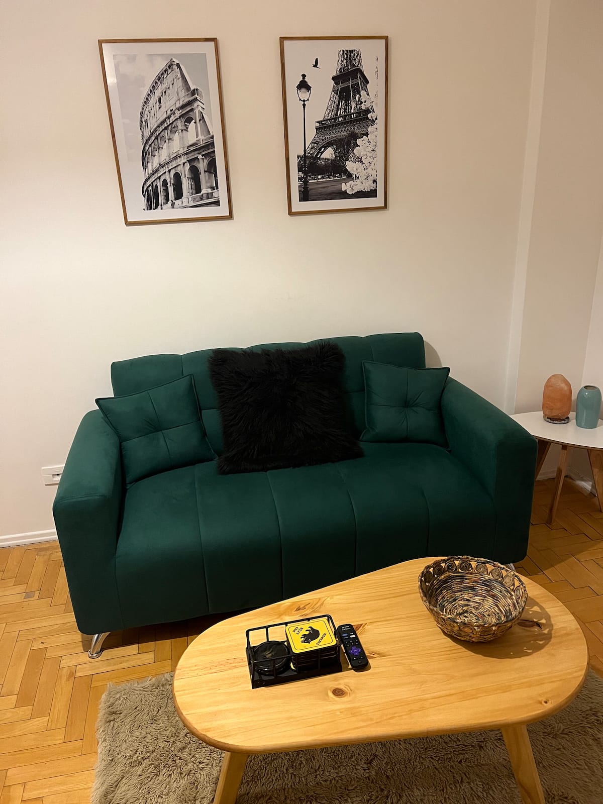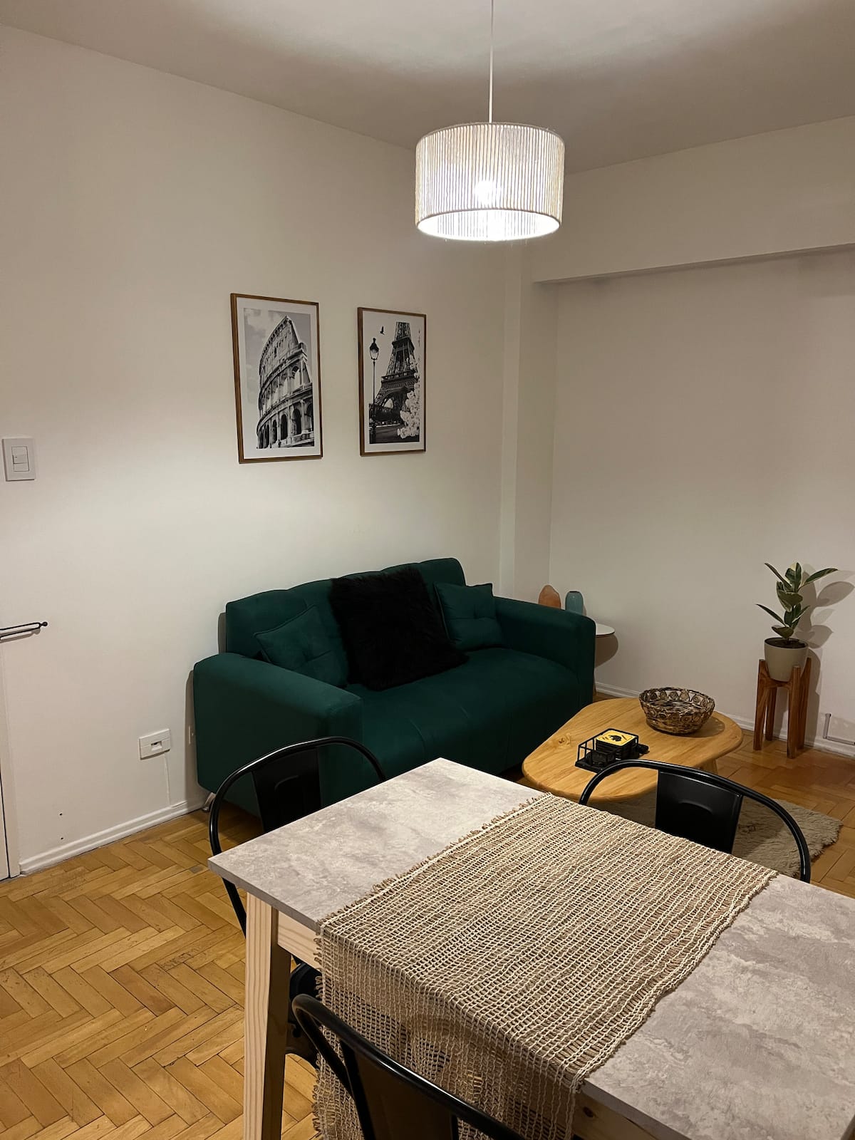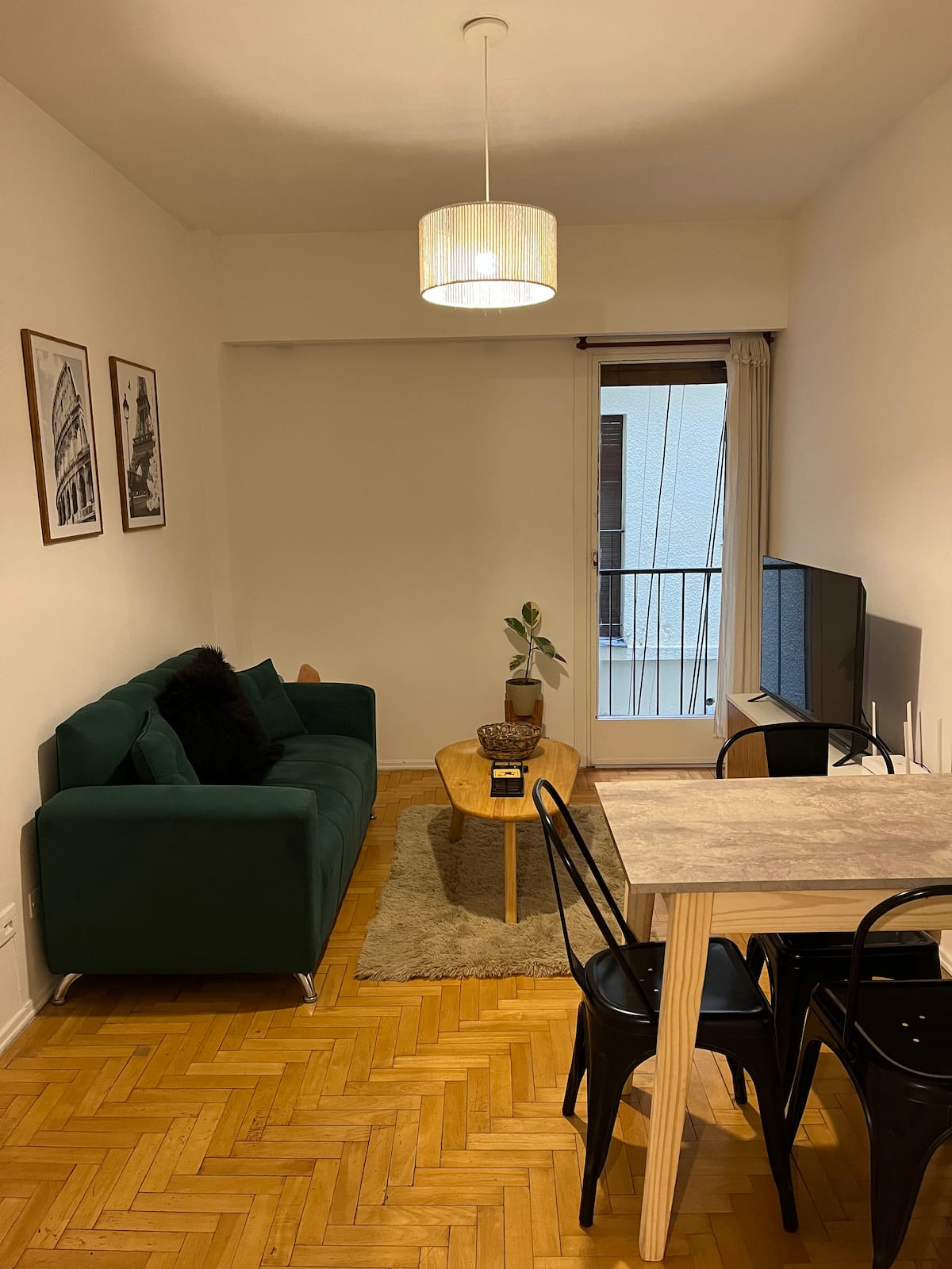 Furnished two-room apartment in Belgrano on the 2nd floor with elevator. It includes a living room, kitchen, laundry room, full bathroom and a bedroom with closet, plus a storage room in the basement. The building has a terrace and security cameras. Located 200 metres from Cabildo and Subte Line D, with shops, squares, schools and restaurants nearby.