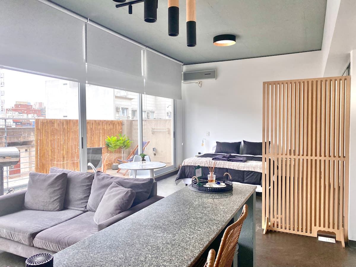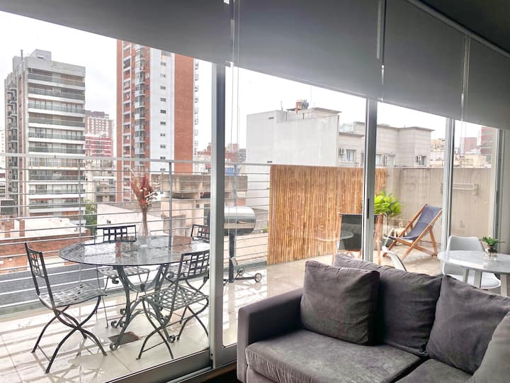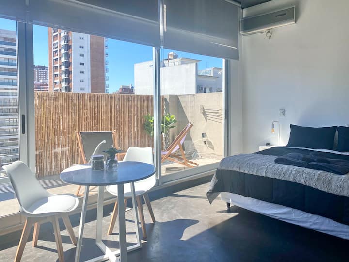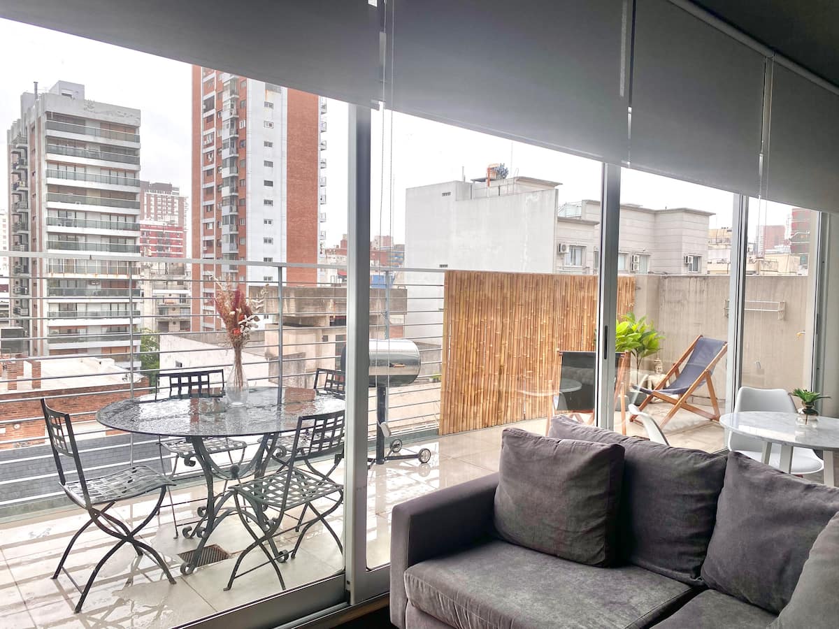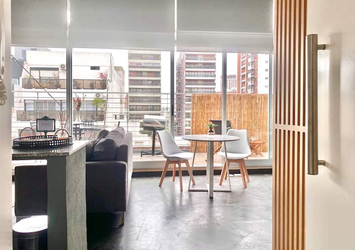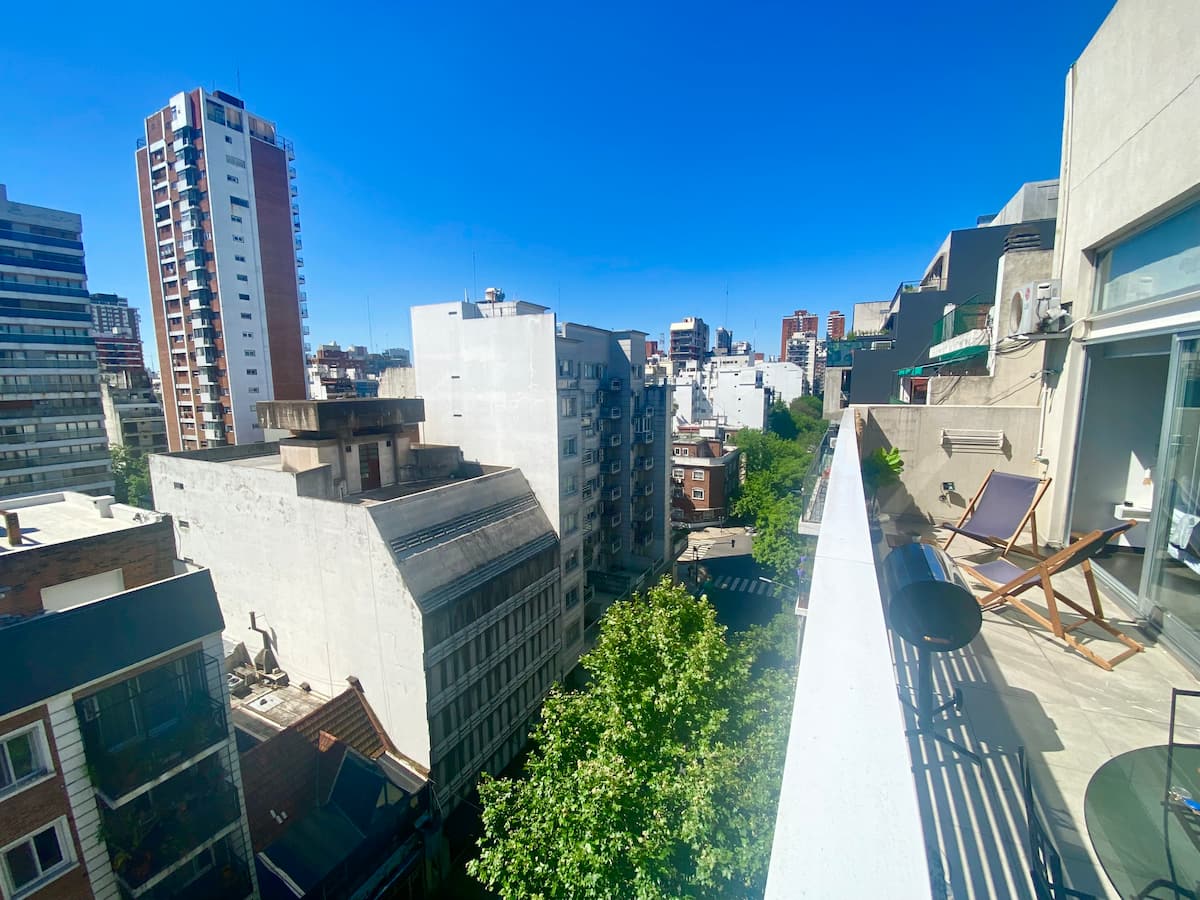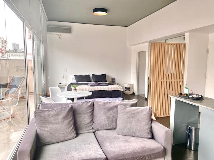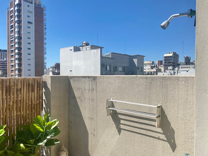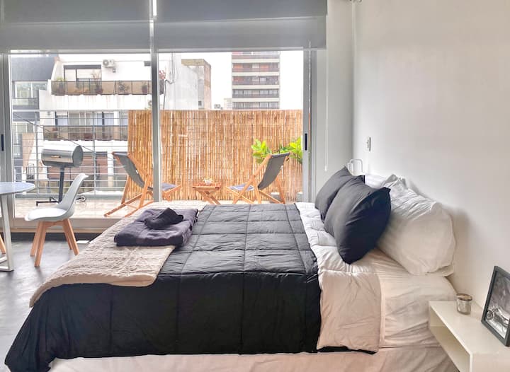 Studio apartment in Belgrano with several integrated areas and a large balcony. The unit is fully equipped for stays, with furnishings in the kitchen and main room. Access to the building’s common areas is included.