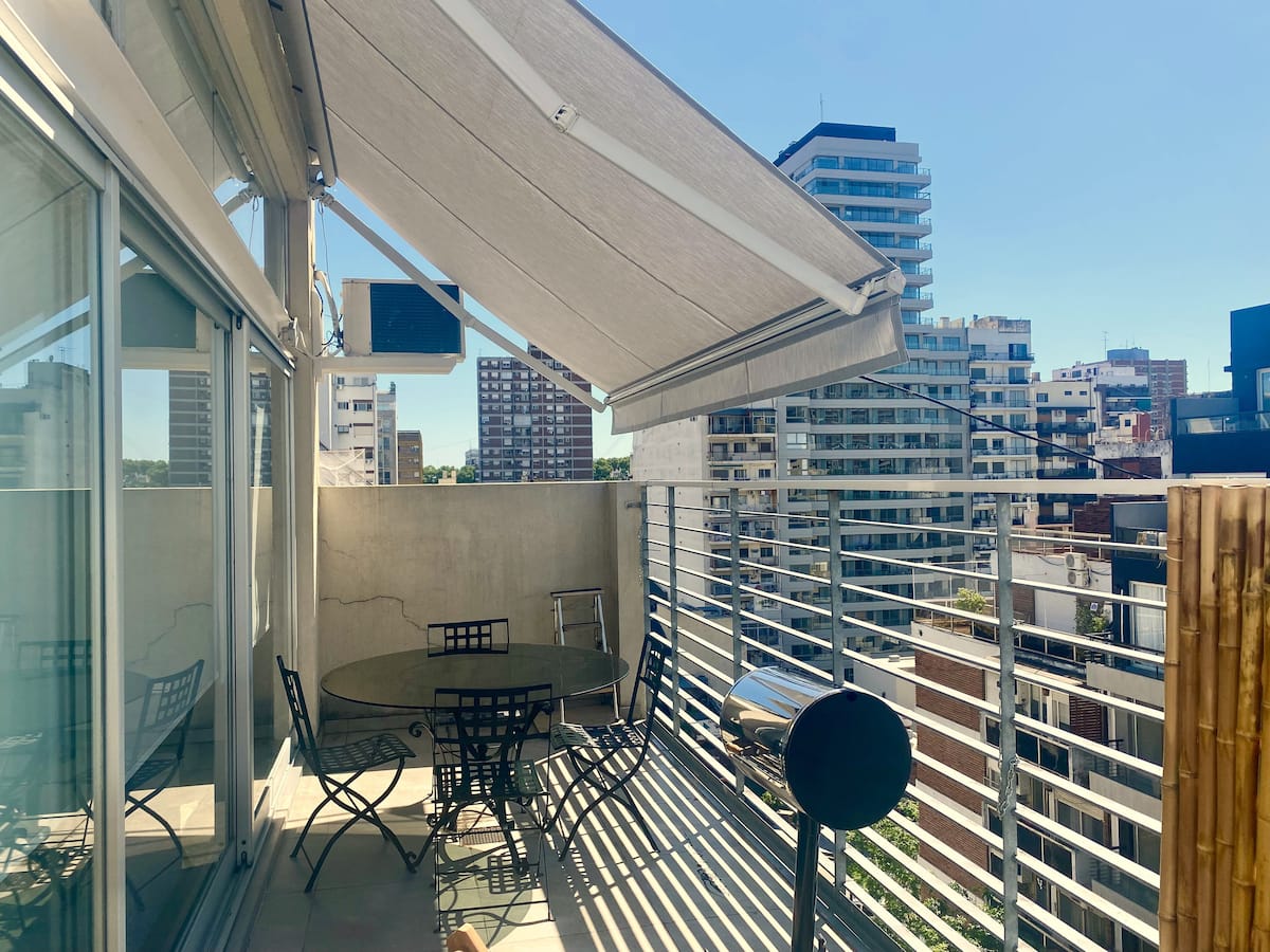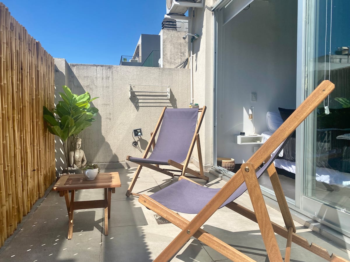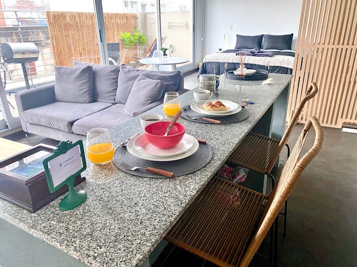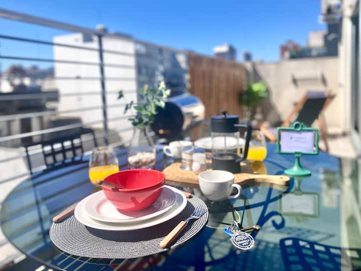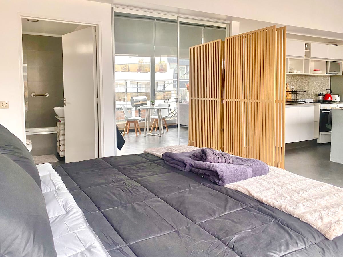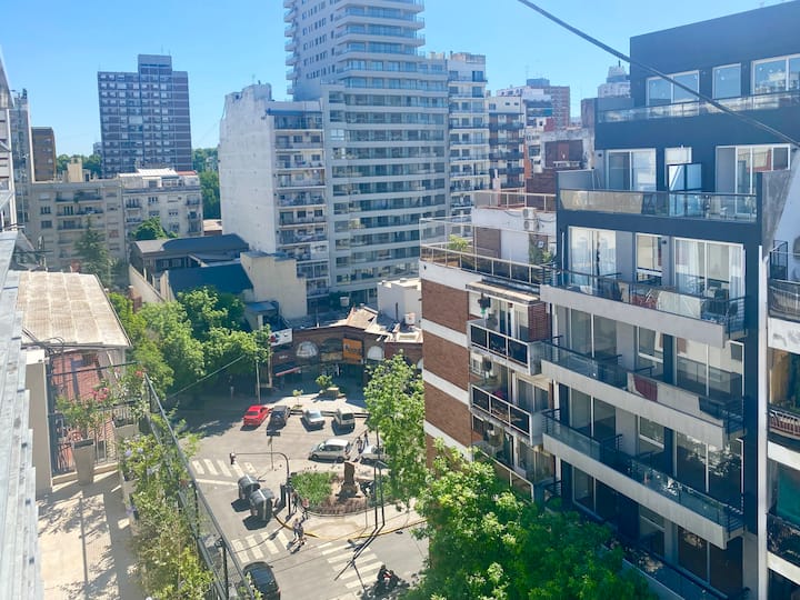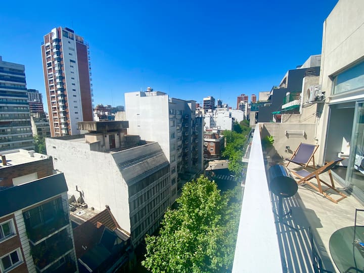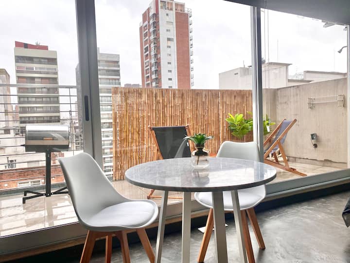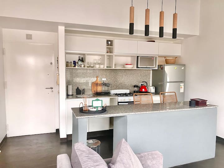 Studio apartment in Belgrano with several integrated areas and a large balcony. The unit is fully equipped for stays, with furnishings in the kitchen and main room. Access to the building’s common areas is included.