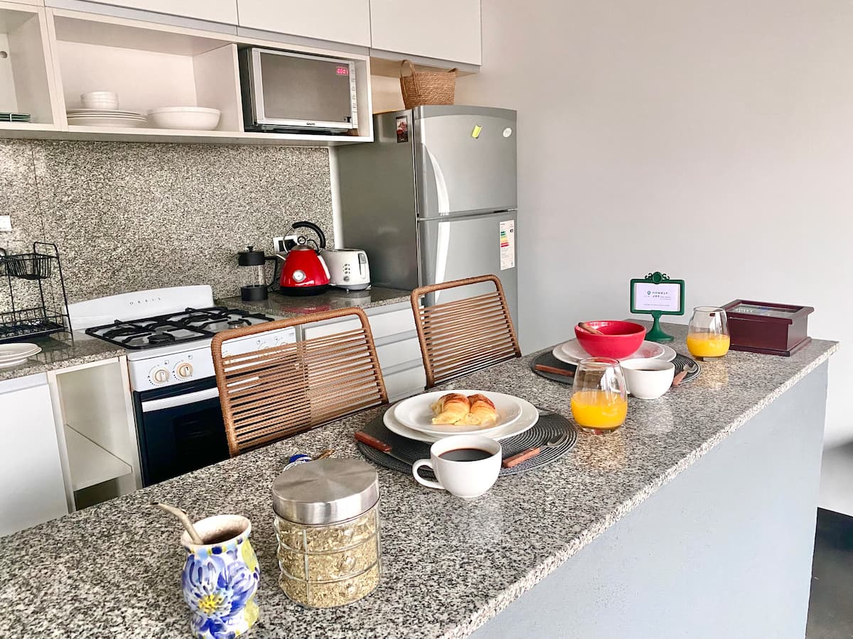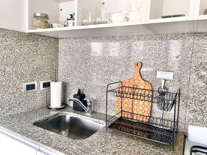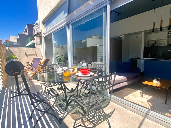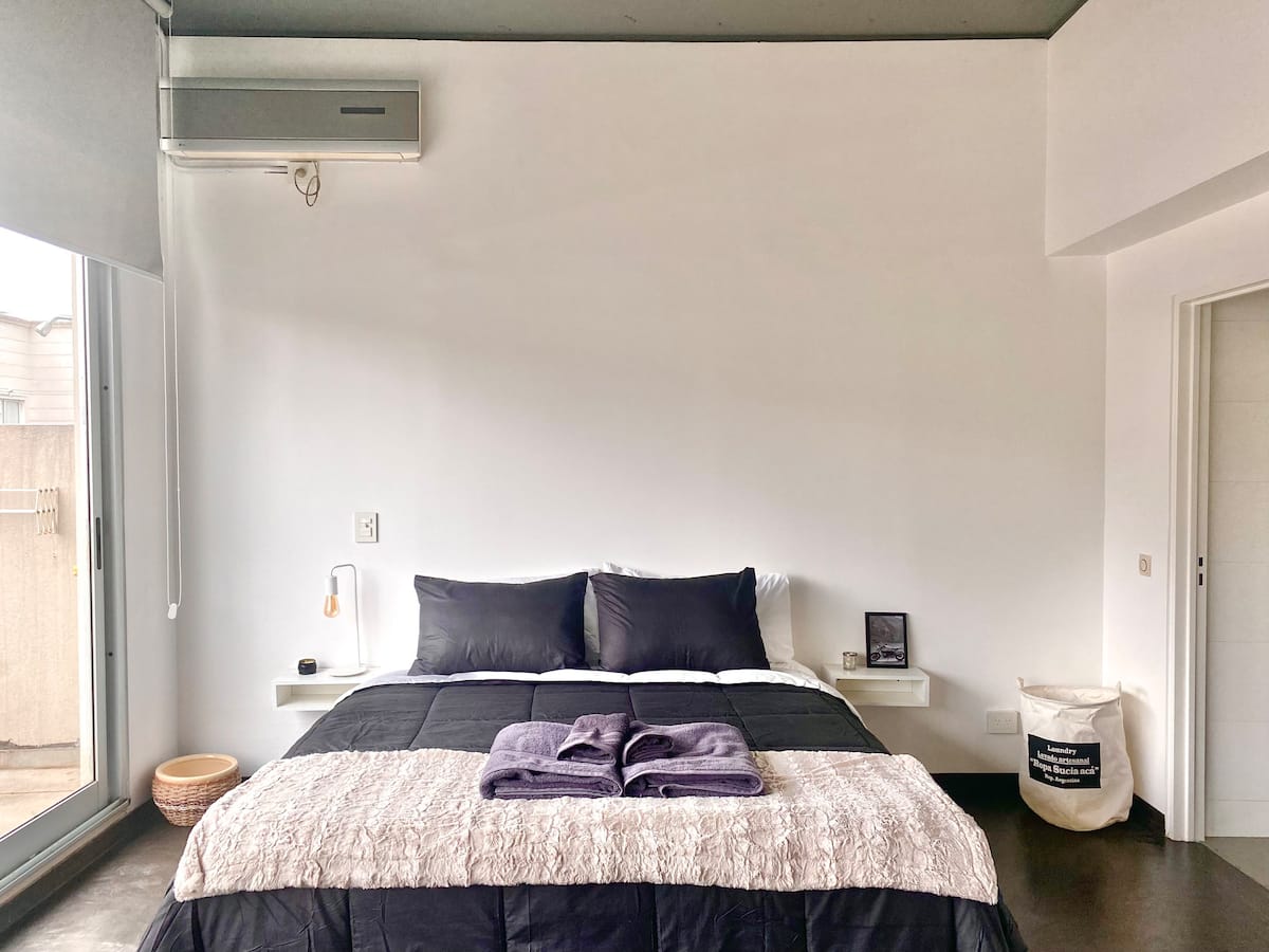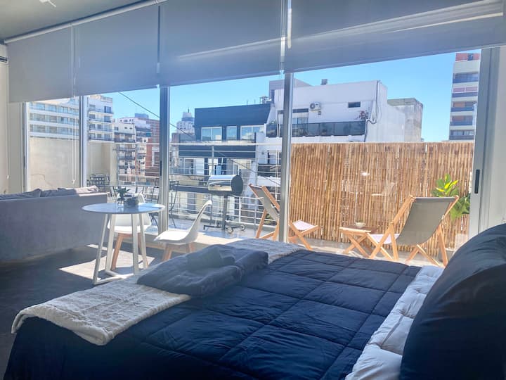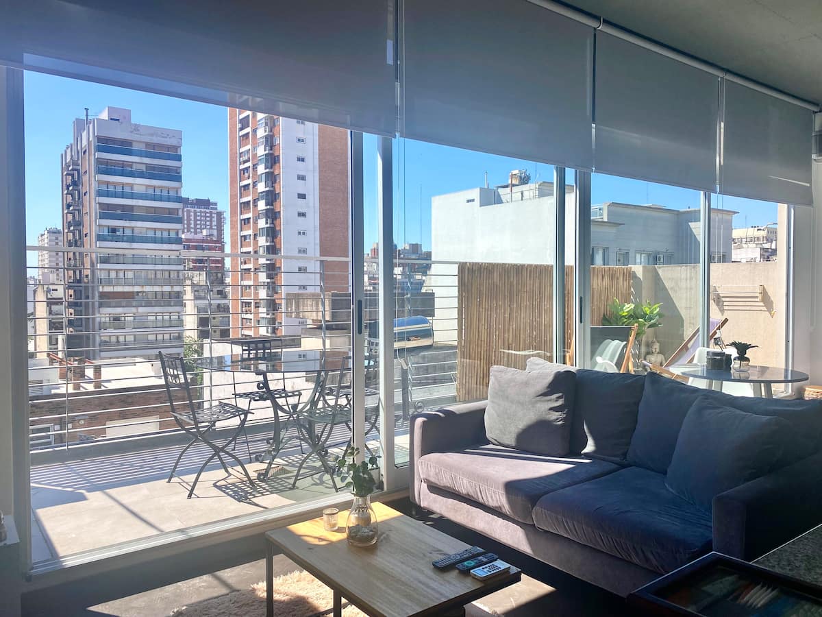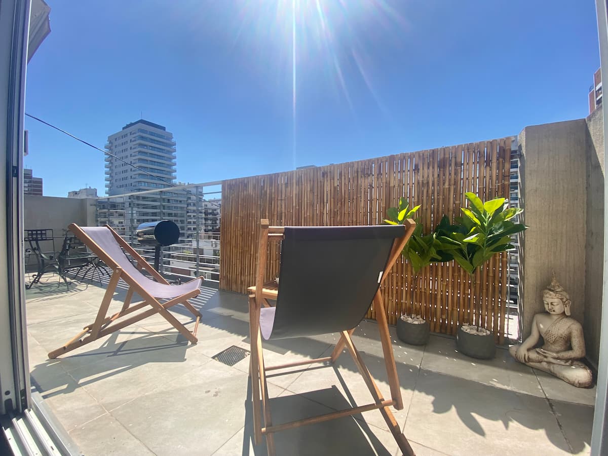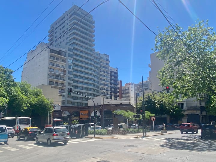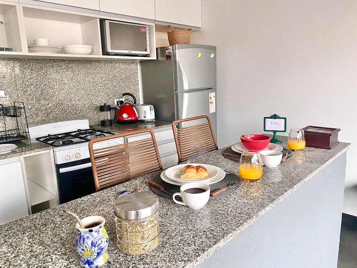 Studio apartment in Belgrano with several integrated areas and a large balcony. The unit is fully equipped for stays, with furnishings in the kitchen and main room. Access to the building’s common areas is included.