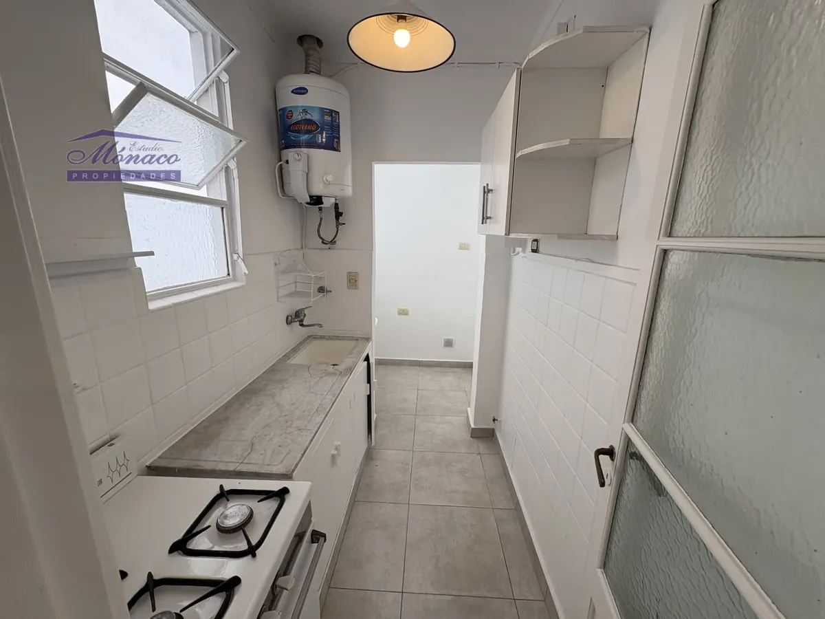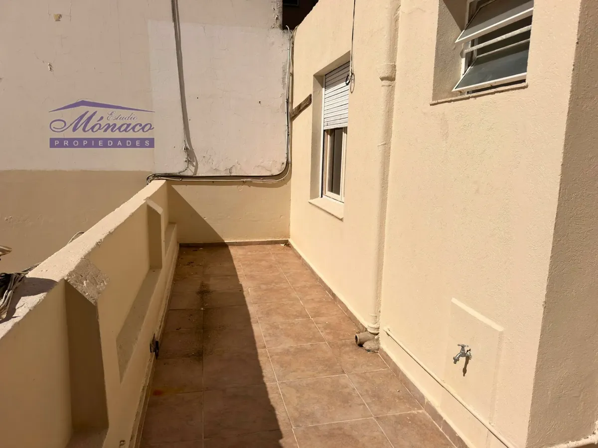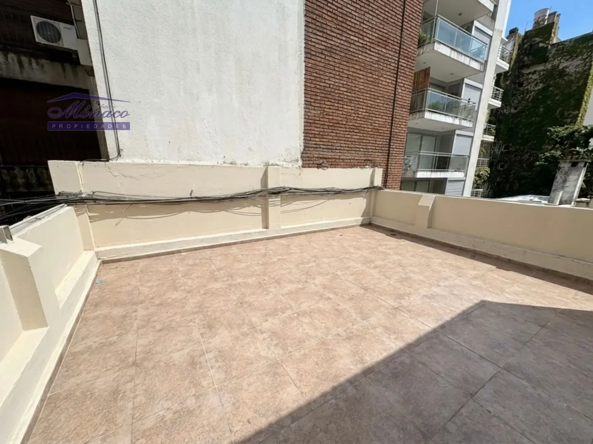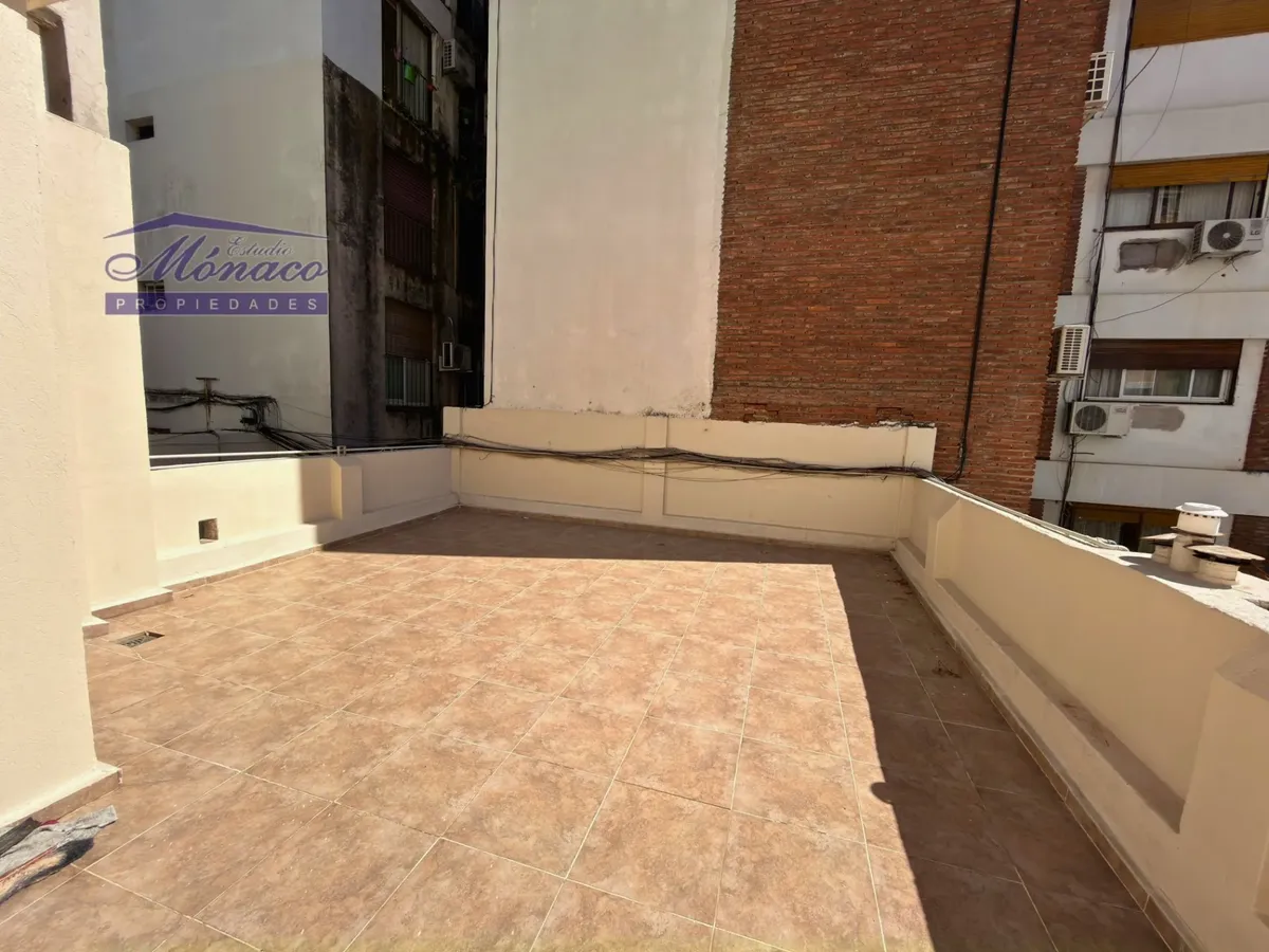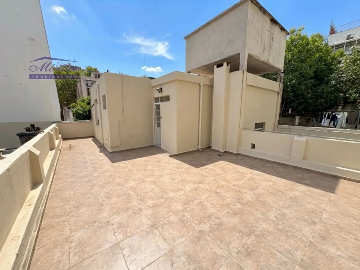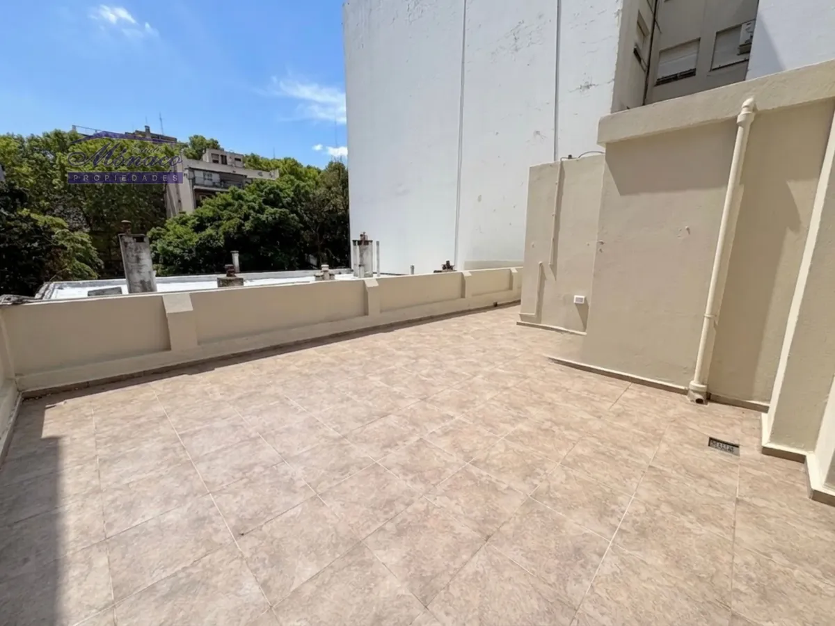 Two-room apartment on the courtyard-facing side (contrafrente) in Belgrano, with exclusive use of a large private terrace. It has a small living-dining area, a separate kitchen with laundry area, and a bedroom with a fitted wardrobe. It is on the 3rd floor with stairs, and the listing notes proximity to Barrio Chino and Belgrano C station. Building fees are listed as approximately $115,000.