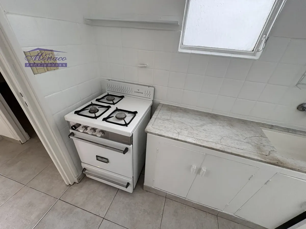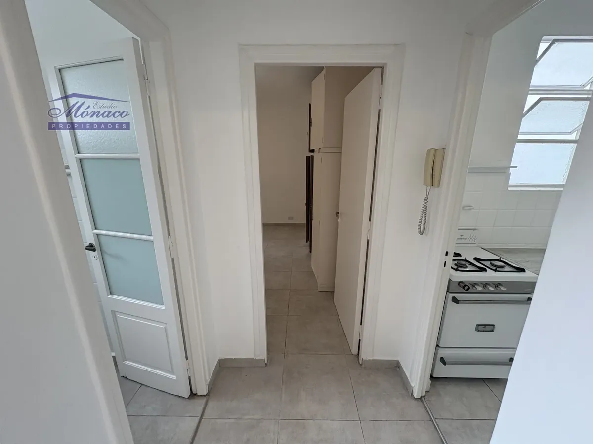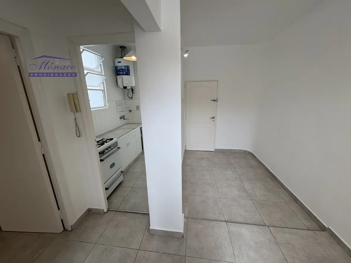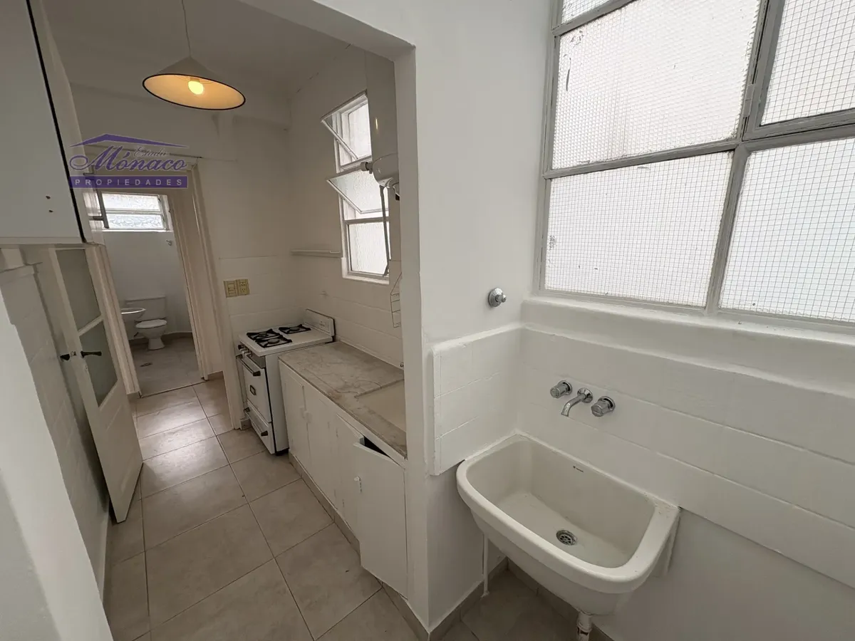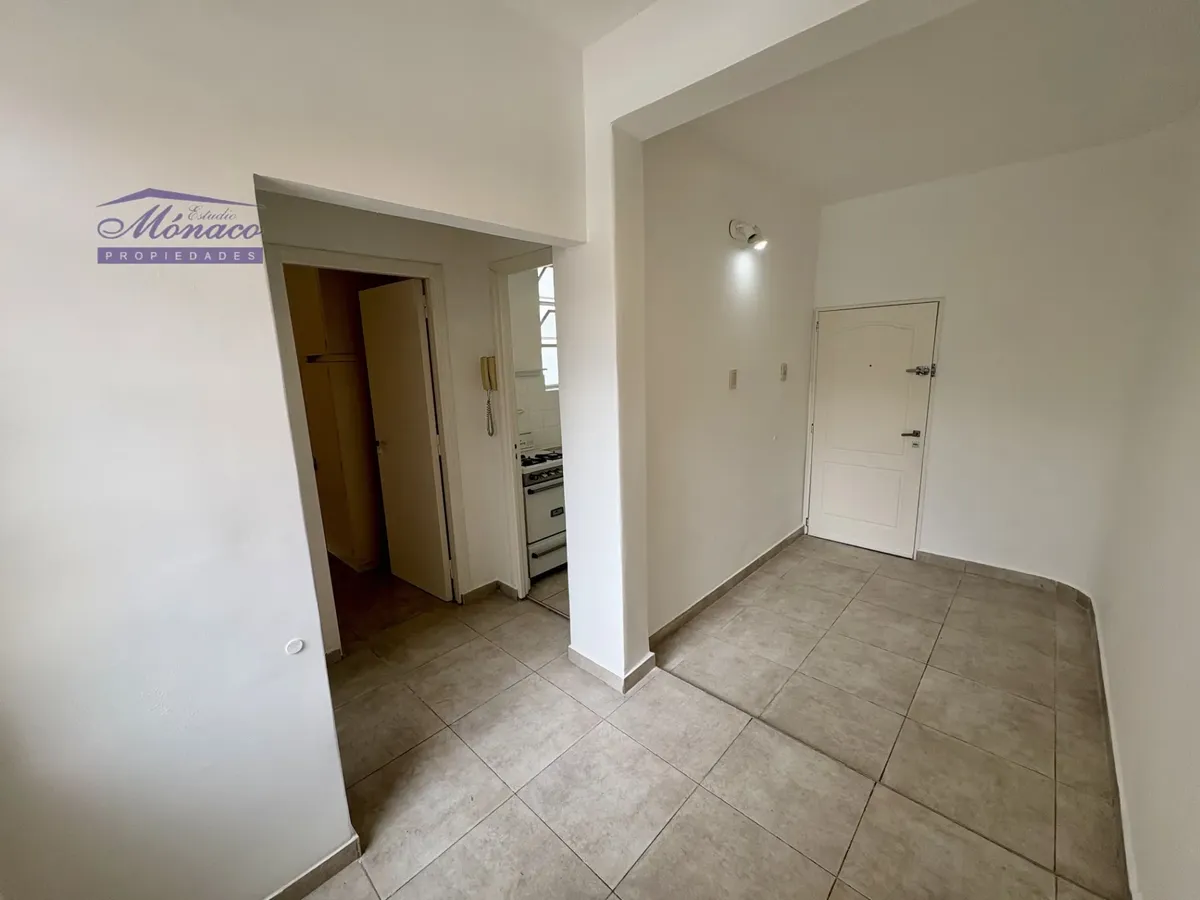 Two-room apartment on the courtyard-facing side (contrafrente) in Belgrano, with exclusive use of a large private terrace. It has a small living-dining area, a separate kitchen with laundry area, and a bedroom with a fitted wardrobe. It is on the 3rd floor with stairs, and the listing notes proximity to Barrio Chino and Belgrano C station. Building fees are listed as approximately $115,000.