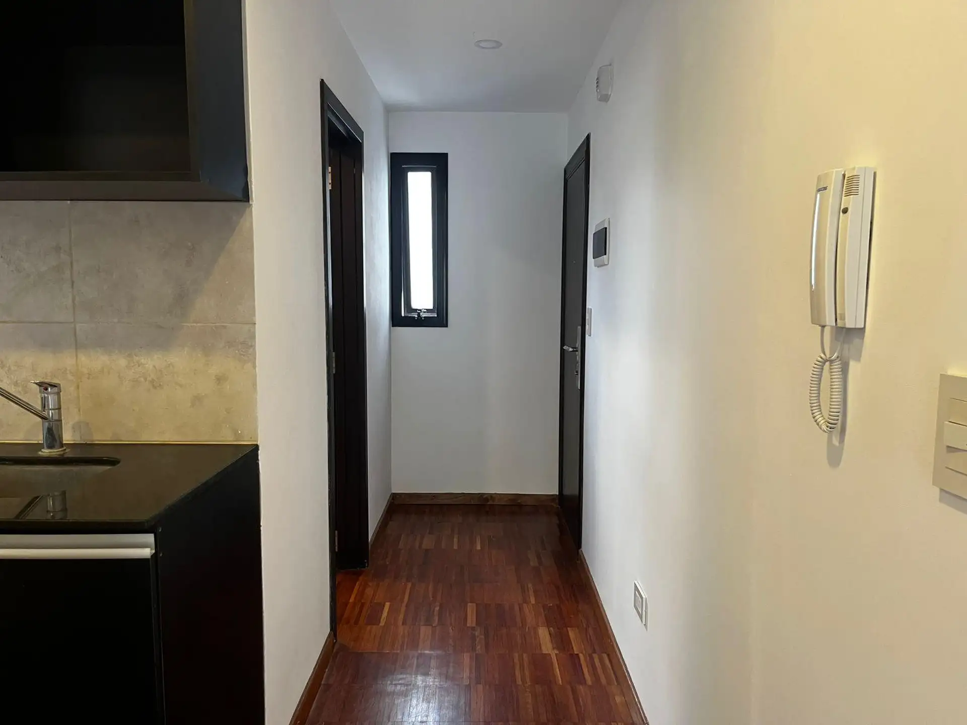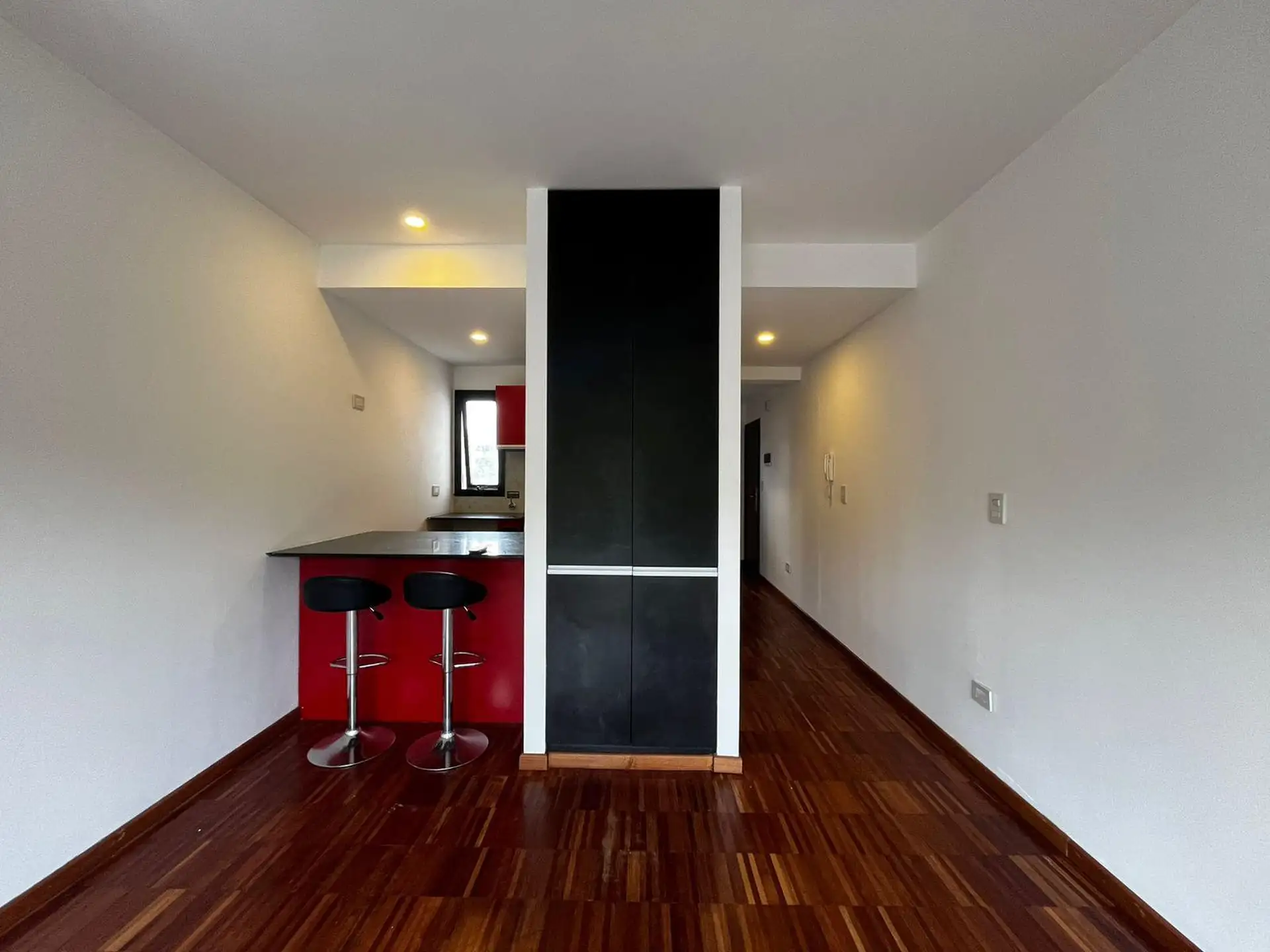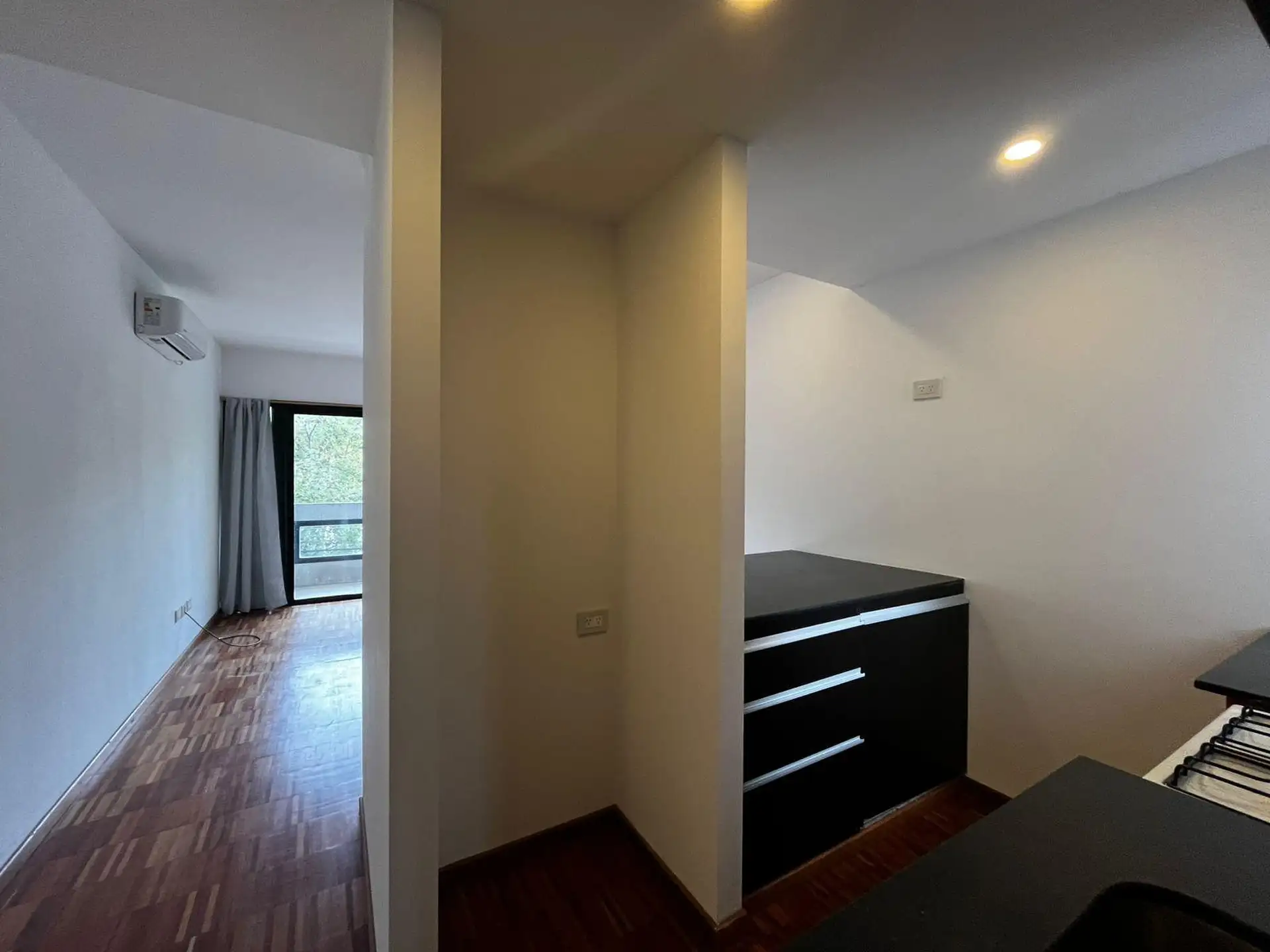 New studio apartment of 35 m². Wood flooring, built-in wardrobe, split air conditioning, and access to a balcony. Fully equipped kitchen with breakfast bar; full bathroom with ventilation; cross-ventilation.
