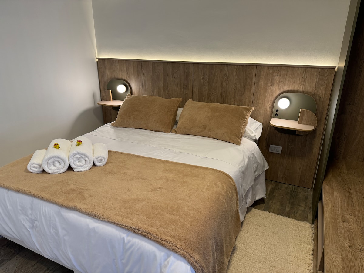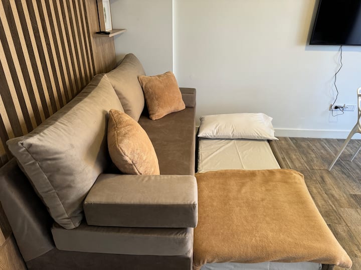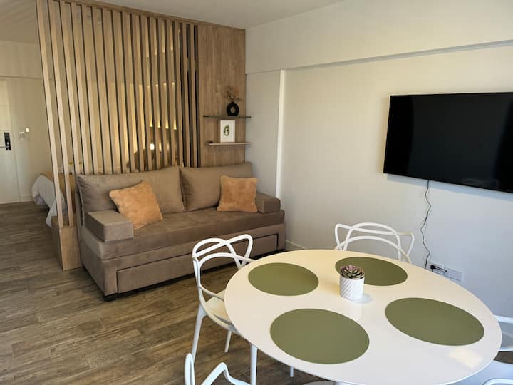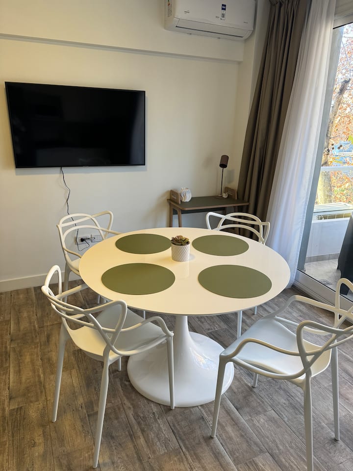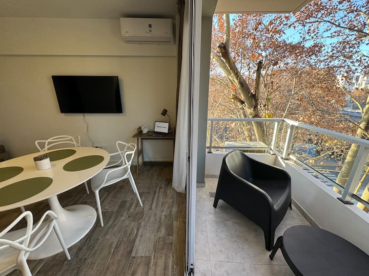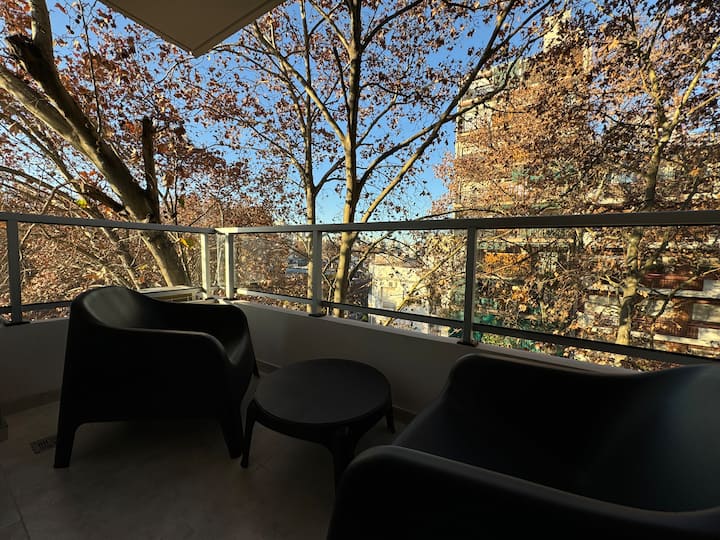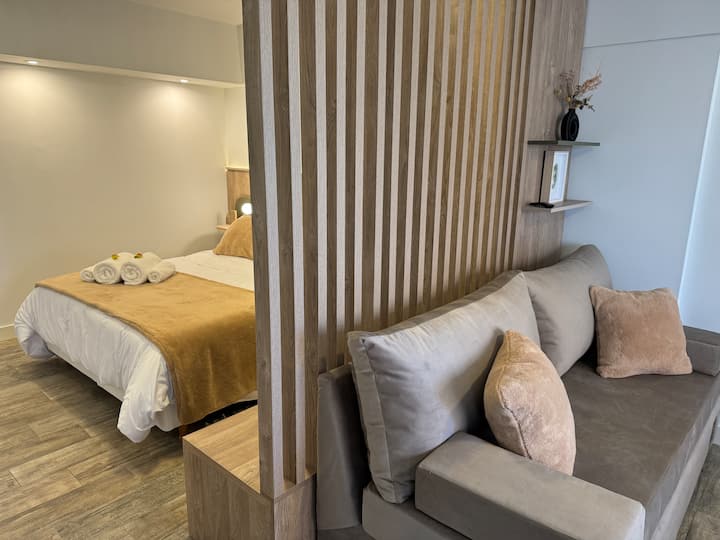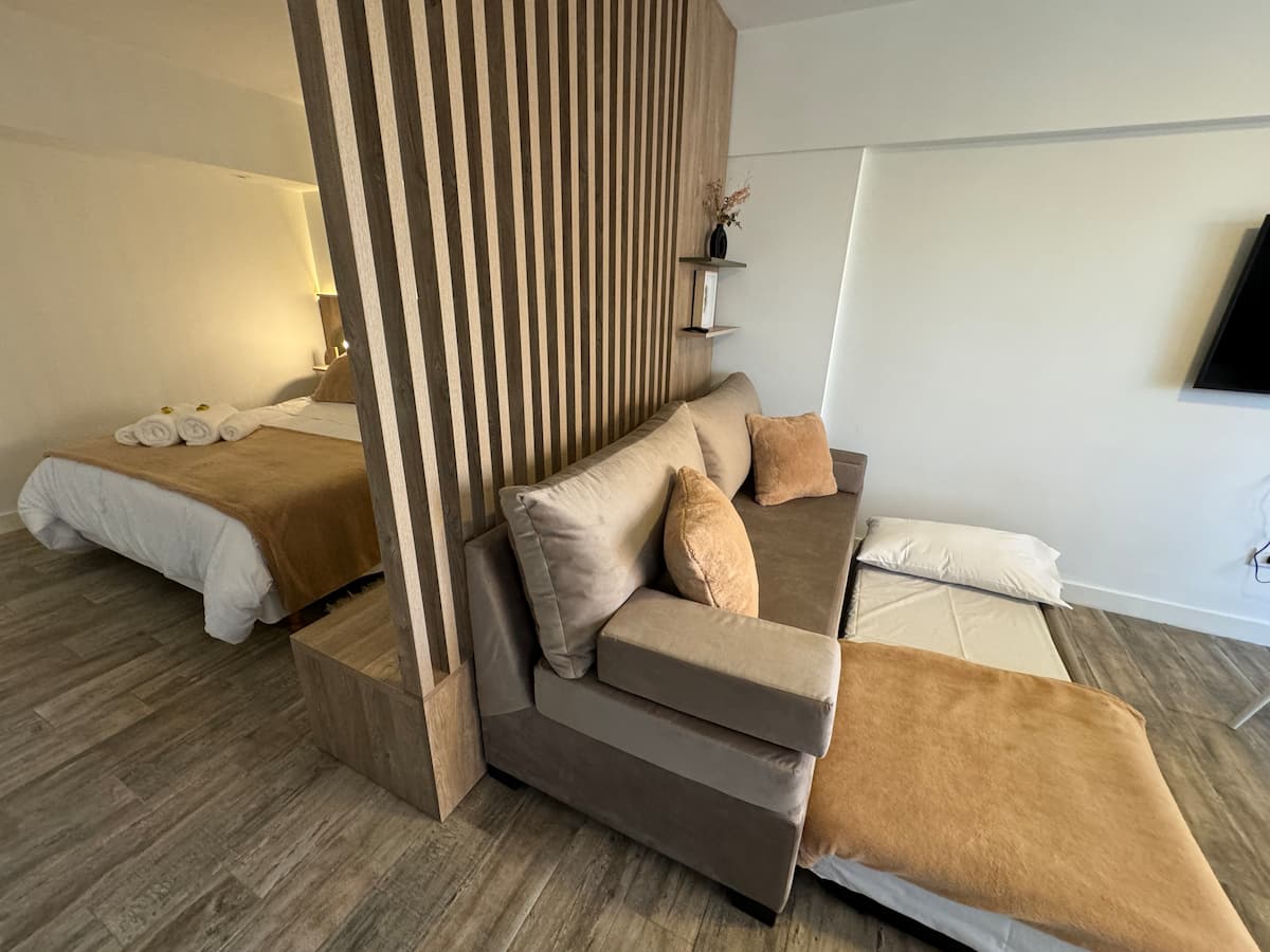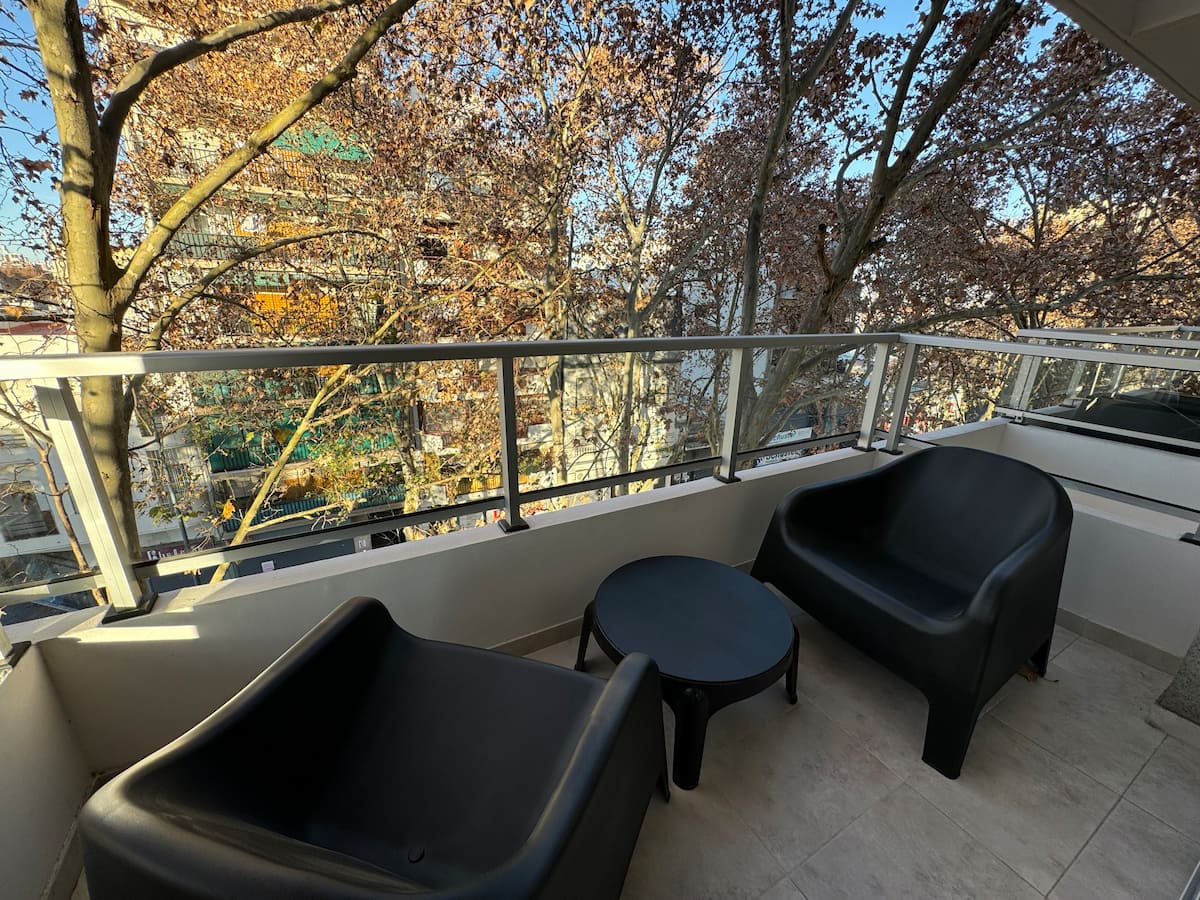 Brand new one-bedroom apartment in Boedo with a balcony. The unit has one room with a queen-size bed and an armchair used as two twin beds, plus a kitchenette and a bathroom. It is equipped for up to four people, with coworking and laundry on site.