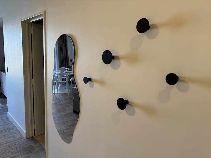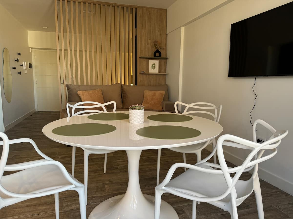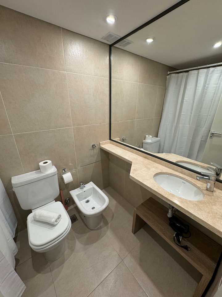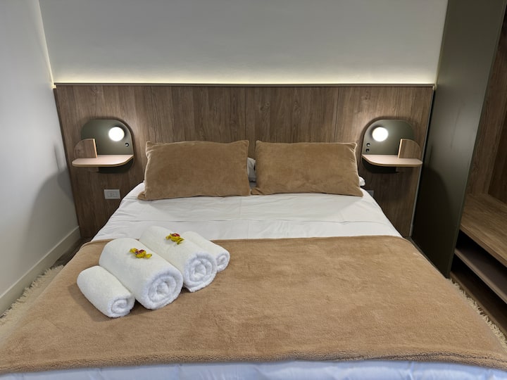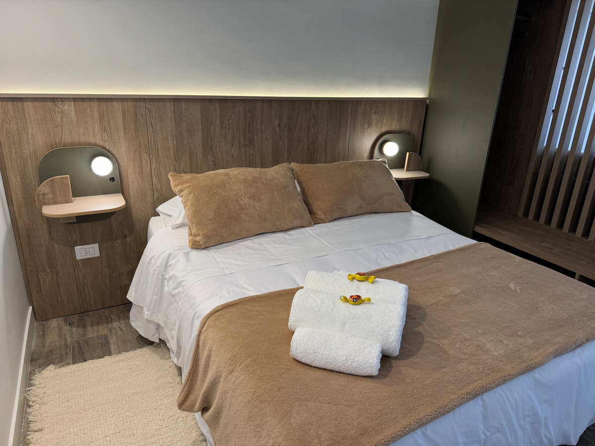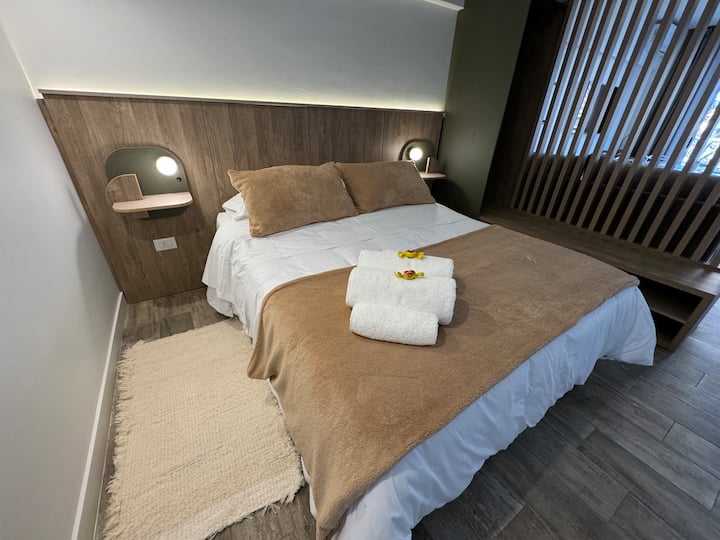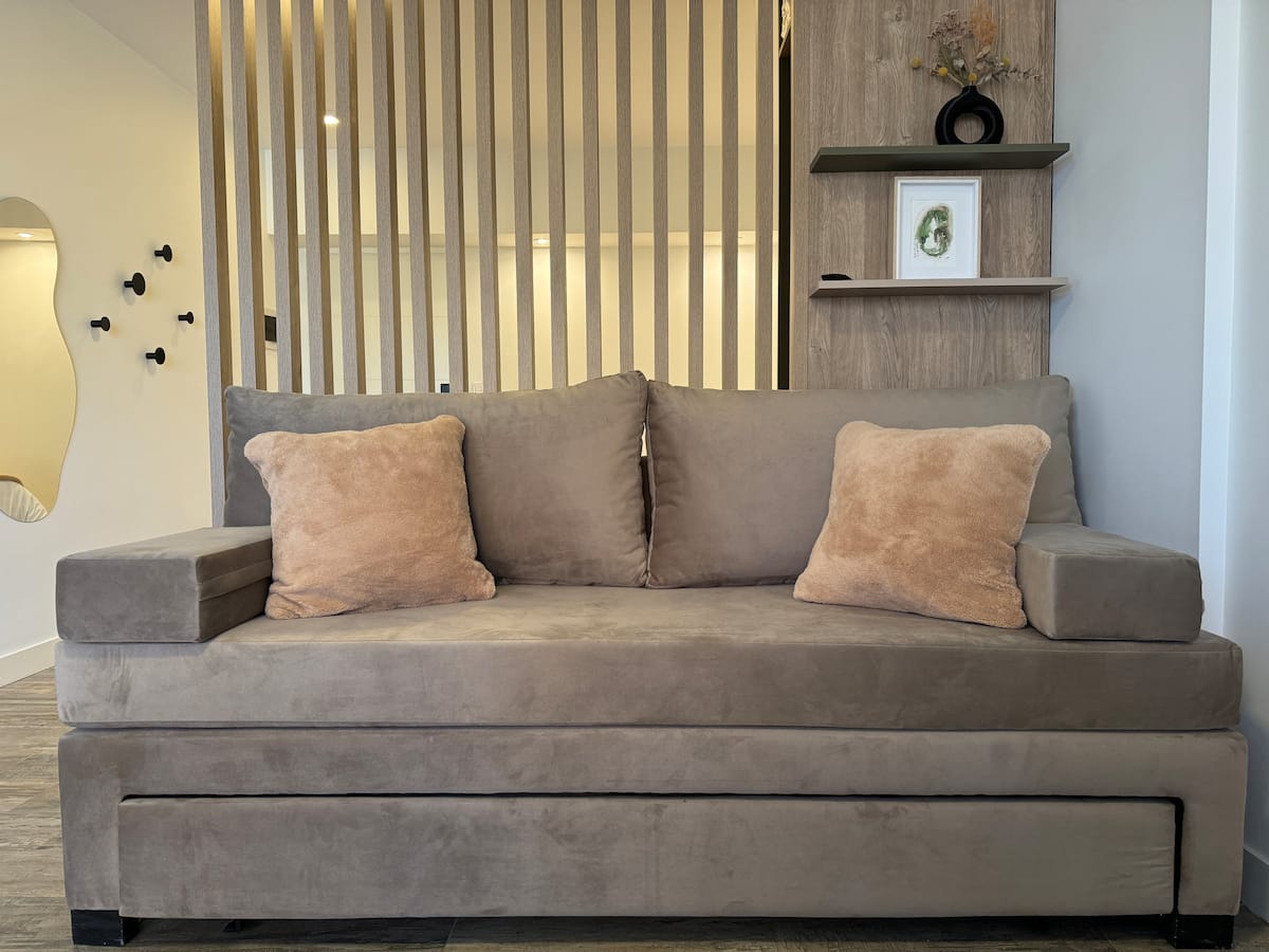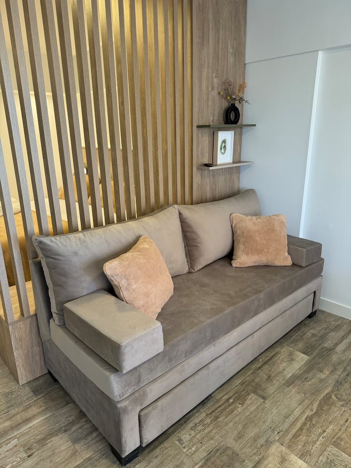Brand new one-bedroom apartment in Boedo with a balcony. The unit has one room with a queen-size bed and an armchair used as two twin beds, plus a kitchenette and a bathroom. It is equipped for up to four people, with coworking and laundry on site.