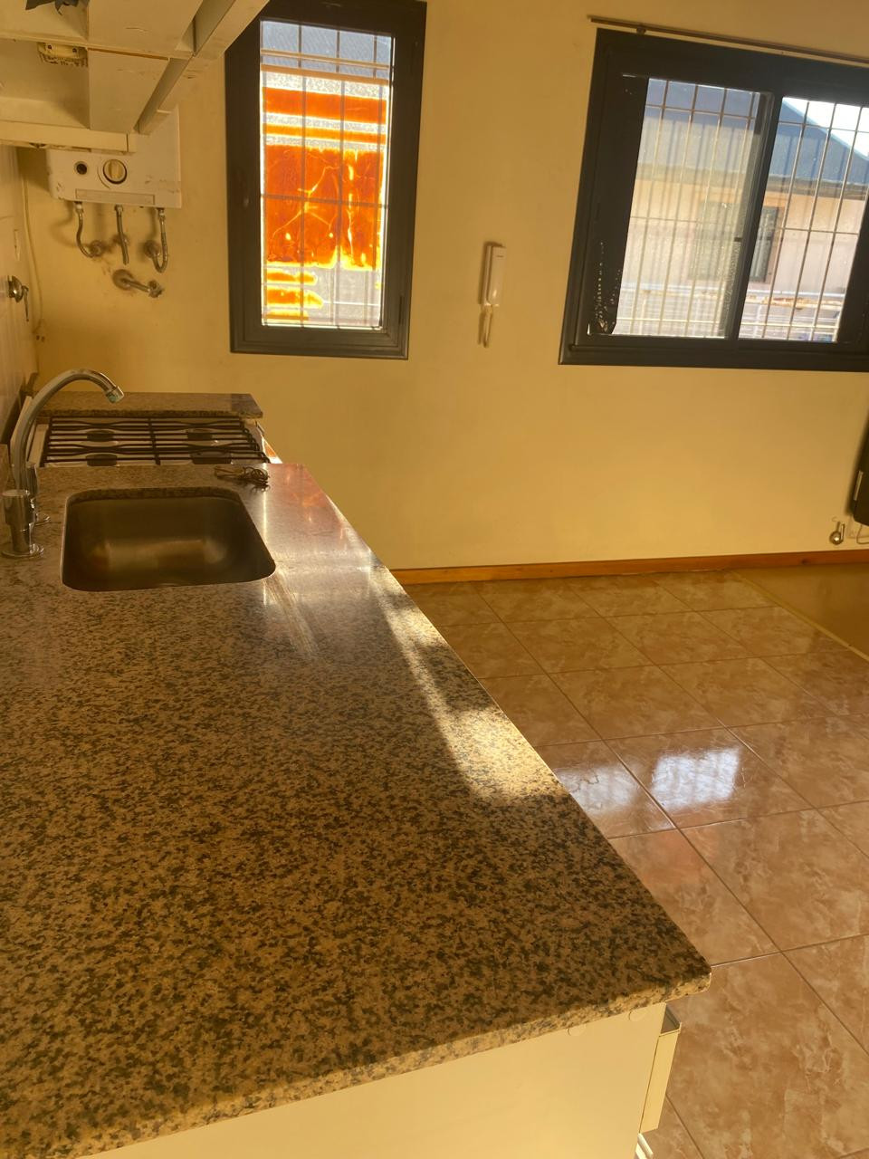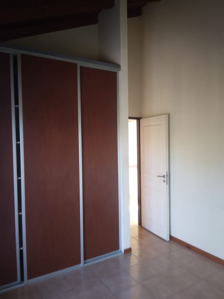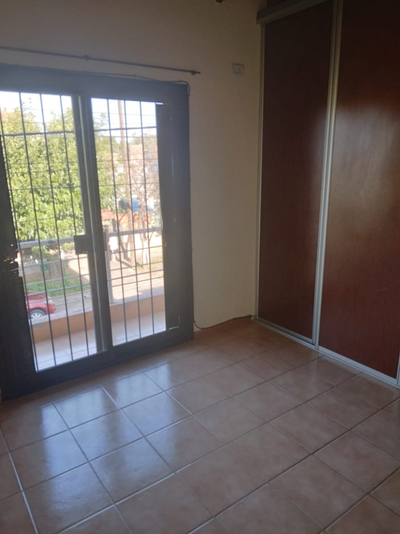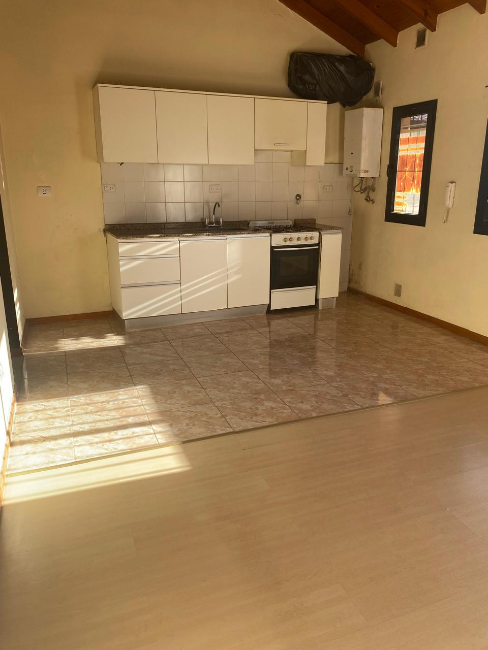 First-floor apartment with covered parking space. It has 1 bedroom with a built-in wardrobe, a full bathroom, a living-dining area, and an integrated kitchen with base cabinets, sink, overhead cabinets and a cooker. The unit has split air-conditioning and access is by stairs.