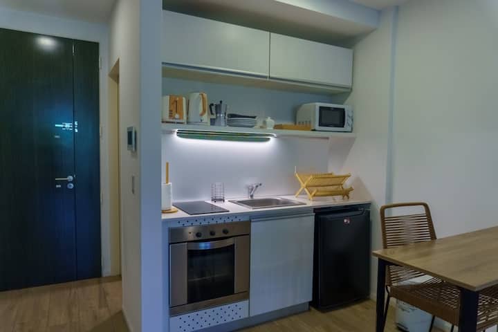 Temporary accommodation in Palermo Hollywood at Av. Córdoba and Humboldt. It includes a double bed and a sofa bed, weekly cleaning, and laundry and ironing. Air conditioning is available, along with BBQ facilities, WiFi, and TV channels including Netflix.