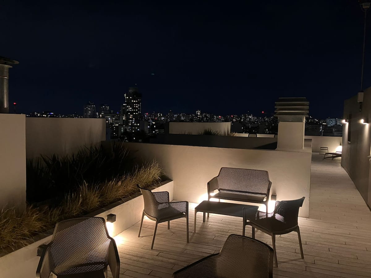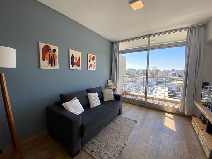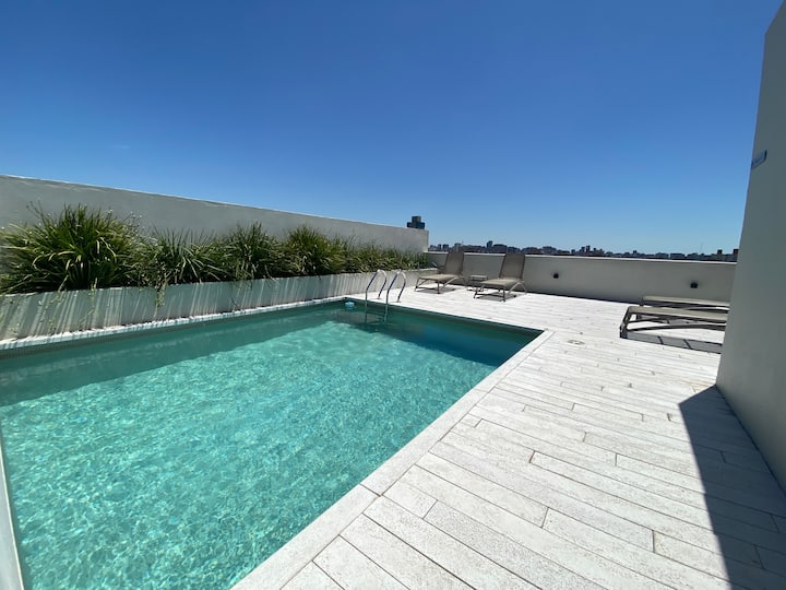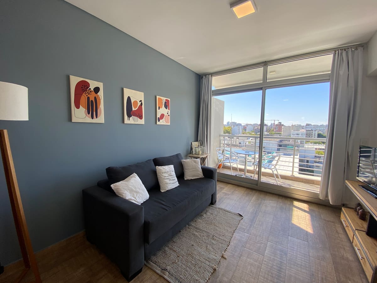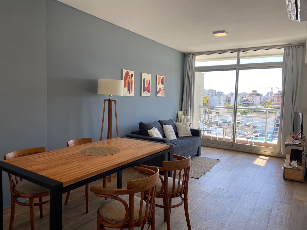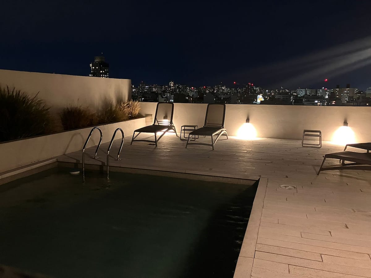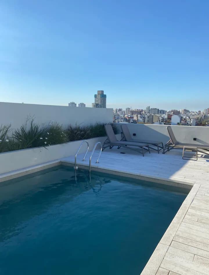 Apartment in Chacarita with a separate bedroom and air conditioning in both the bedroom and the living room. Bathroom with a bathtub and a fully equipped kitchen including a washing machine. The living room has a double sofa bed. The building has a gym, a terrace with a pool and an unheated pool, plus a separate terrace area; the pool is on the terrace and is not heated. Close to Subte B stations Dorrego and Federico Lacroze, and a few metres from Av. Corrientes.