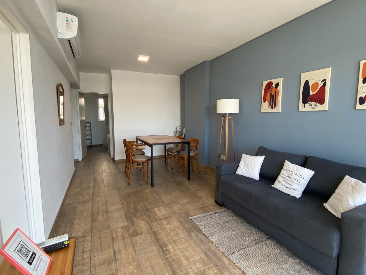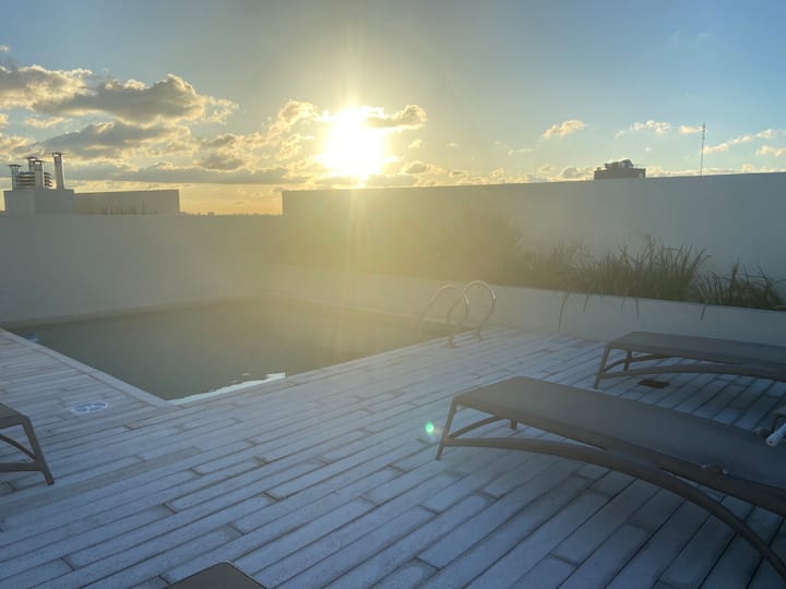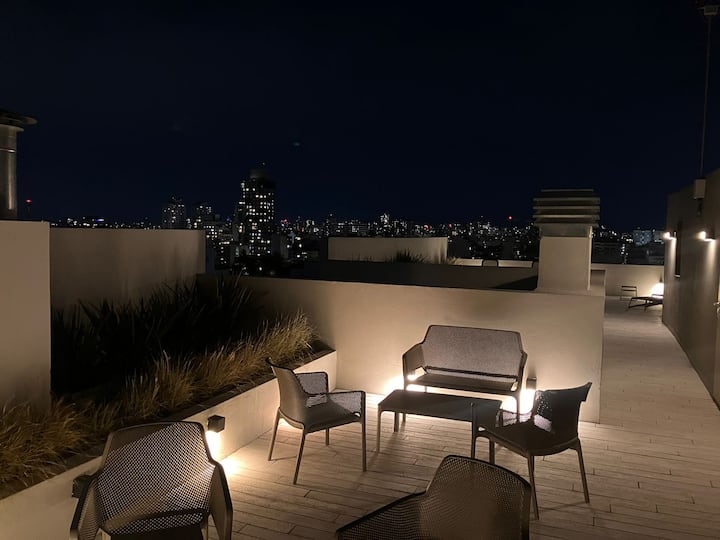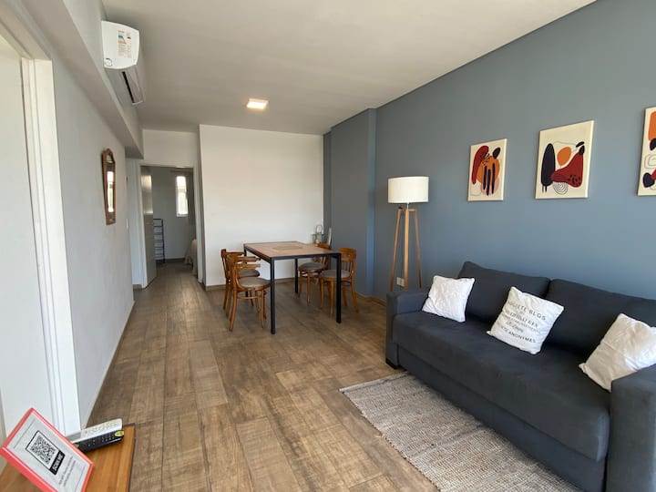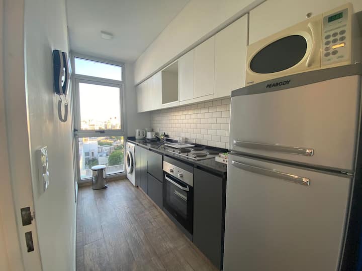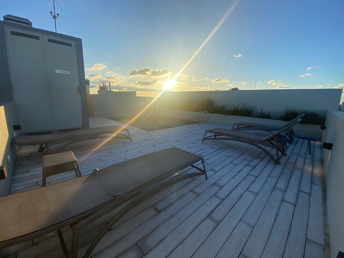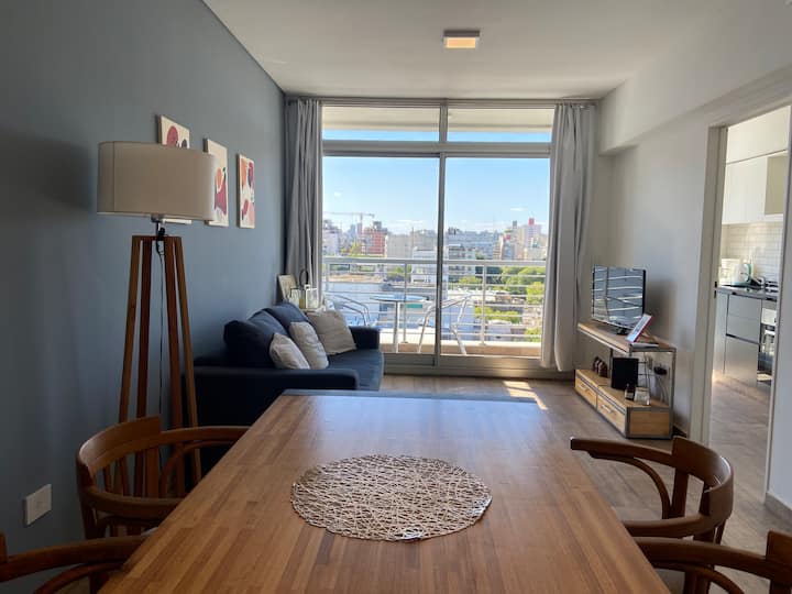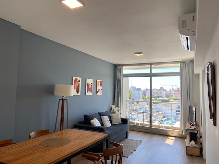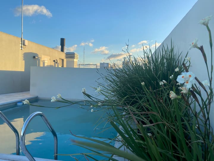 Apartment in Chacarita with a separate bedroom and air conditioning in both the bedroom and the living room. Bathroom with a bathtub and a fully equipped kitchen including a washing machine. The living room has a double sofa bed. The building has a gym, a terrace with a pool and an unheated pool, plus a separate terrace area; the pool is on the terrace and is not heated. Close to Subte B stations Dorrego and Federico Lacroze, and a few metres from Av. Corrientes.