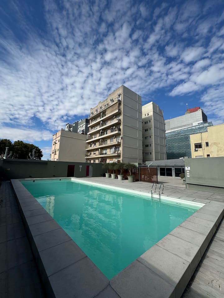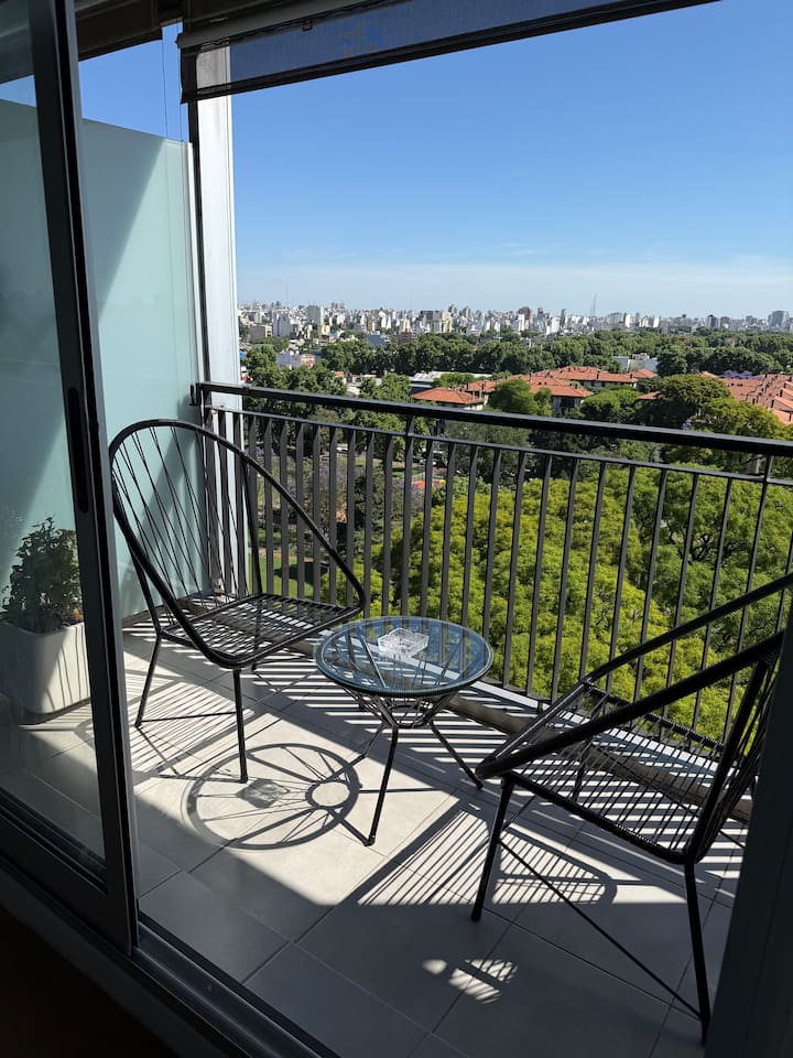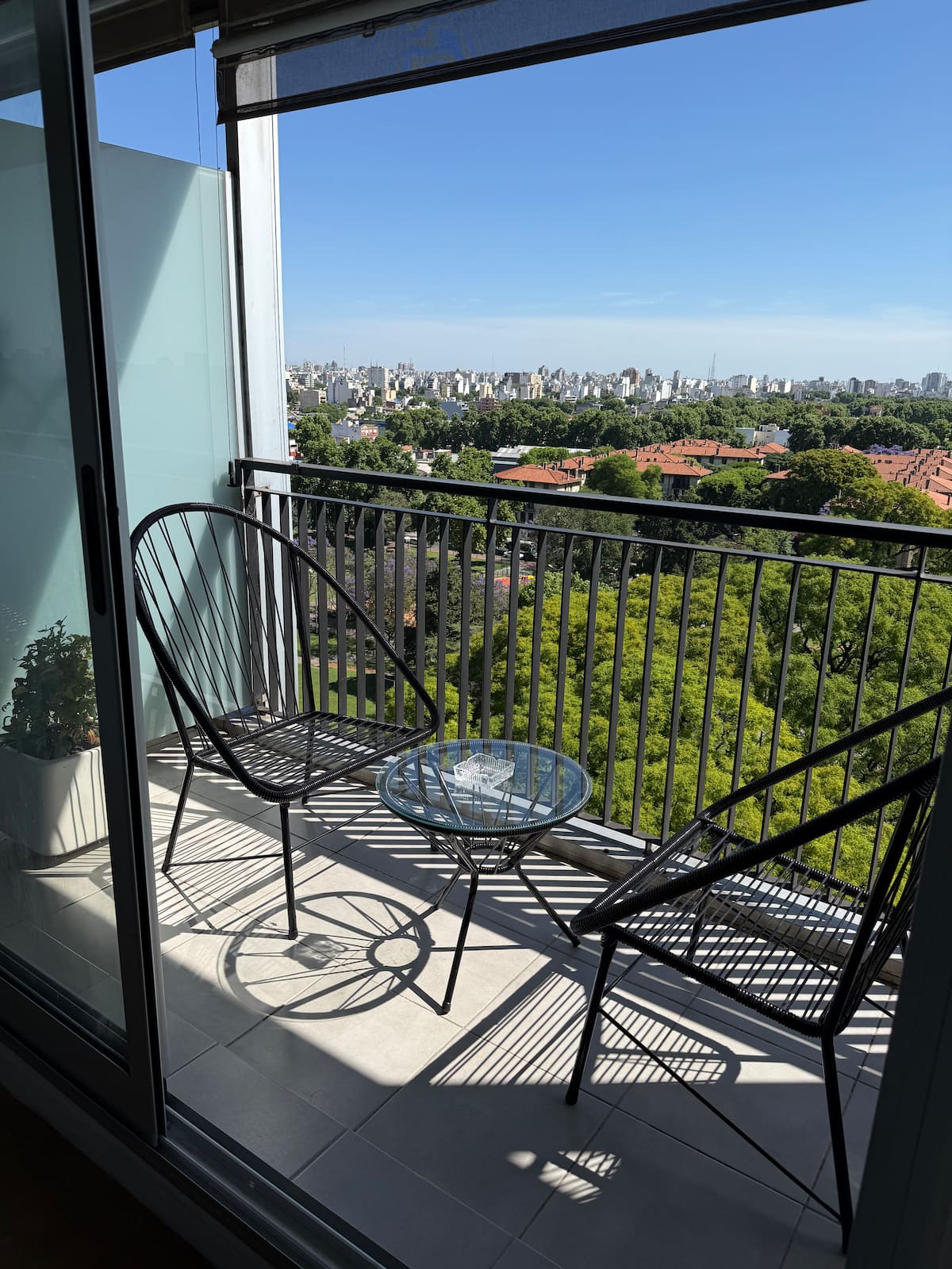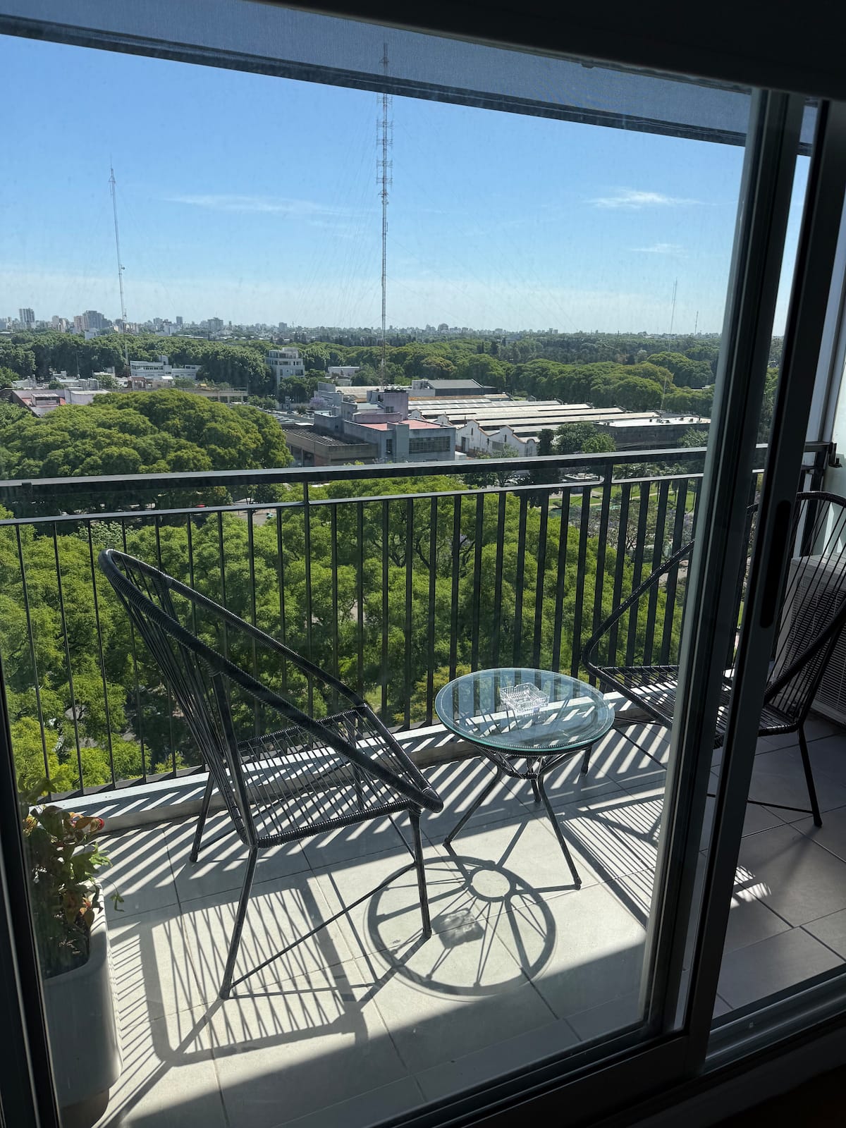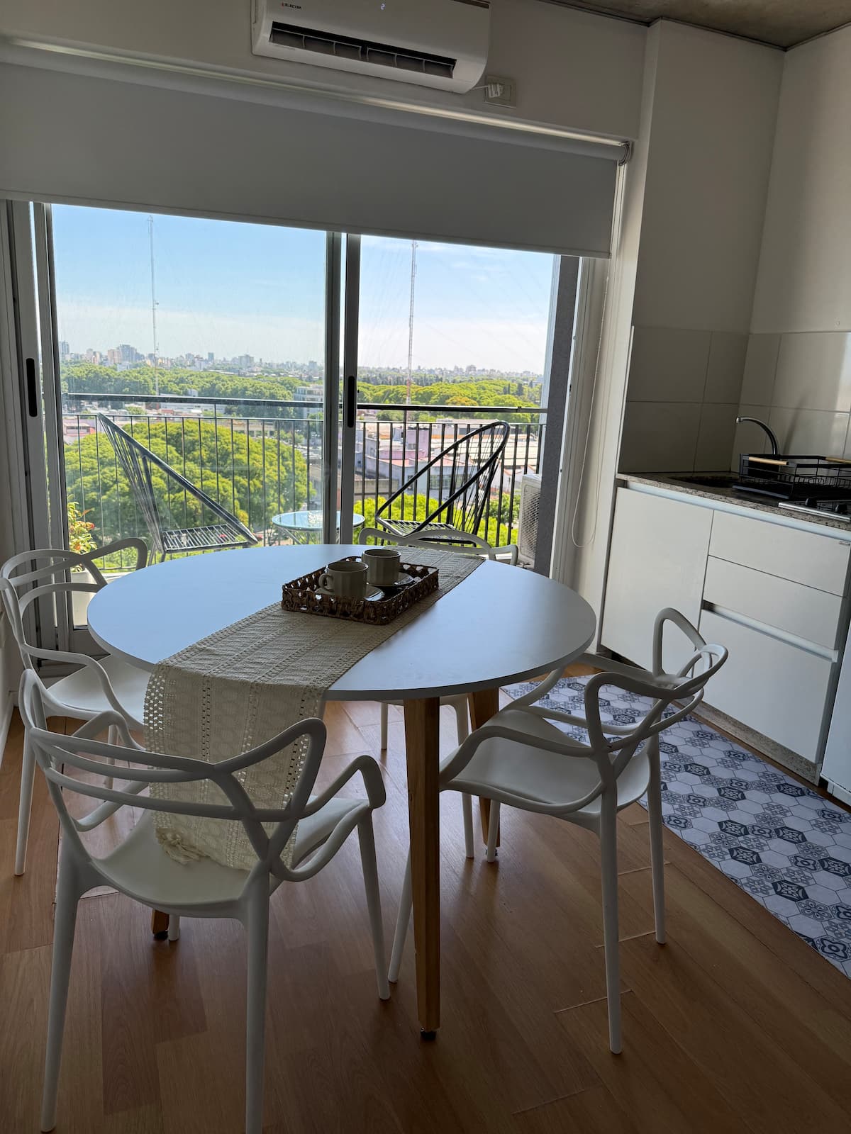 Modern one-bedroom apartment in Chacarita overlooking the park, with a balcony. It is fully equipped with a queen bed, bedding, kitchen, hot/cold air conditioning, WiFi and TV. The building has a pool, gym, communal room (SUM), solarium, laundry, meeting room, and 24-hour security.