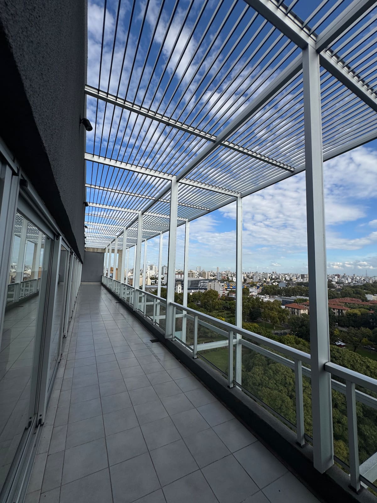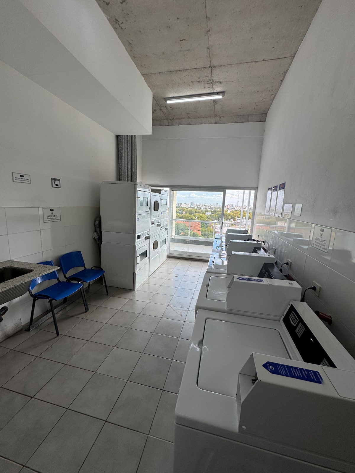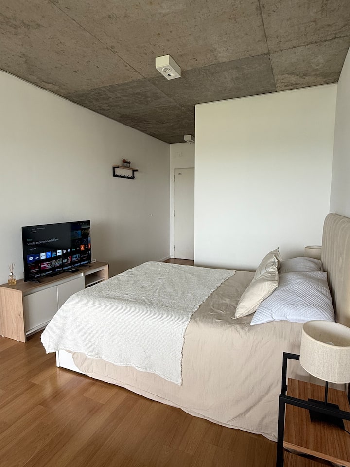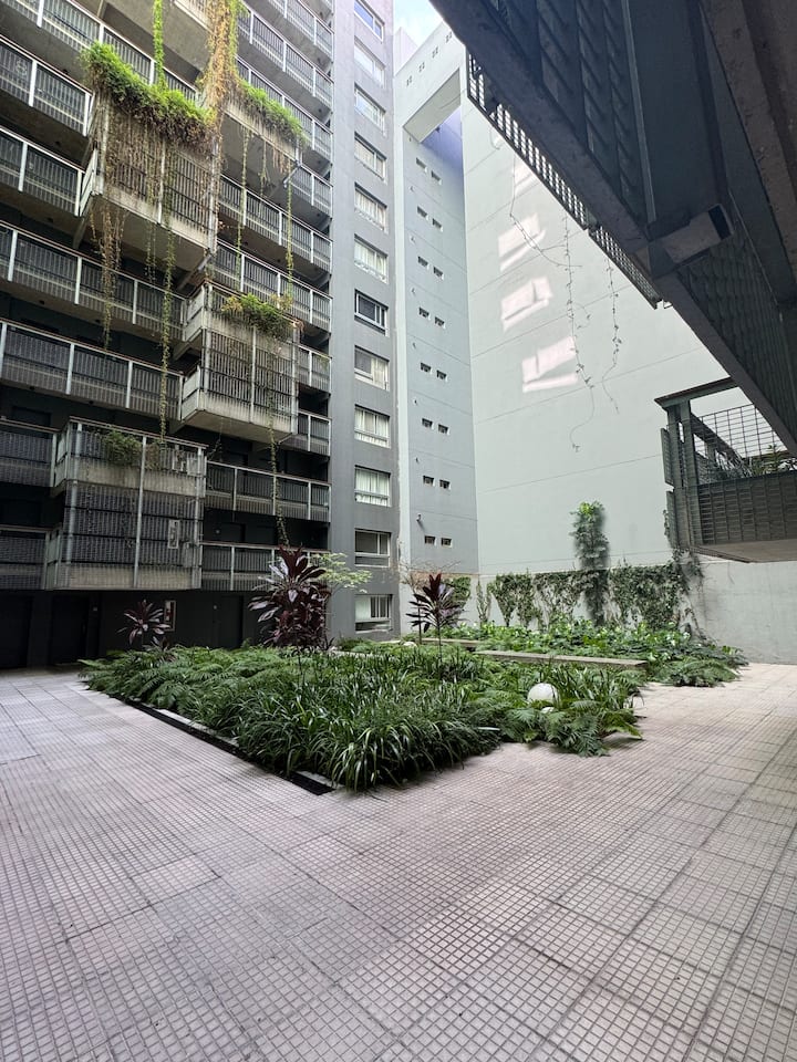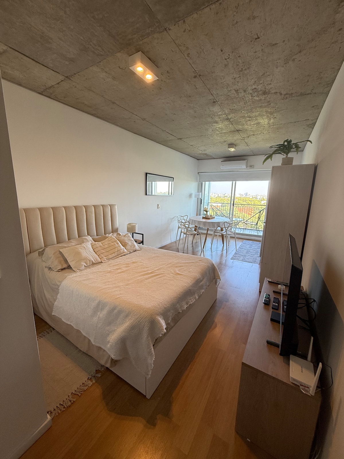 Modern one-bedroom apartment in Chacarita overlooking the park, with a balcony. It is fully equipped with a queen bed, bedding, kitchen, hot/cold air conditioning, WiFi and TV. The building has a pool, gym, communal room (SUM), solarium, laundry, meeting room, and 24-hour security.