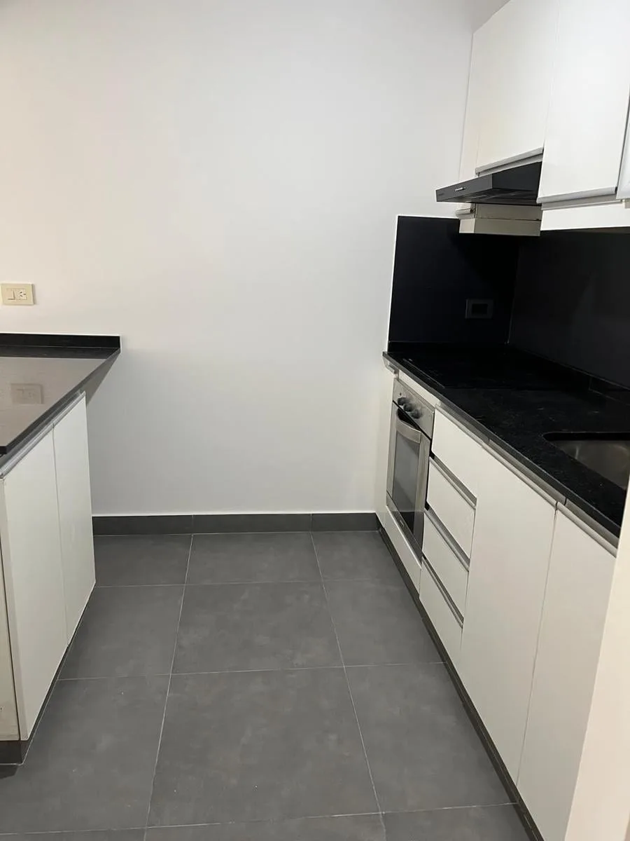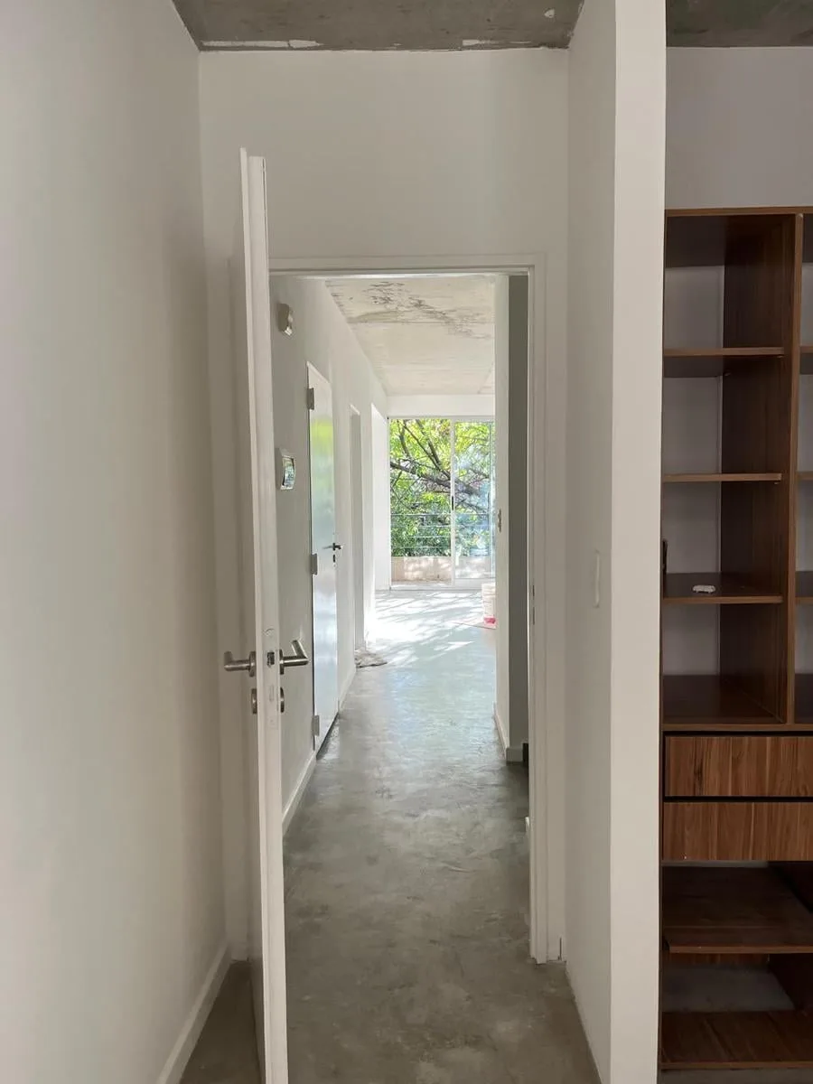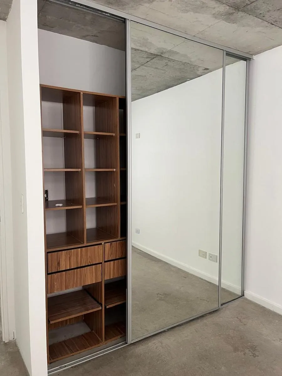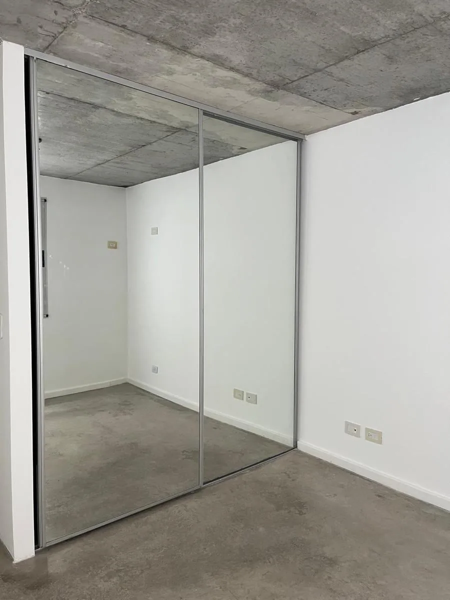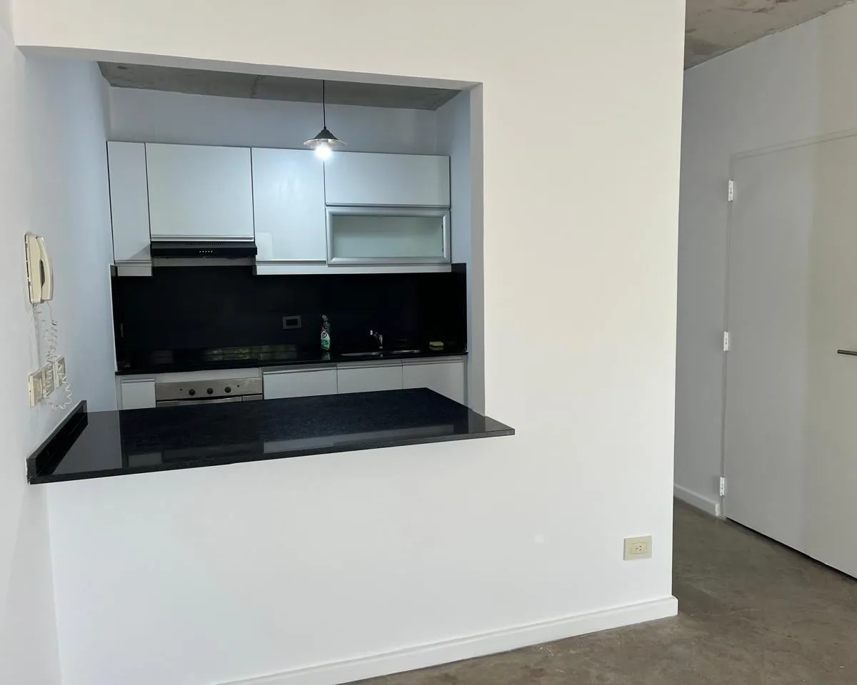 Two-room, unfurnished apartment in Chacarita on the 3rd floor, courtyard-facing (contrafrente). It has a living-dining room with access to a front balcony, a bedroom with mirrored closet, an integrated kitchen with breakfast bar and space for a washer, and a full bathroom. Building fees include ABL and AYSA, and the unit has one hot/cold air-conditioning unit in the living-dining room. Pets are not accepted.