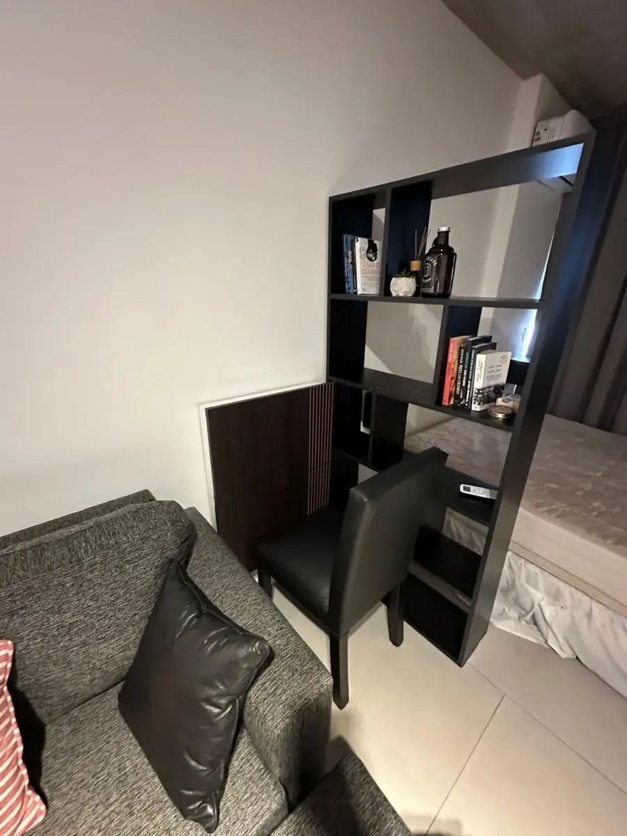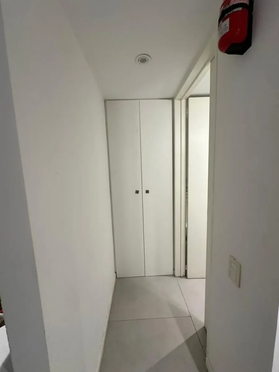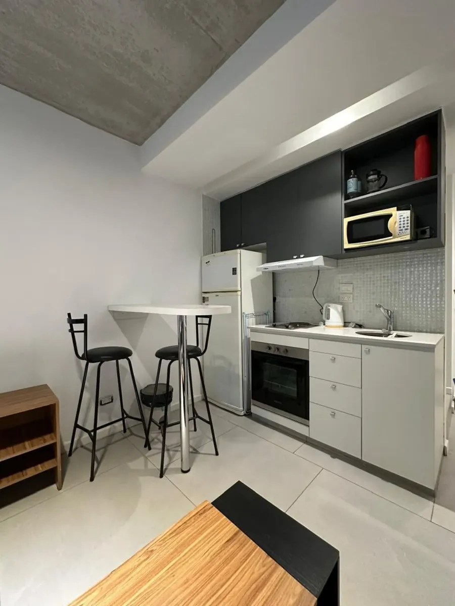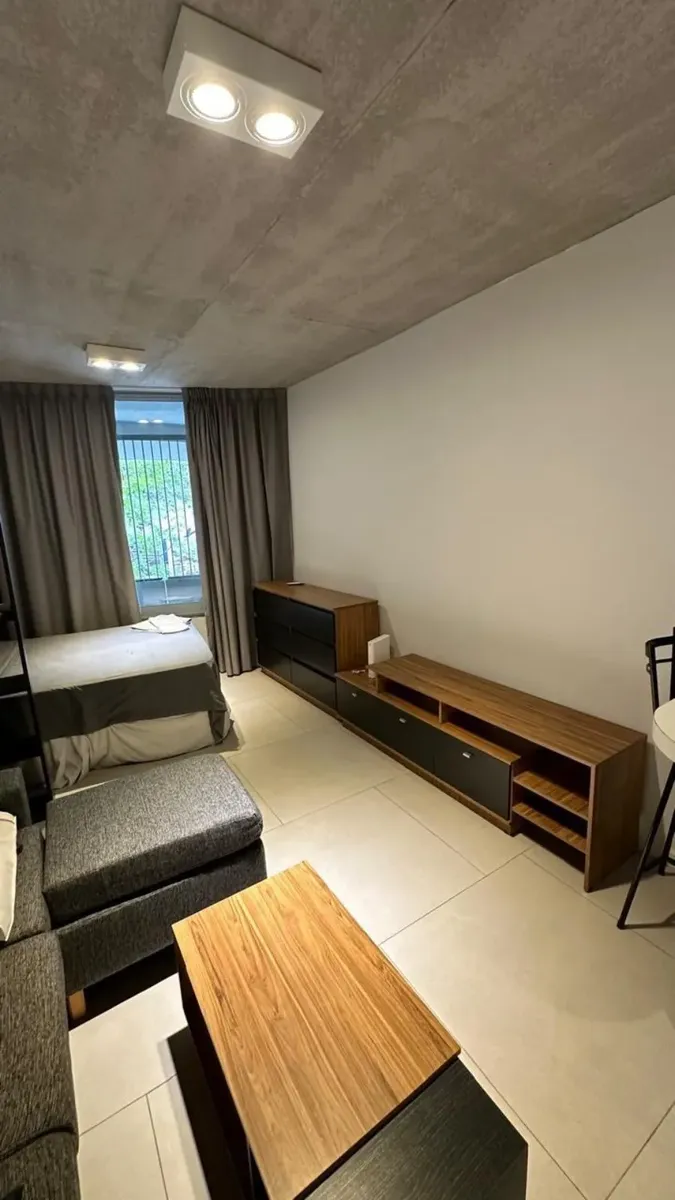 Furnished studio apartment for temporary rental in Coghlan, on the first floor. The unit includes a full bathroom and a small balcony, and is described as well equipped. Monthly rent is USD 580 plus building fees of $75,000 and utilities. Rental terms are 6 or 12 months, with the entry requiring one advance month, a refundable rental guarantee bond of USD 700, and professional fees.