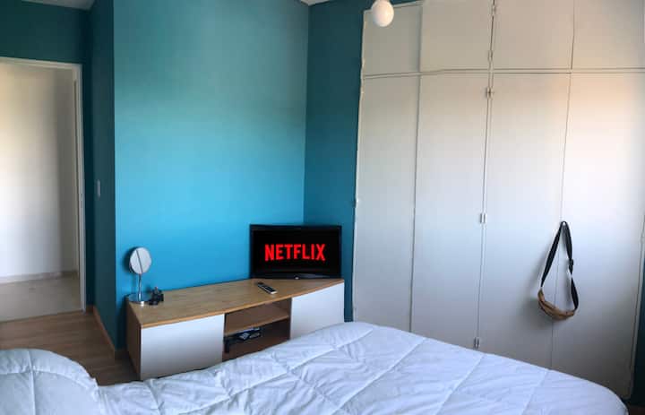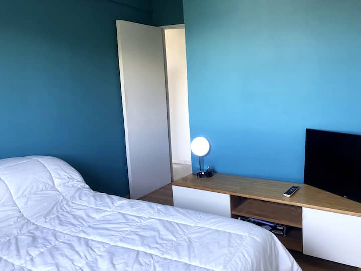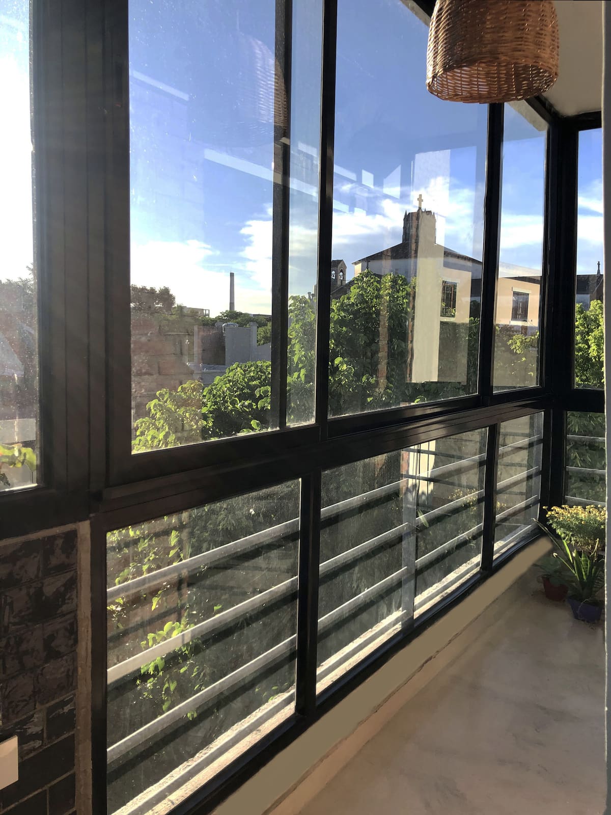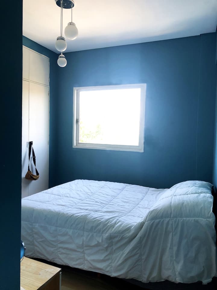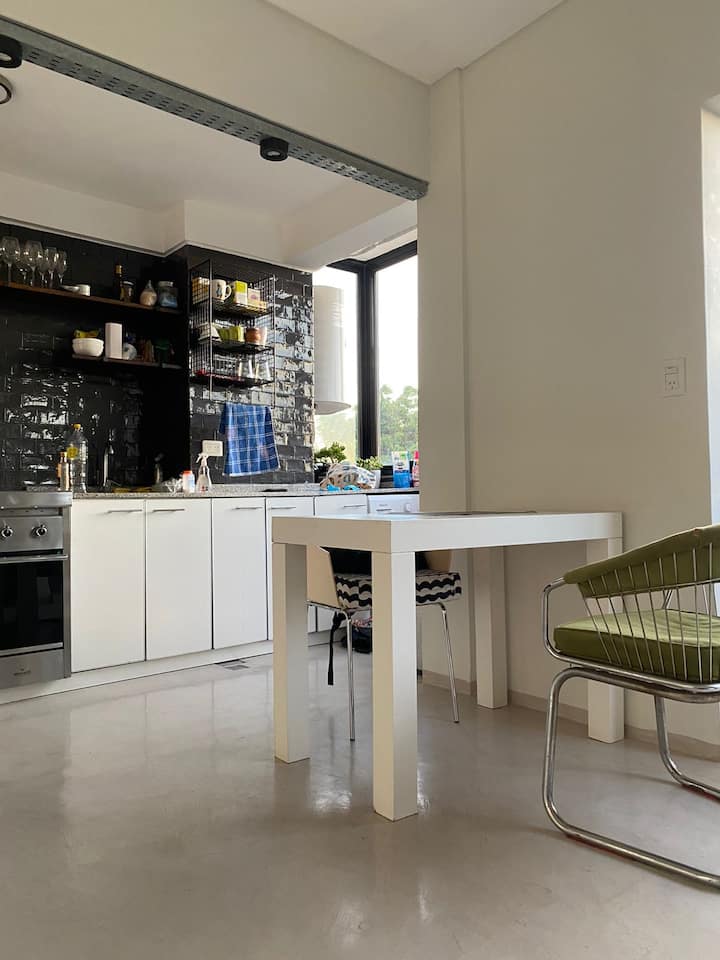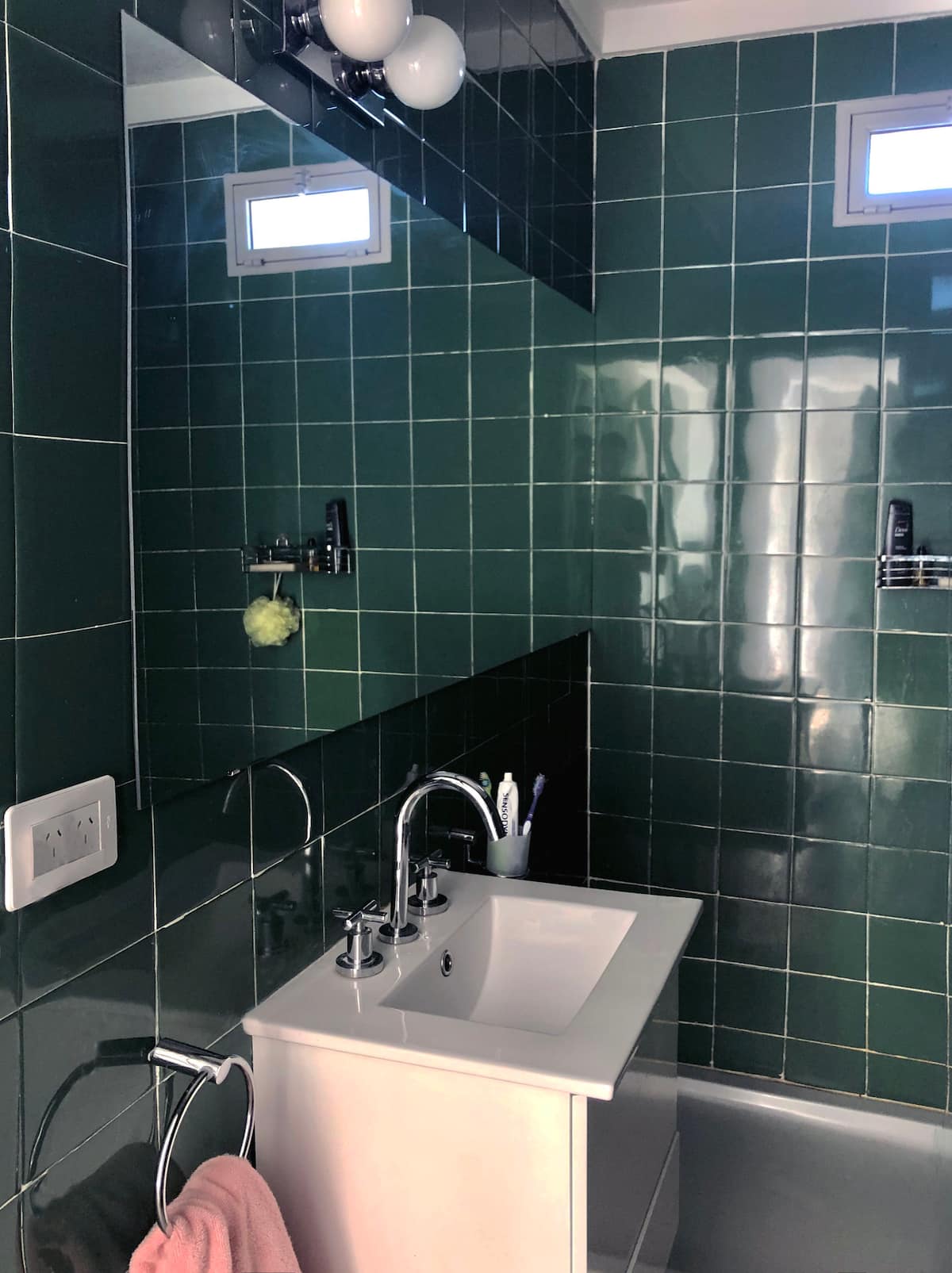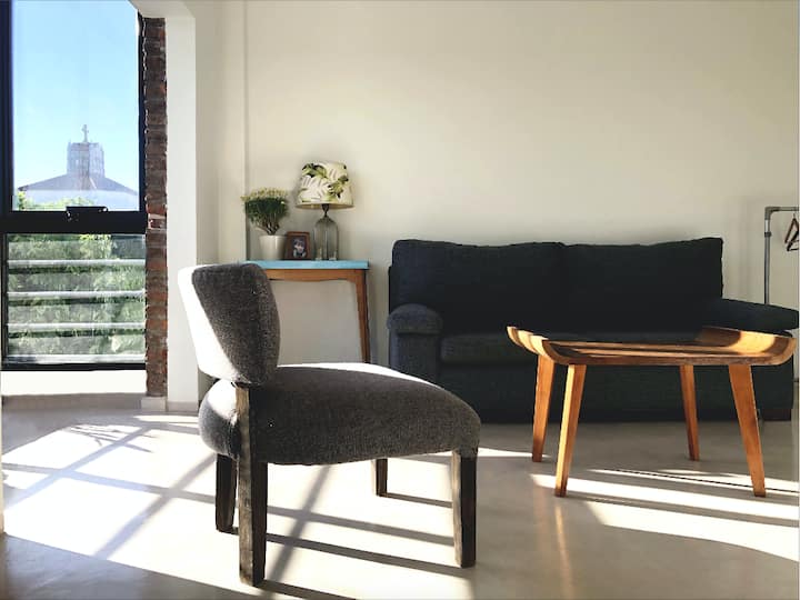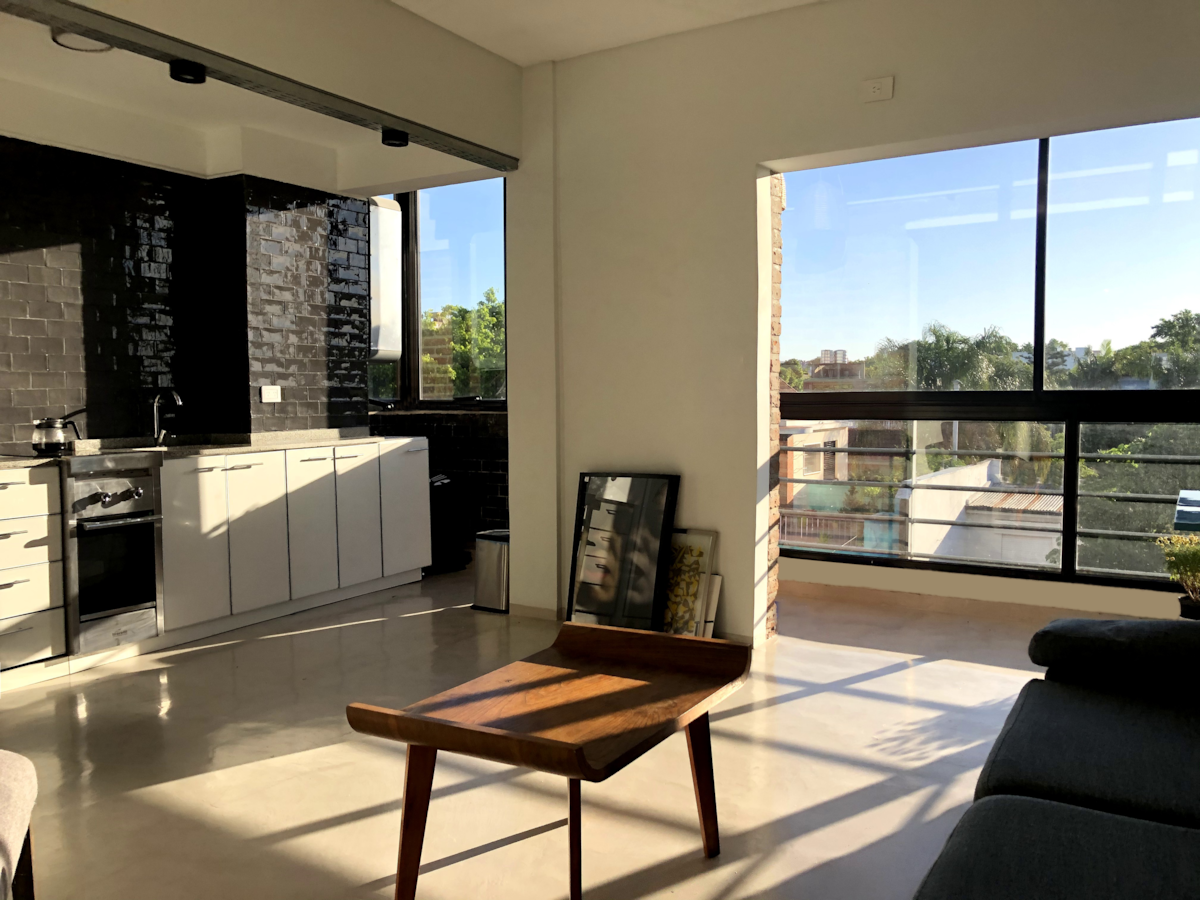 Two-room apartment in Coghlan, 1 bedroom and a combined living-dining area with a recycled kitchen integrated into the main room. The apartment receives natural light and faces an area with extensive greenery. The listing describes the neighbourhood as quiet and notes murals and local dining options, with an estimated 20-minute train ride from Retiro station.