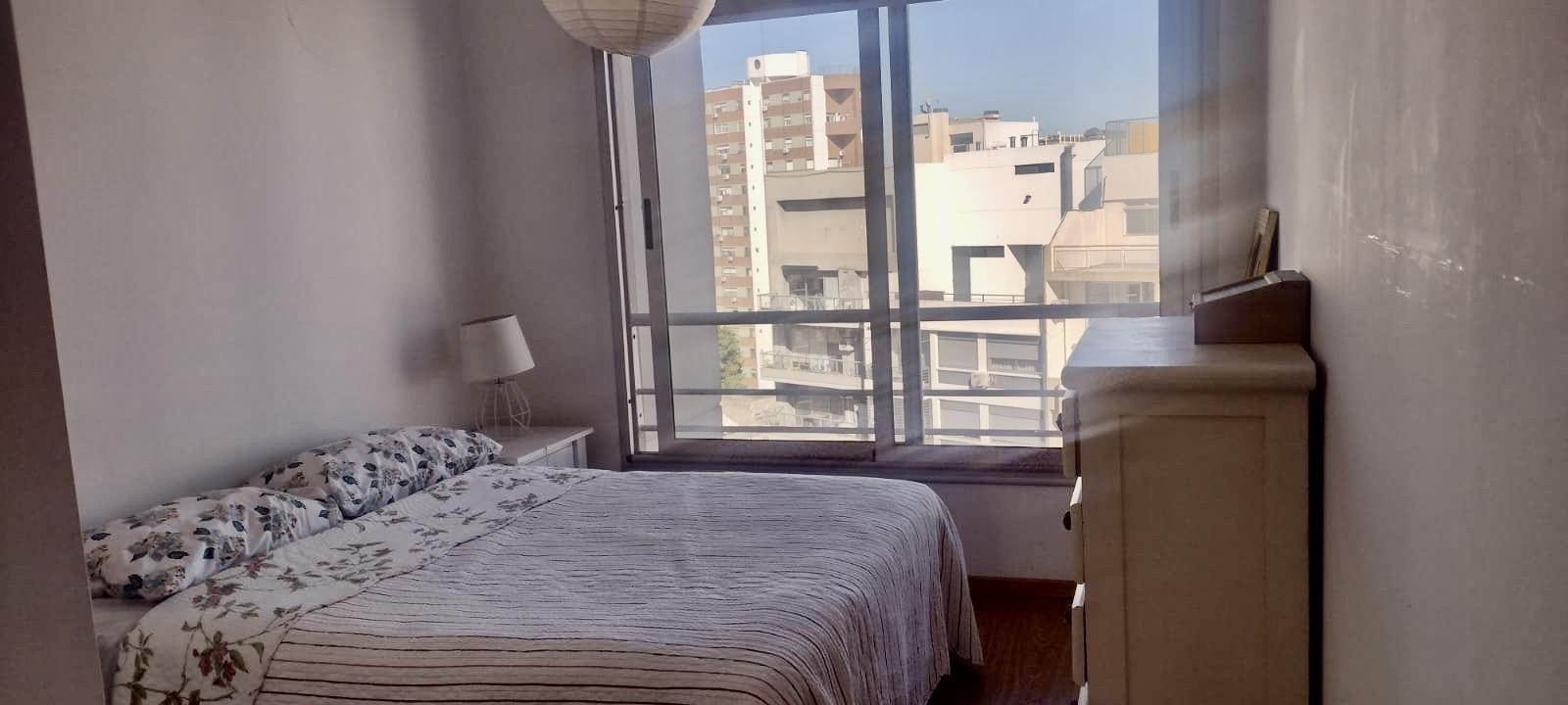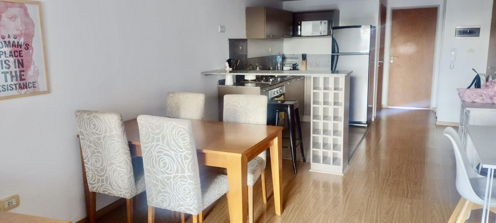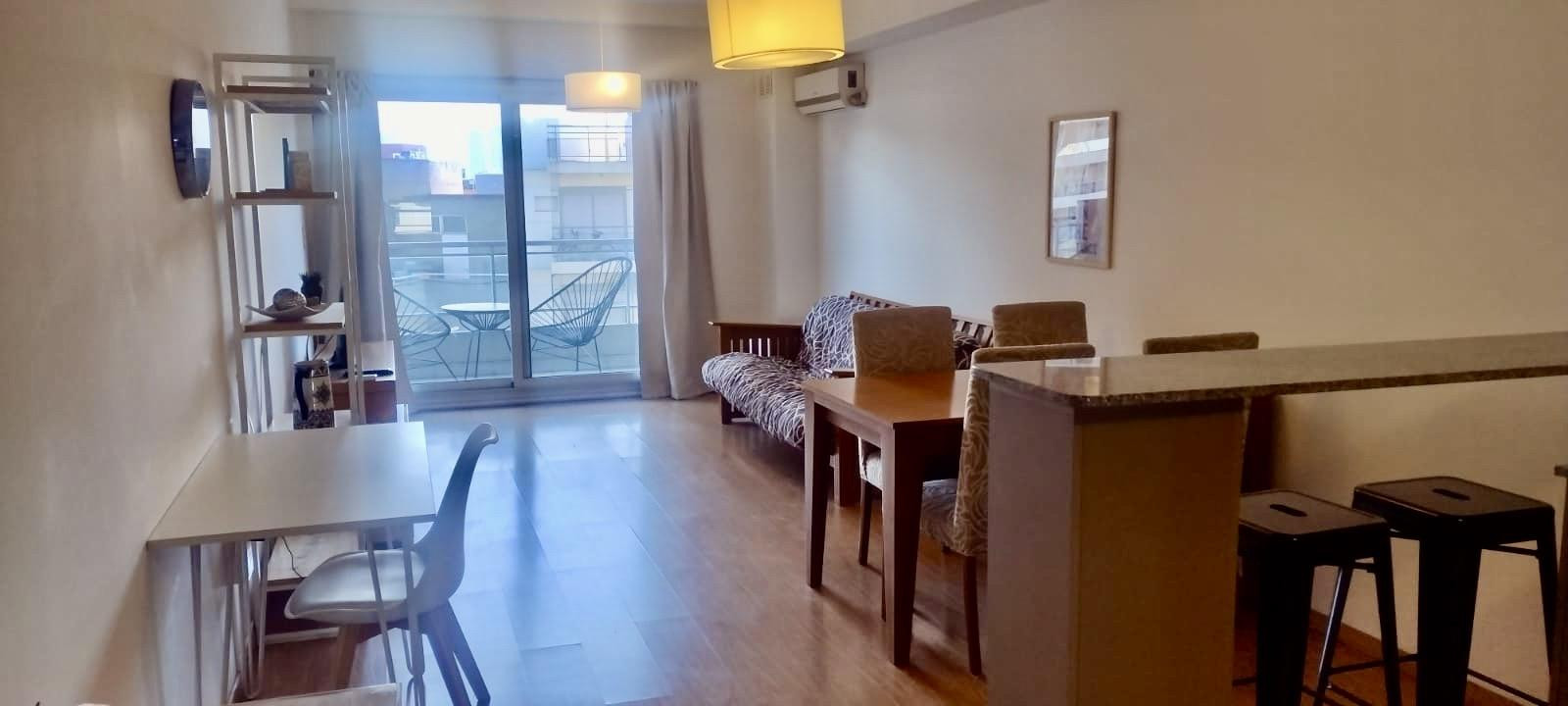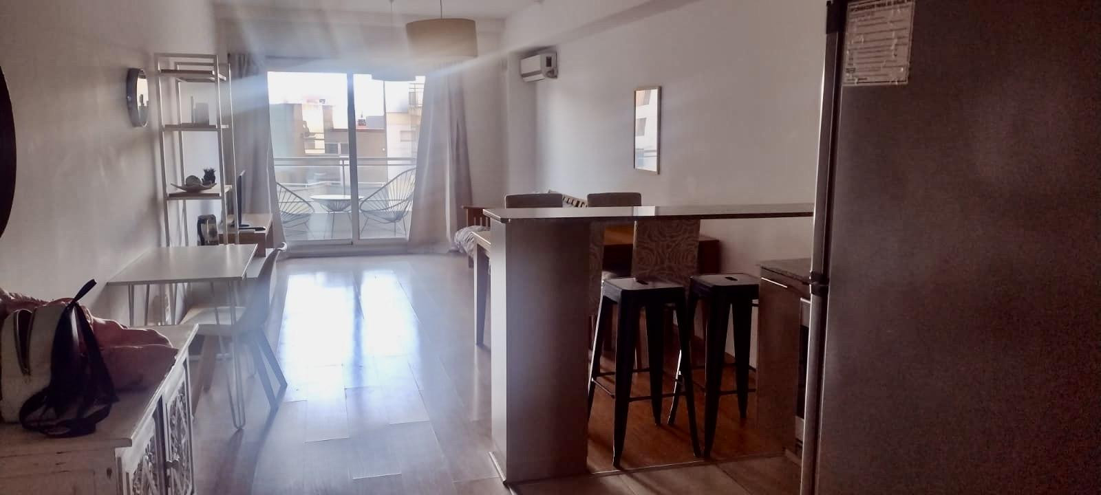 Two-room apartment in Coghlan with a balcony. Integrated kitchen connected to the living and dining area. Rent is USD 550, plus building fees and other services.