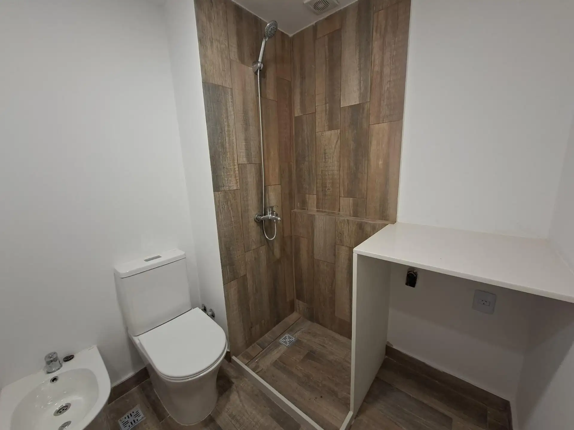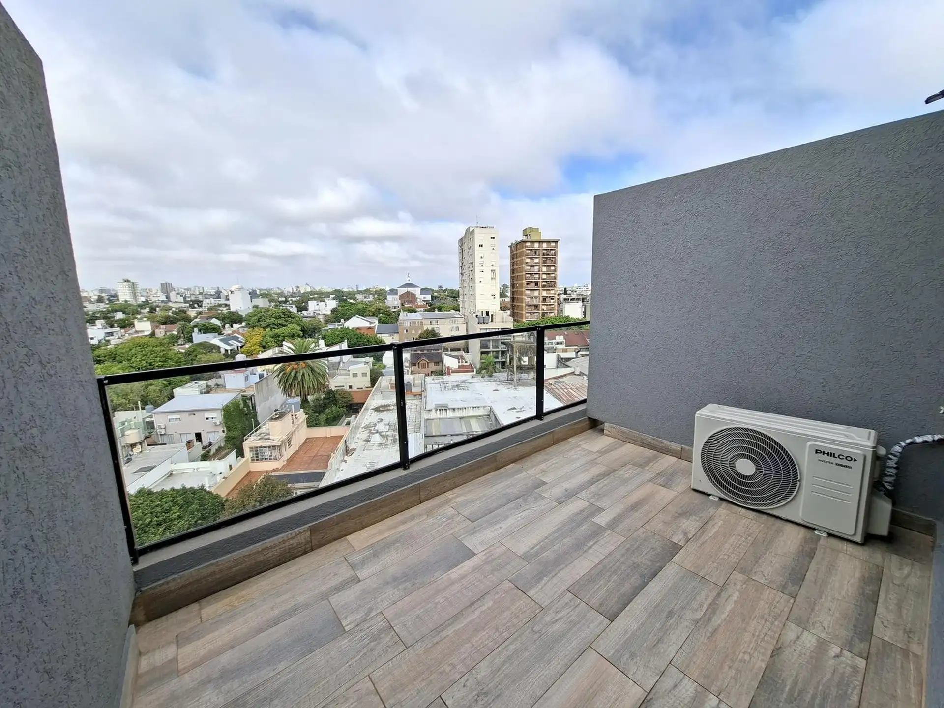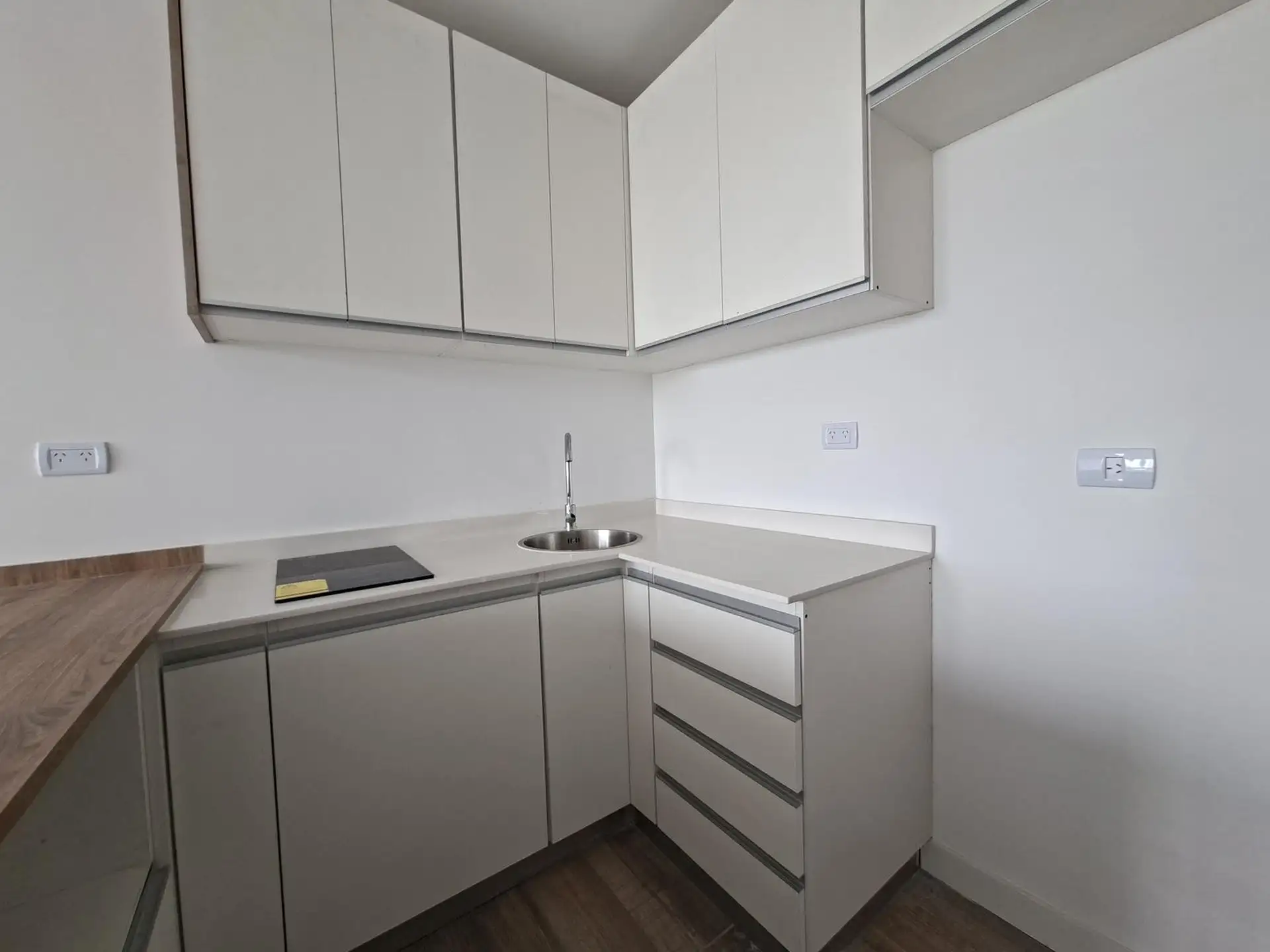Studio apartment for rent in Coghlan, street-facing on Av. Ricardo Balbín between Manuela Pedraza and Tamborini, with a balcony-terrace. The unit has porcelain-tile flooring, air conditioning, a large window, and an integrated kitchen with overhead and base cabinetry, single-lever faucet fixtures and an electric hot-plate. There is a full bathroom with space for a washing machine, and hot water is provided by a central boiler. The 9-storey building has 8 units per floor, 24-hour security, a pool