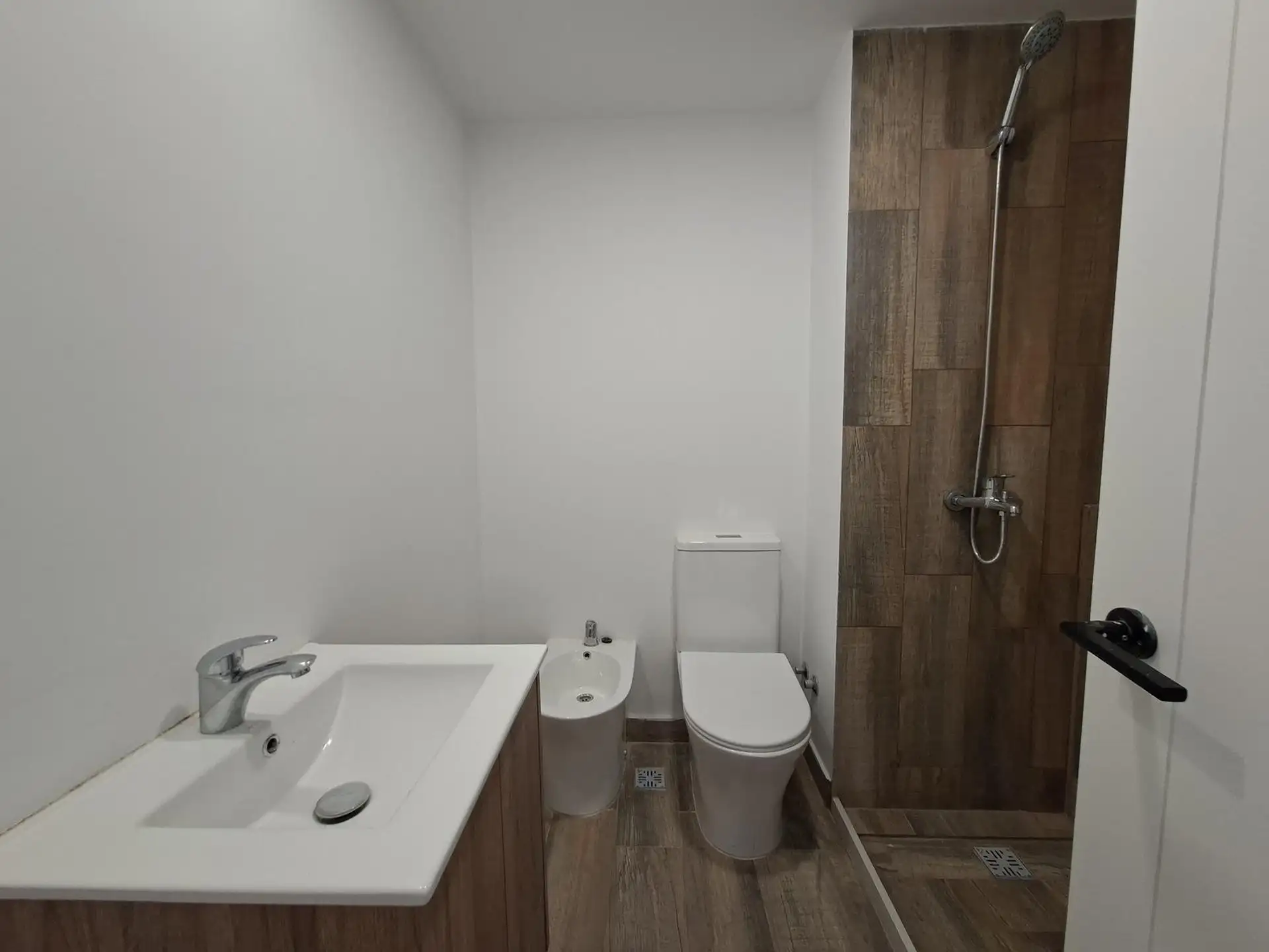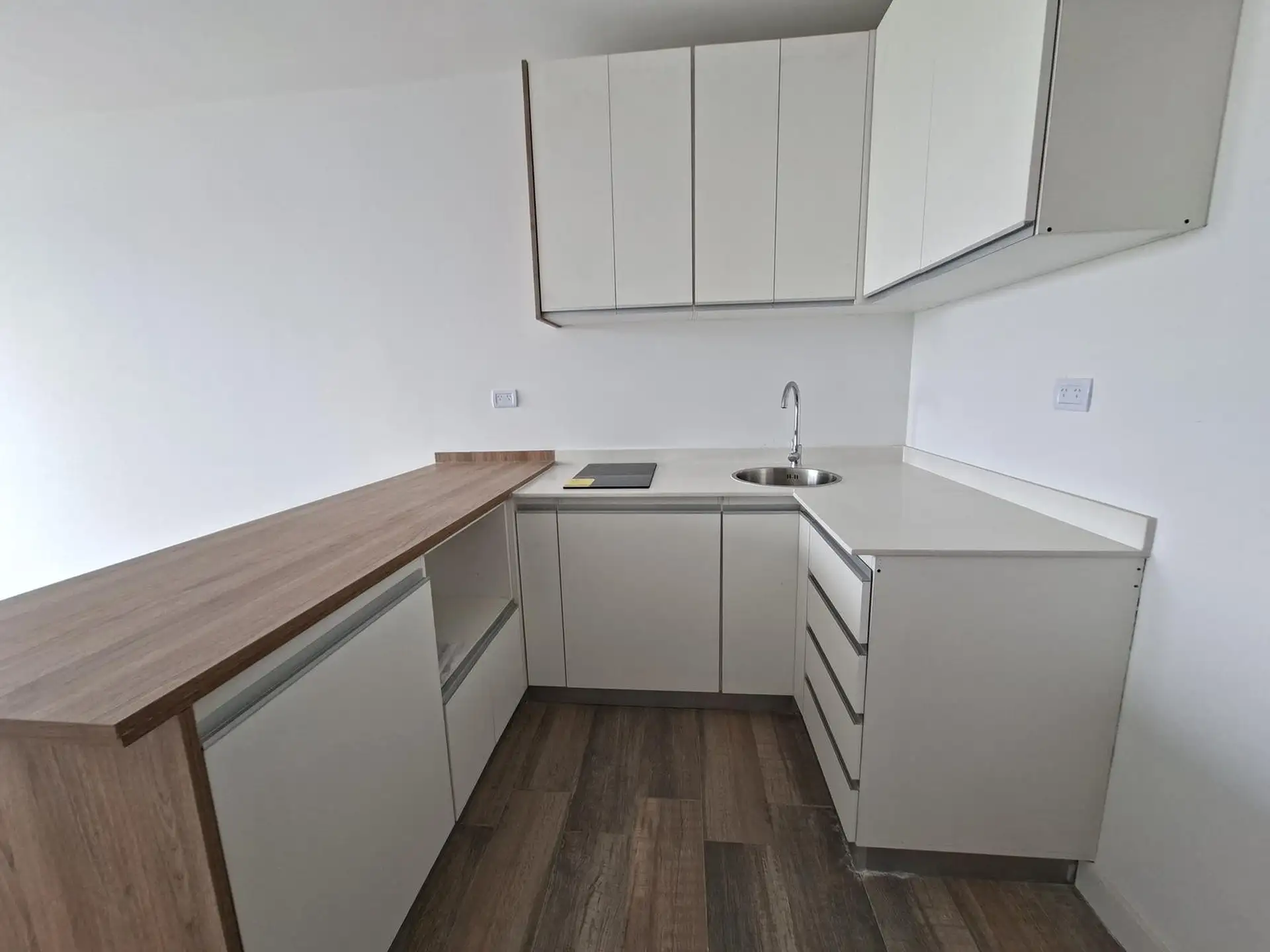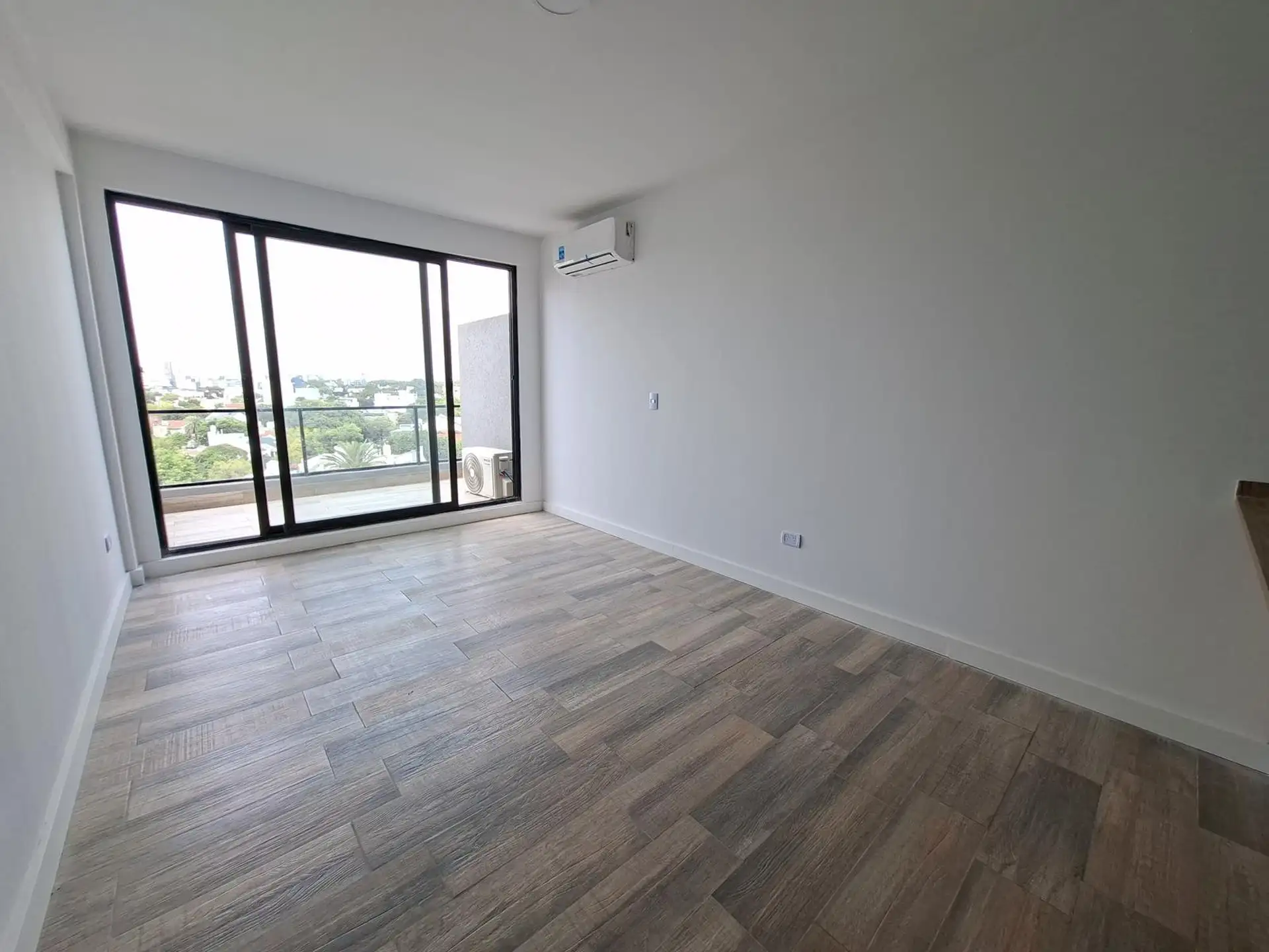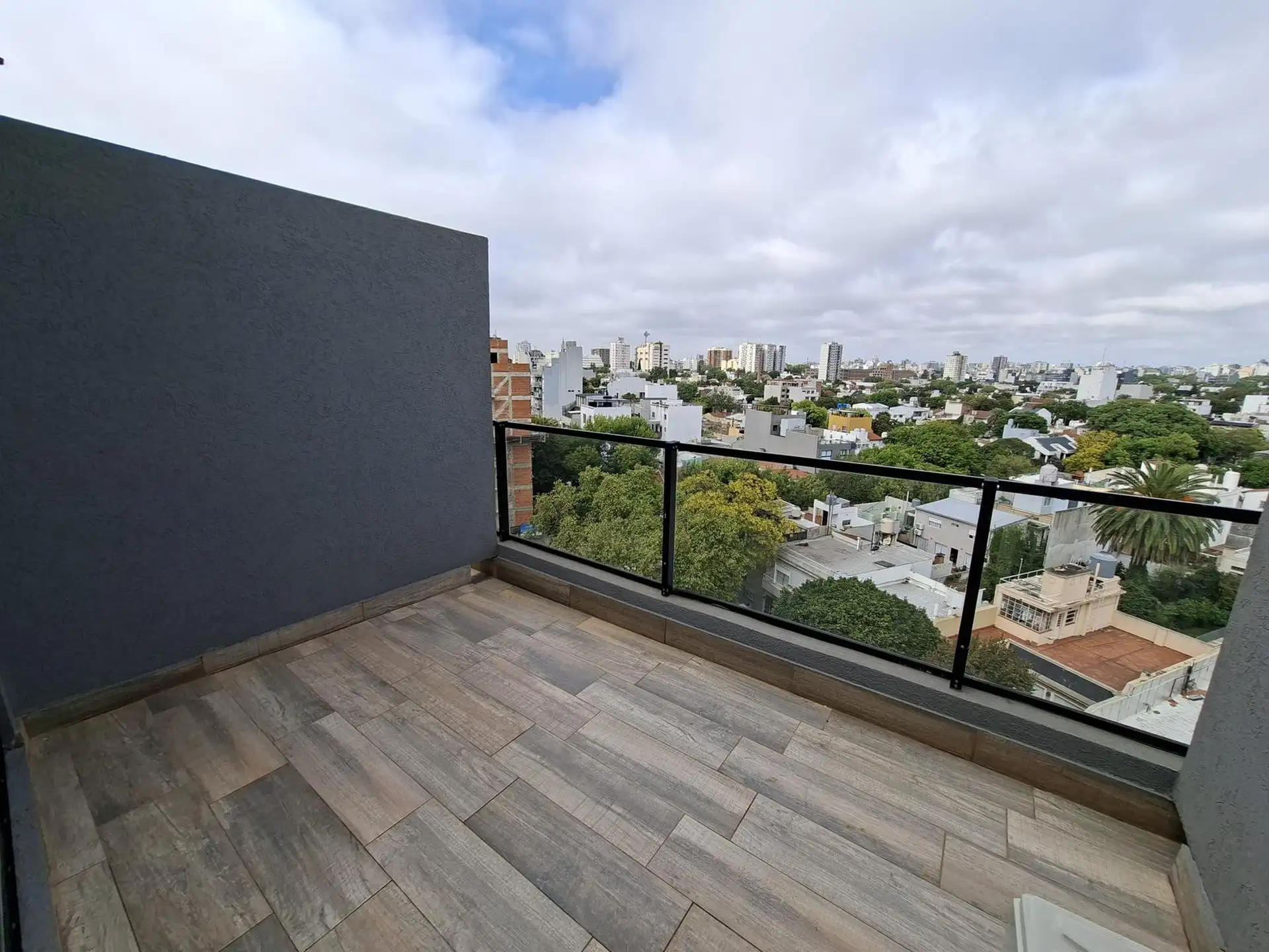 Studio apartment for rent in Coghlan, street-facing on Av. Ricardo Balbín between Manuela Pedraza and Tamborini, with a balcony-terrace. The unit has porcelain-tile flooring, air conditioning, a large window, and an integrated kitchen with overhead and base cabinetry, single-lever faucet fixtures and an electric hot-plate. There is a full bathroom with space for a washing machine, and hot water is provided by a central boiler. The 9-storey building has 8 units per floor, 24-hour security, a pool