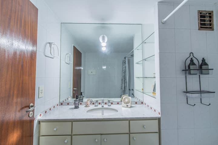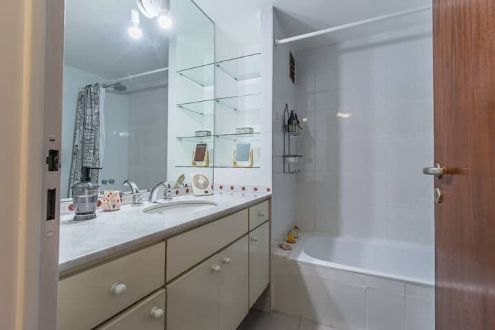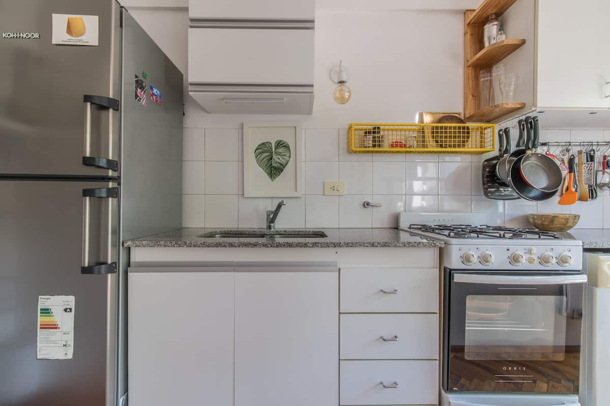 One-bedroom apartment with a balcony in Colegiales. Furnished with a living room, double bed, complete bathroom with bathtub and bidet, and an equipped kitchen. Elevator in the building and street-facing on an avenue; there may be occasional construction noise during permitted hours. Near Subway D, Olleros station, with buses and other local services.