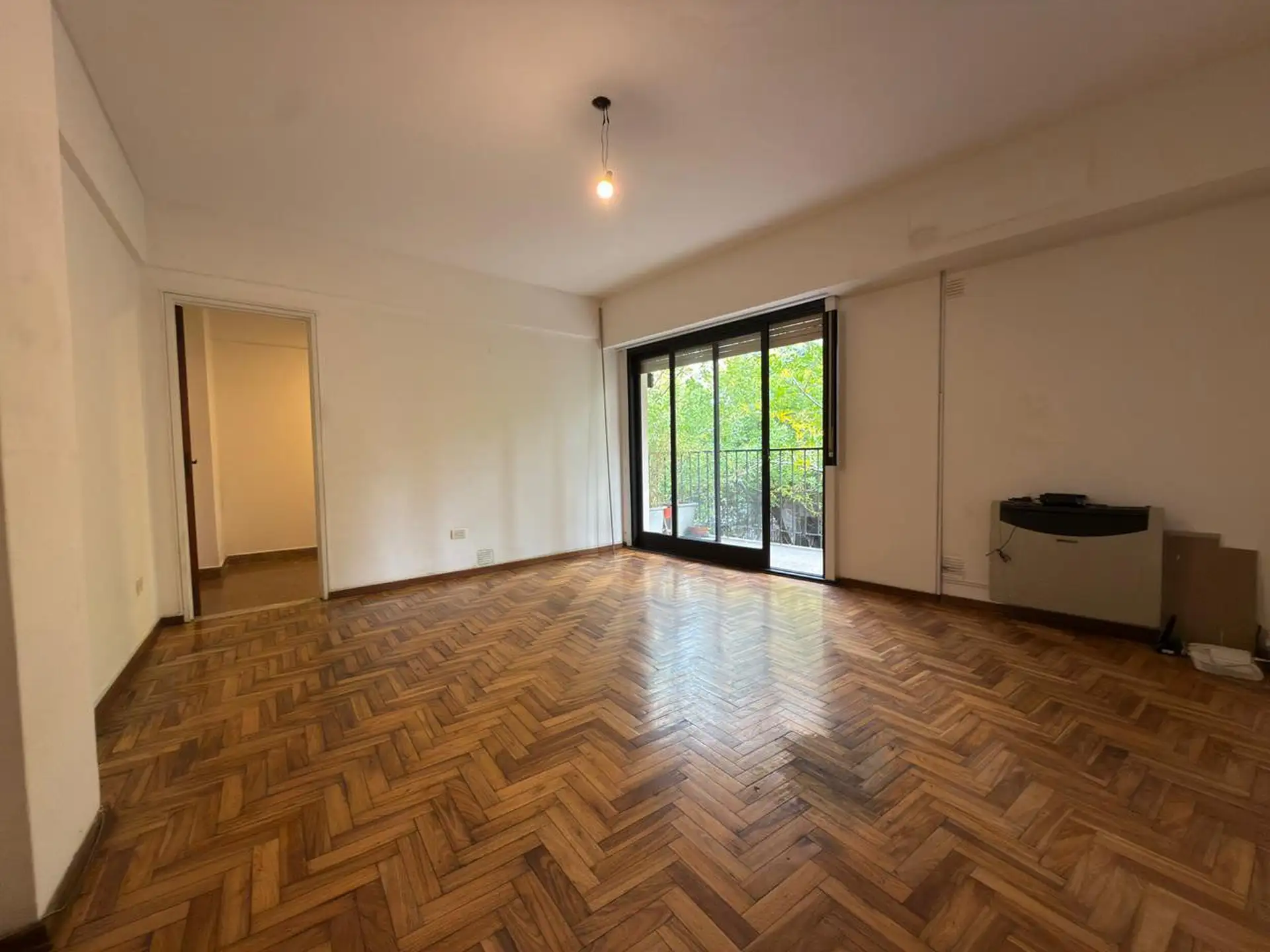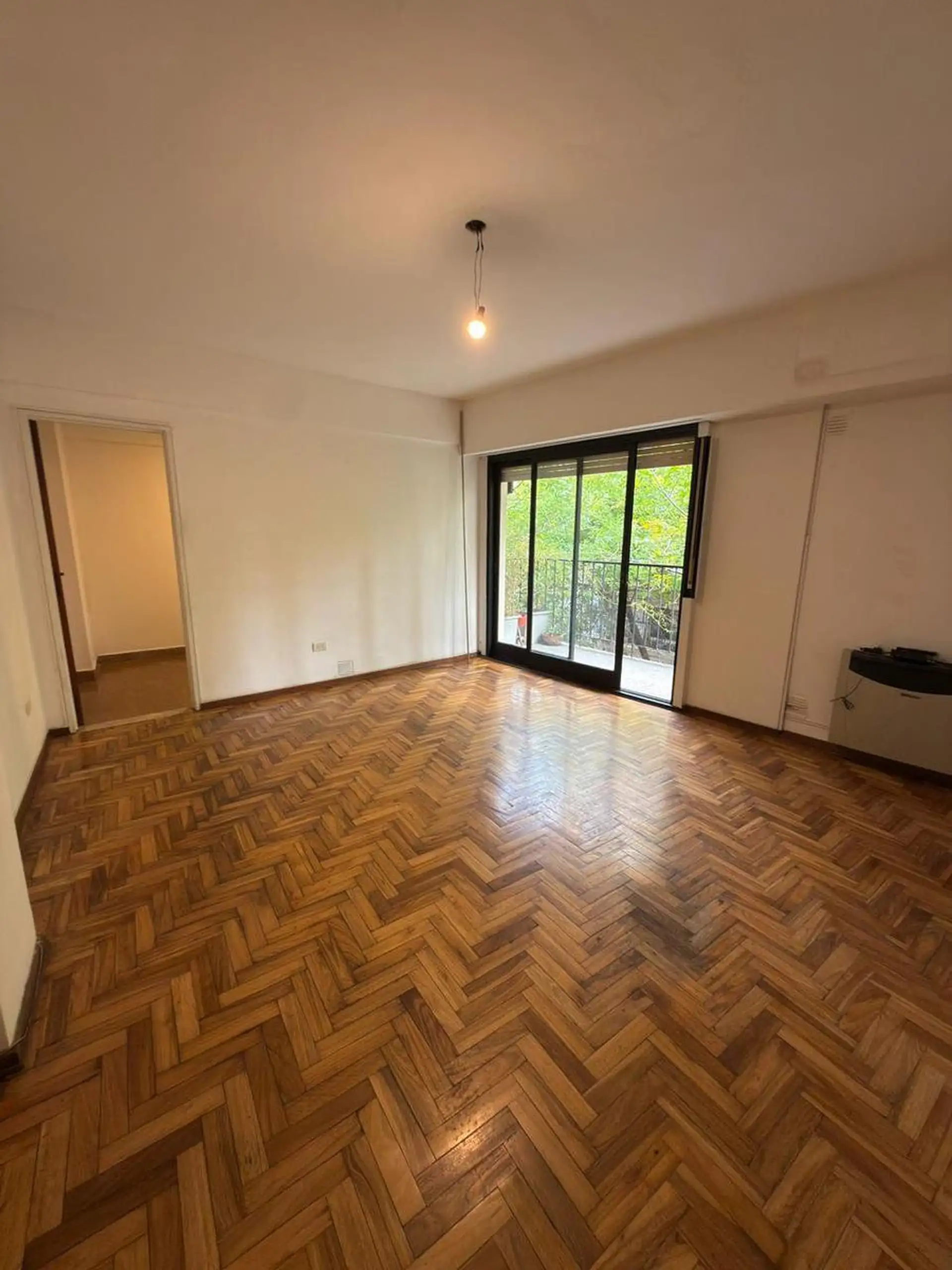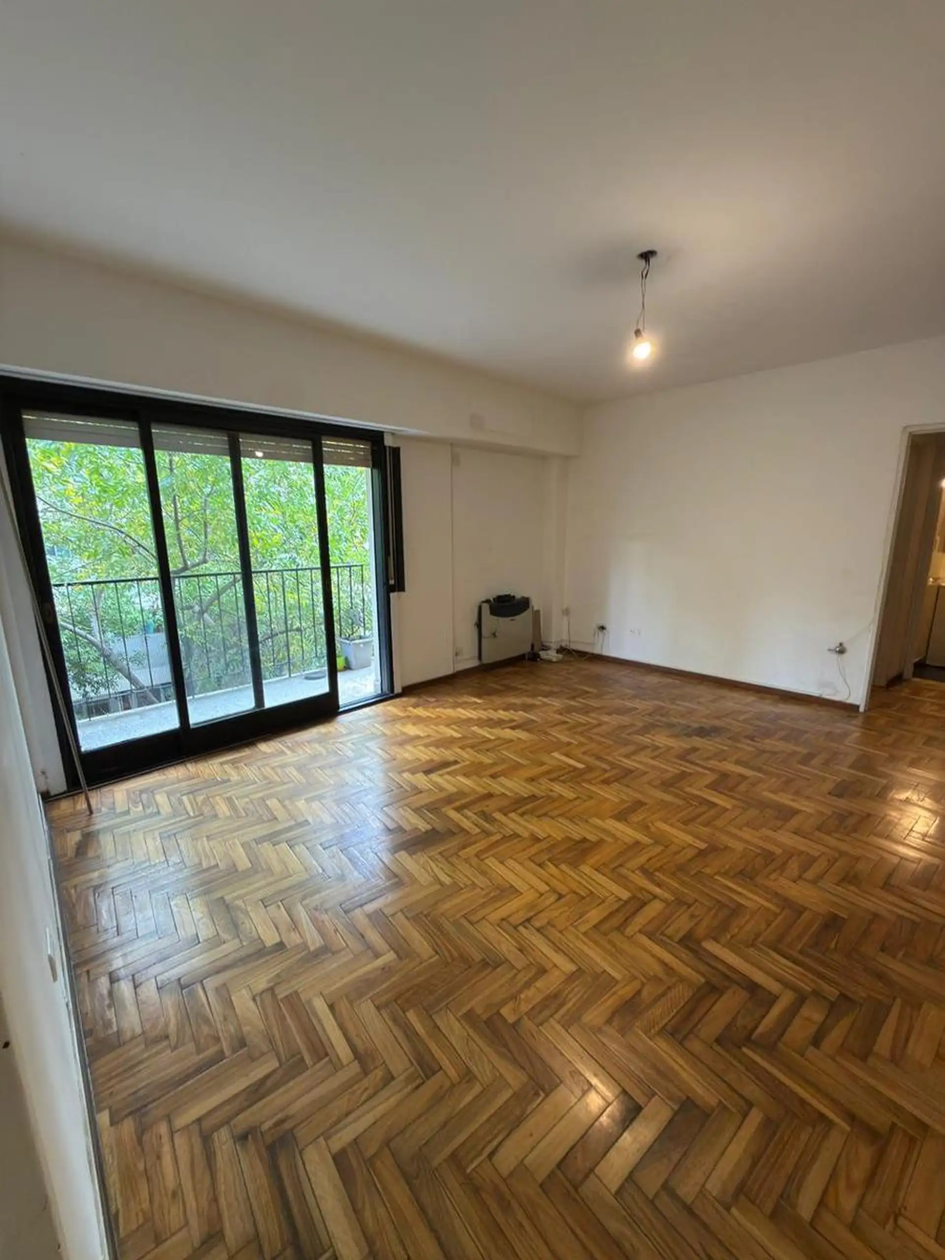Two-room apartment in Colegiales with a street-facing balcony off the living area. It has a large kitchen with space for a washing machine, a hall with a closet, one bedroom and a full bathroom. Parquet flooring throughout. Public transport includes colectivos 19, 39, 42, 63, 65, 71, 76, 90, 108, 140, 151, 168, 176, 184, Subte Line D at estación José Hernández a few blocks away, and Mitre Line at estación Colegiales.
