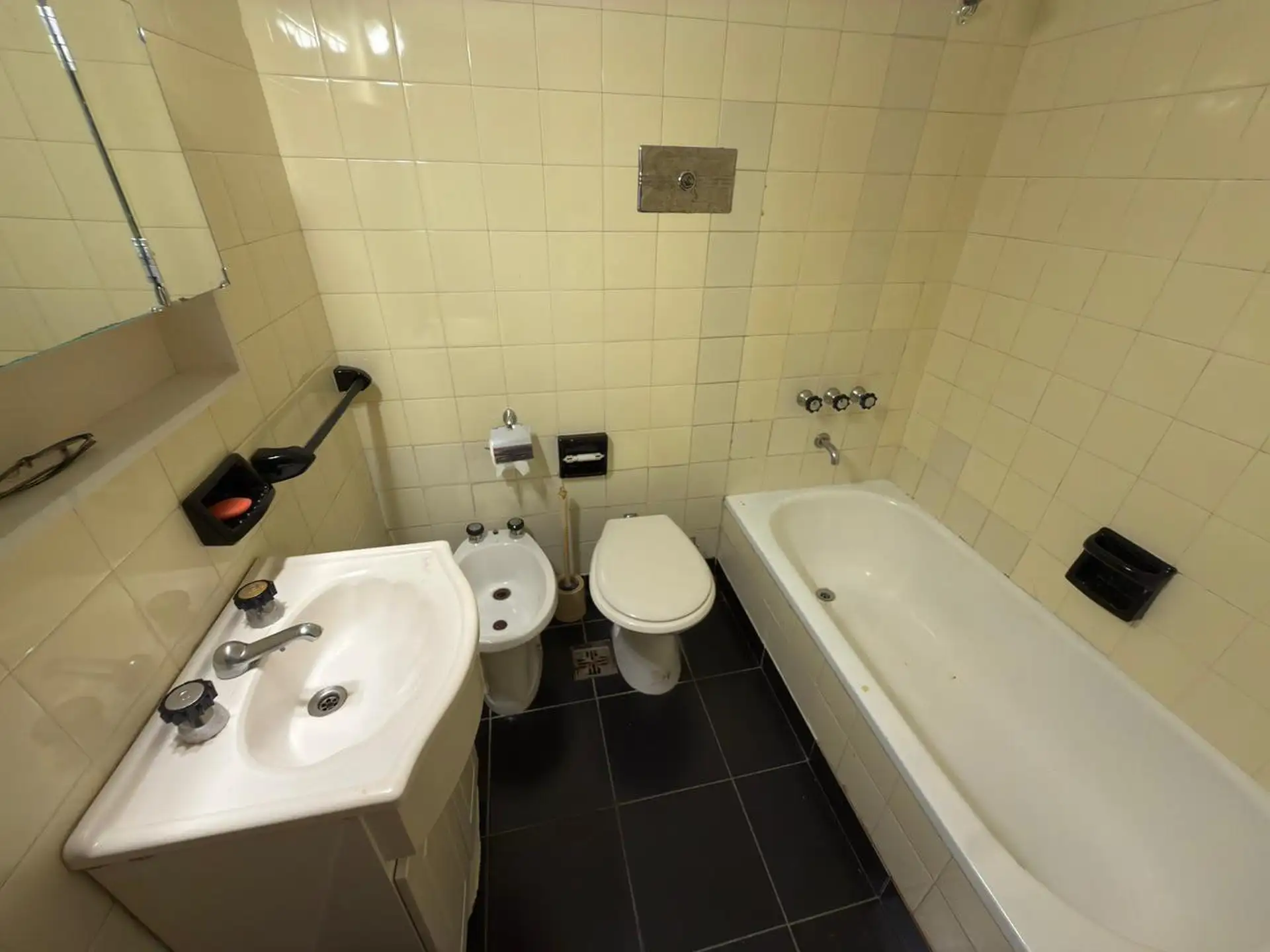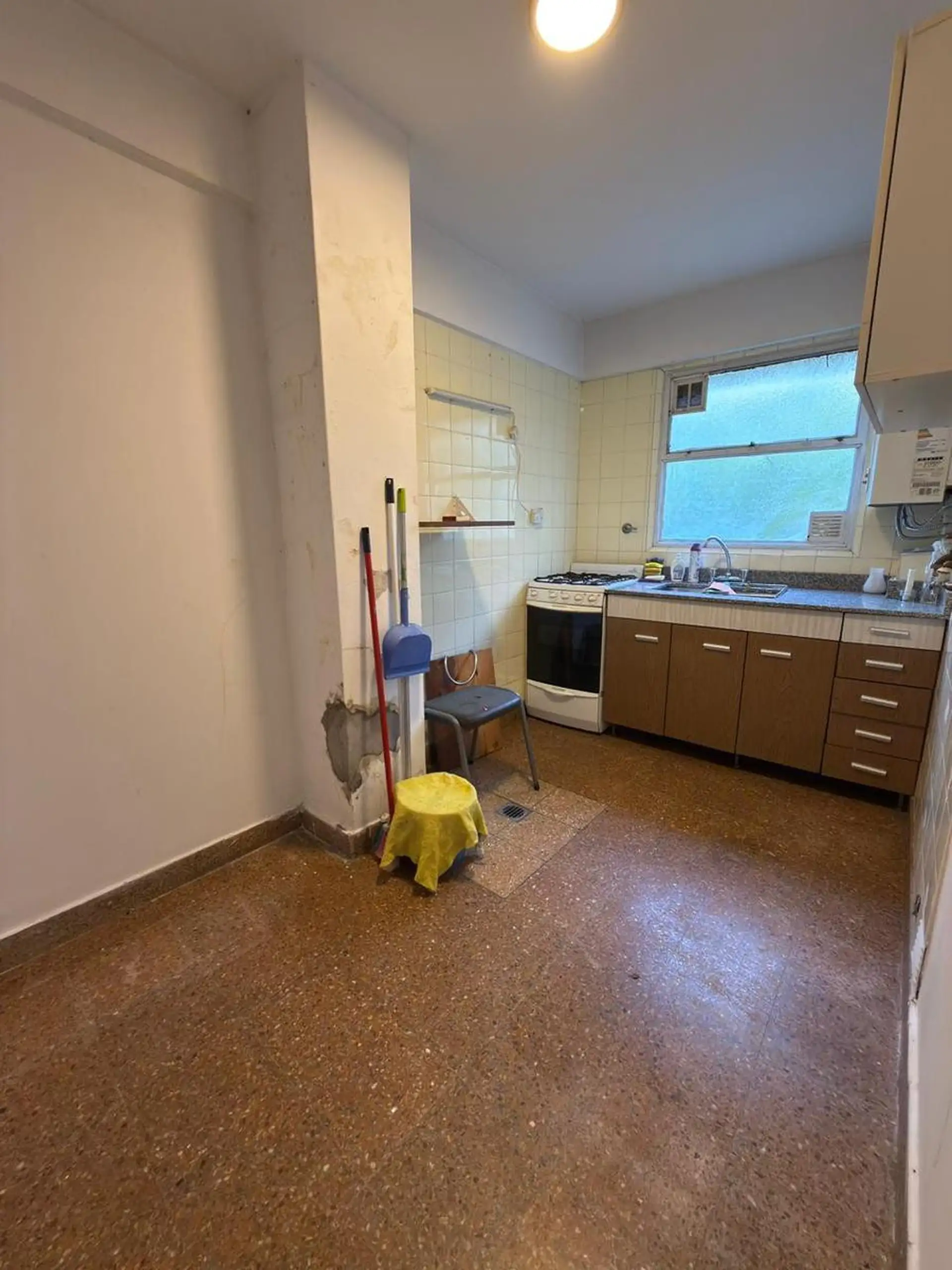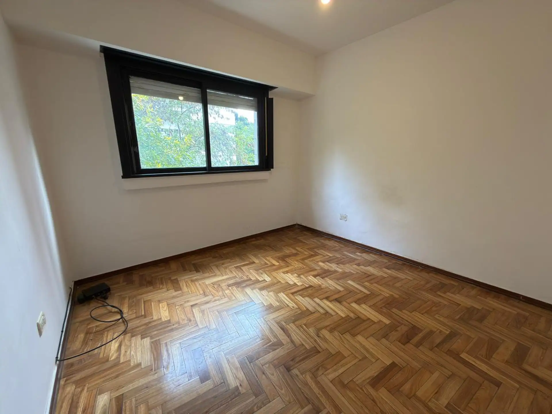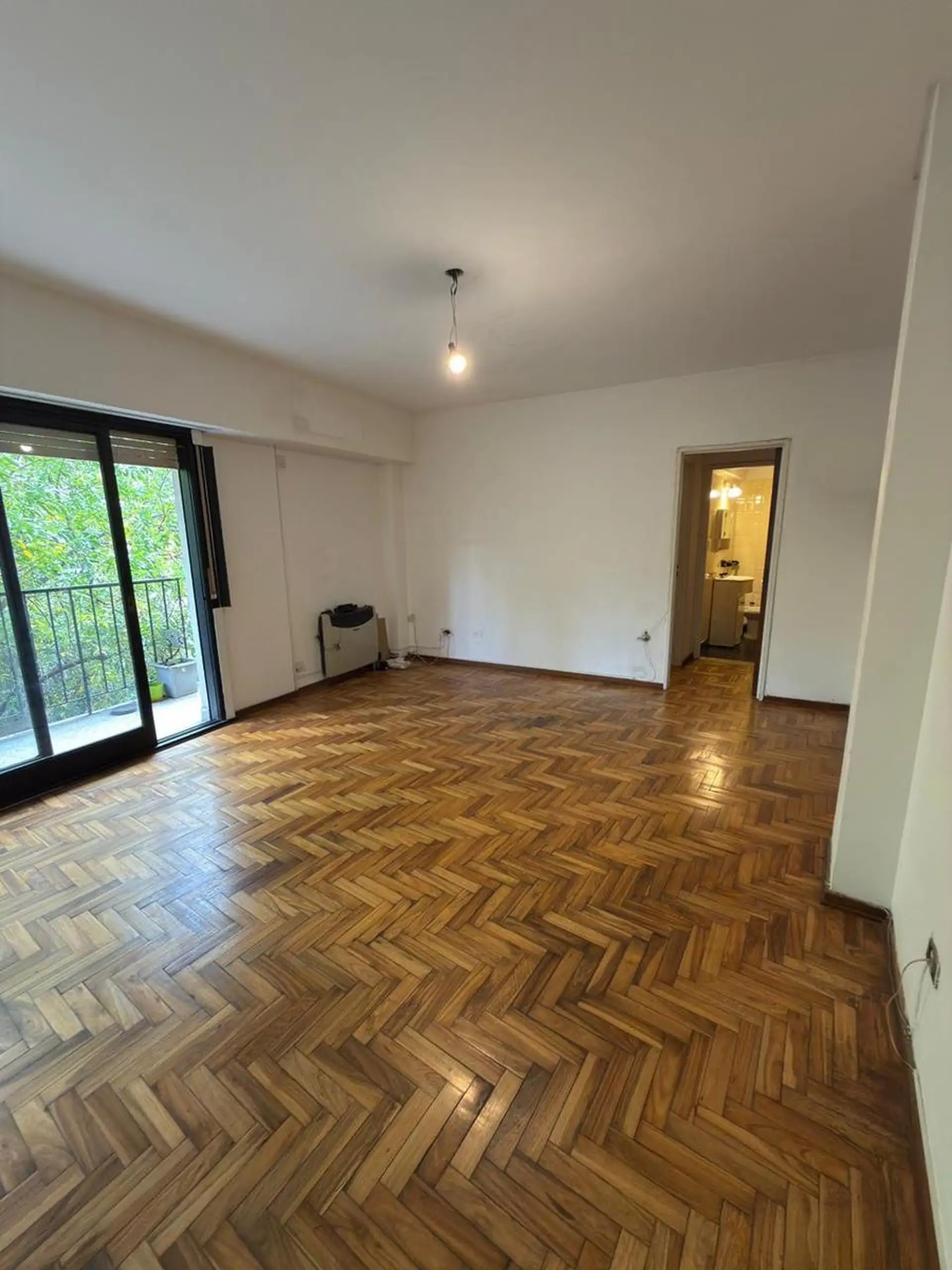 Two-room apartment in Colegiales with a street-facing balcony off the living area. It has a large kitchen with space for a washing machine, a hall with a closet, one bedroom and a full bathroom. Parquet flooring throughout. Public transport includes colectivos 19, 39, 42, 63, 65, 71, 76, 90, 108, 140, 151, 168, 176, 184, Subte Line D at estación José Hernández a few blocks away, and Mitre Line at estación Colegiales.