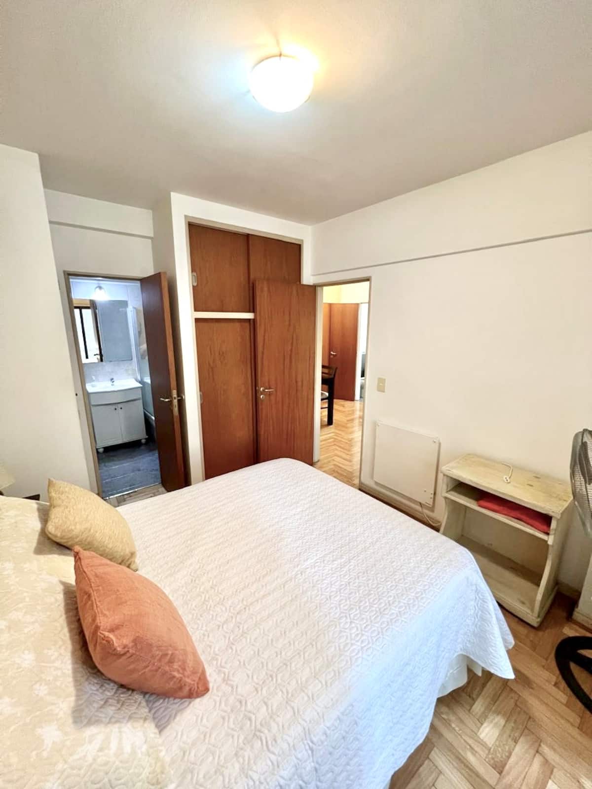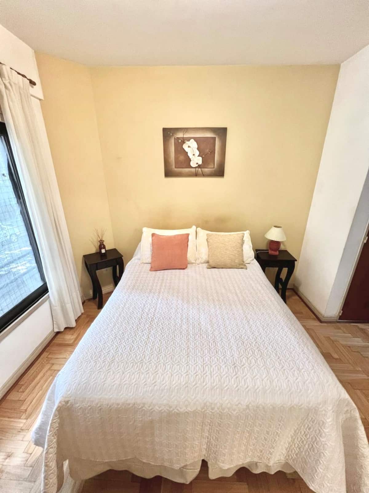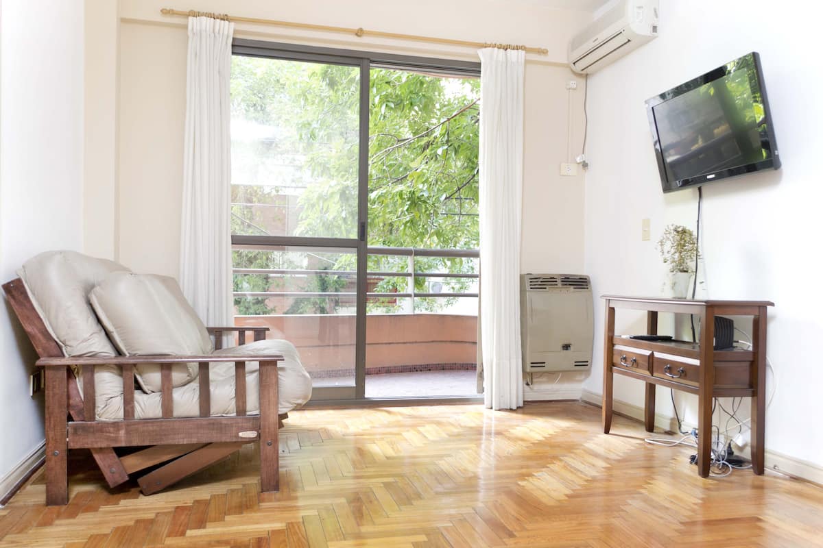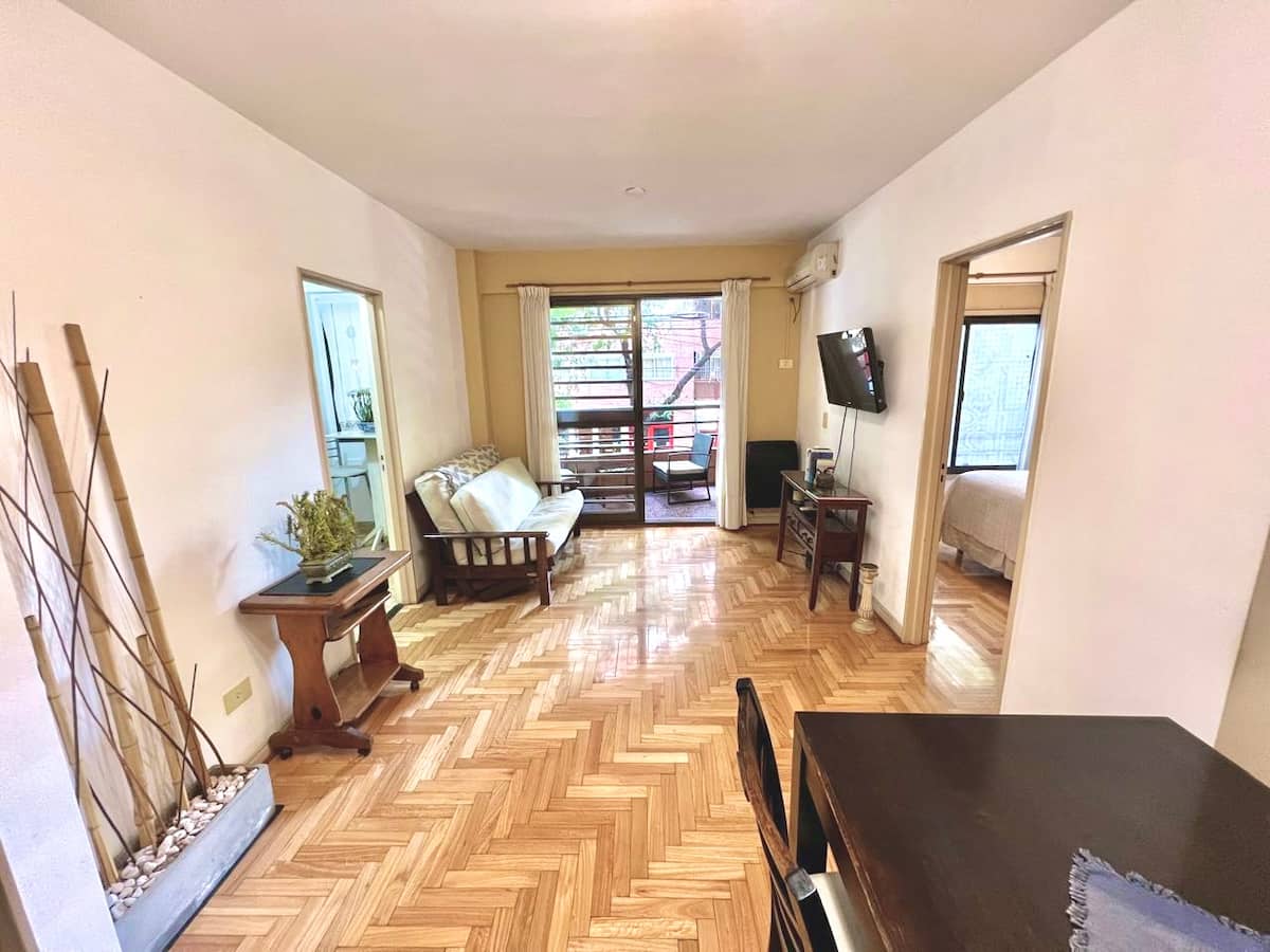Furnished, fully equipped one-bedroom apartment in Colegiales. Street-facing rooms with an en-suite master bedroom featuring a queen-size bed, TV, closets and linens; the bathroom includes a full bathtub, bidet and storage. The living room has a balcony, cable, Wi-Fi (internet), air conditioning and heating, a telephone, and a sofa that converts into a double bed; there is also a reception toilet. The kitchen includes a fridge, freezer, microwave, toaster, iron, coffee maker and blender. The apa