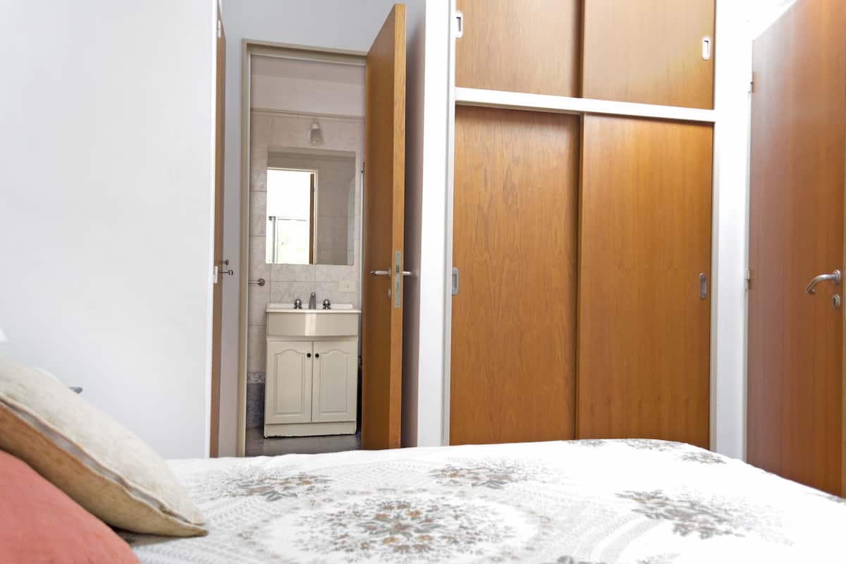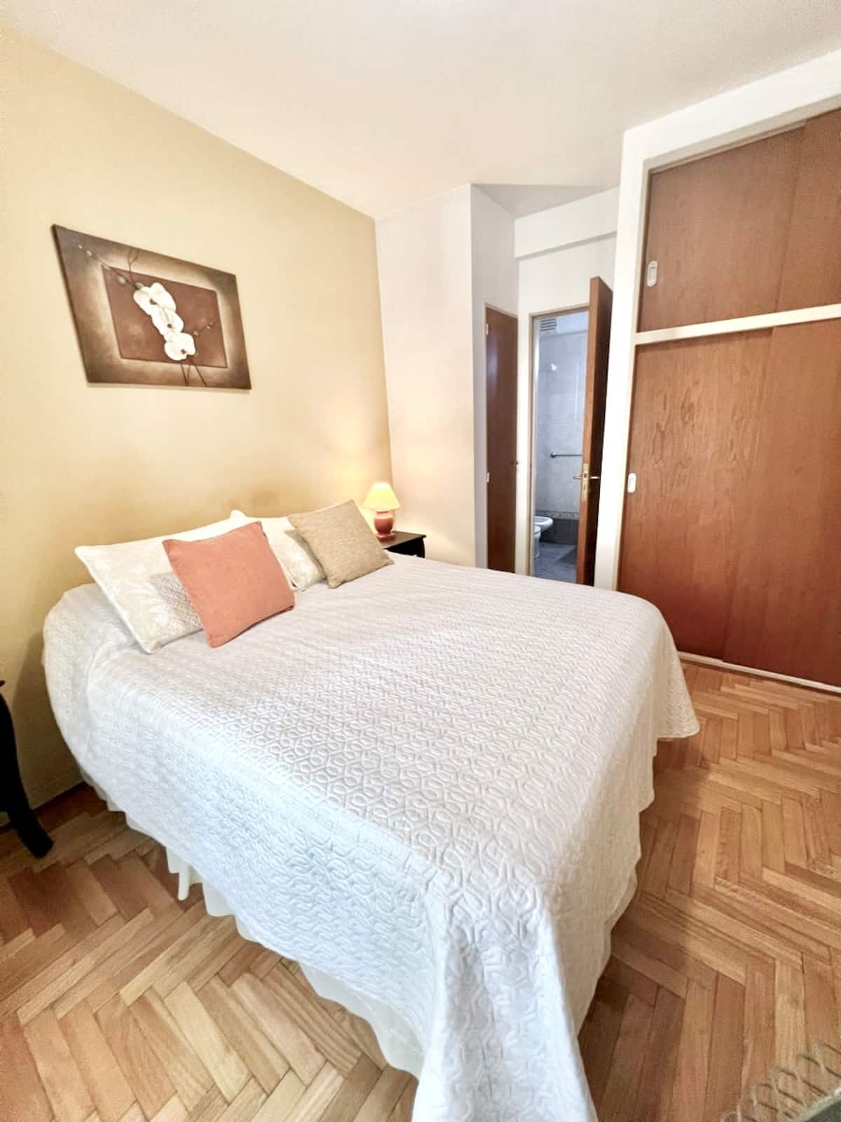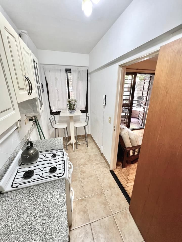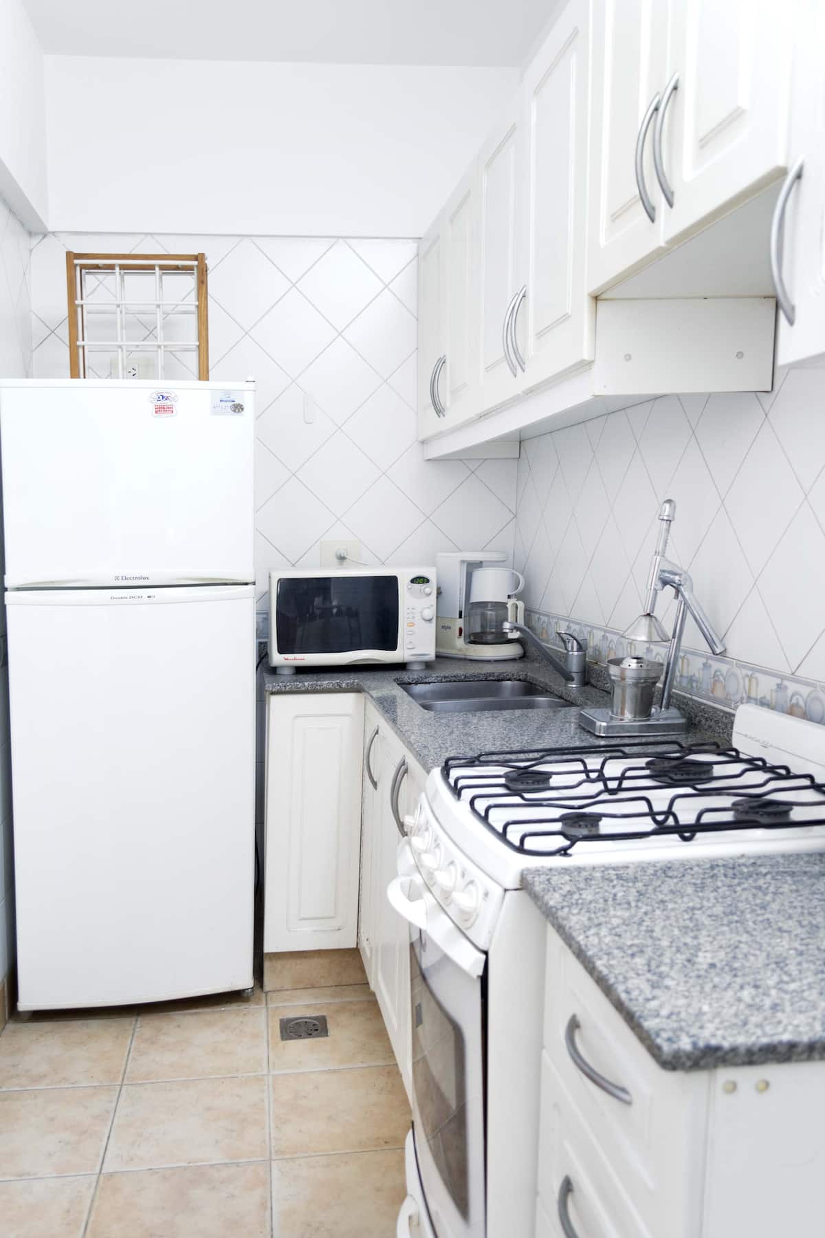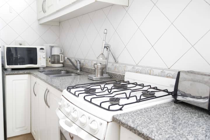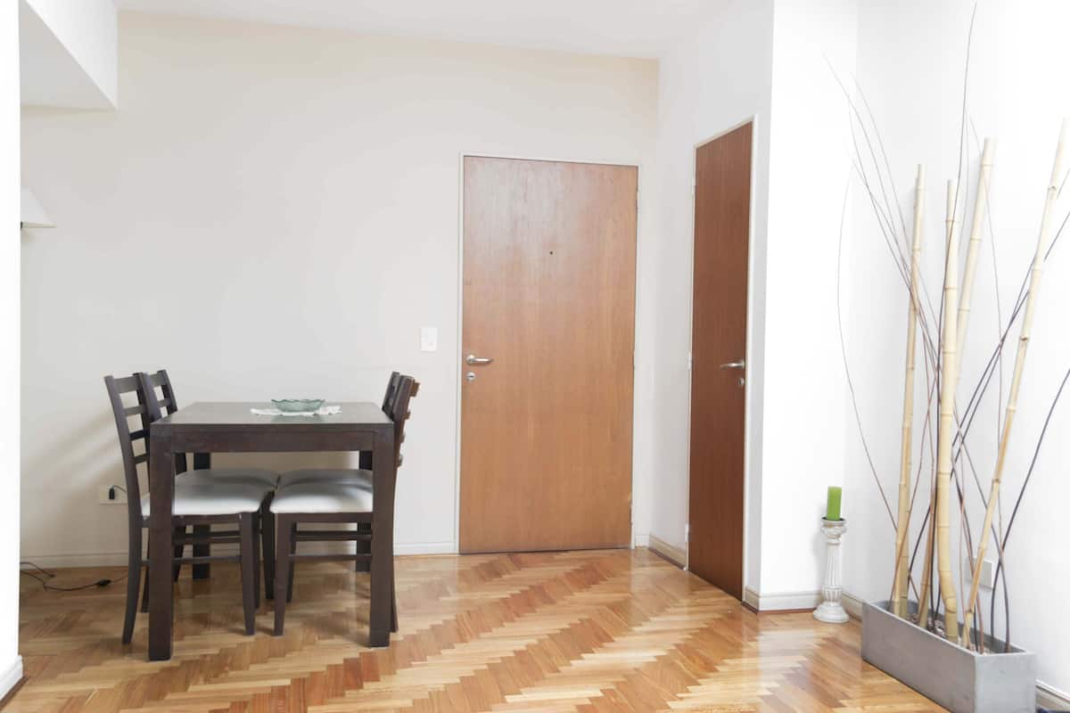 Furnished, fully equipped one-bedroom apartment in Colegiales. Street-facing rooms with an en-suite master bedroom featuring a queen-size bed, TV, closets and linens; the bathroom includes a full bathtub, bidet and storage. The living room has a balcony, cable, Wi-Fi (internet), air conditioning and heating, a telephone, and a sofa that converts into a double bed; there is also a reception toilet. The kitchen includes a fridge, freezer, microwave, toaster, iron, coffee maker and blender. The apa
