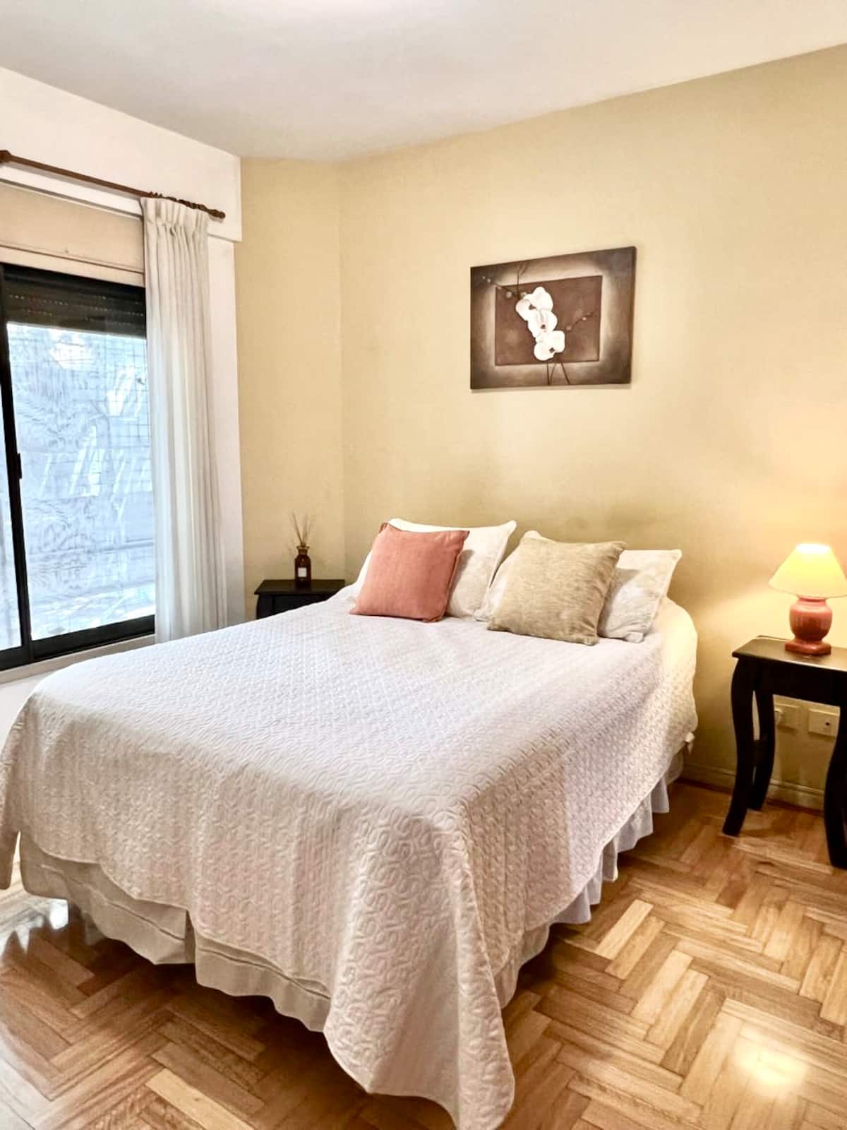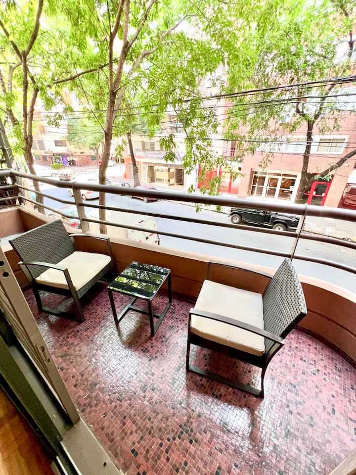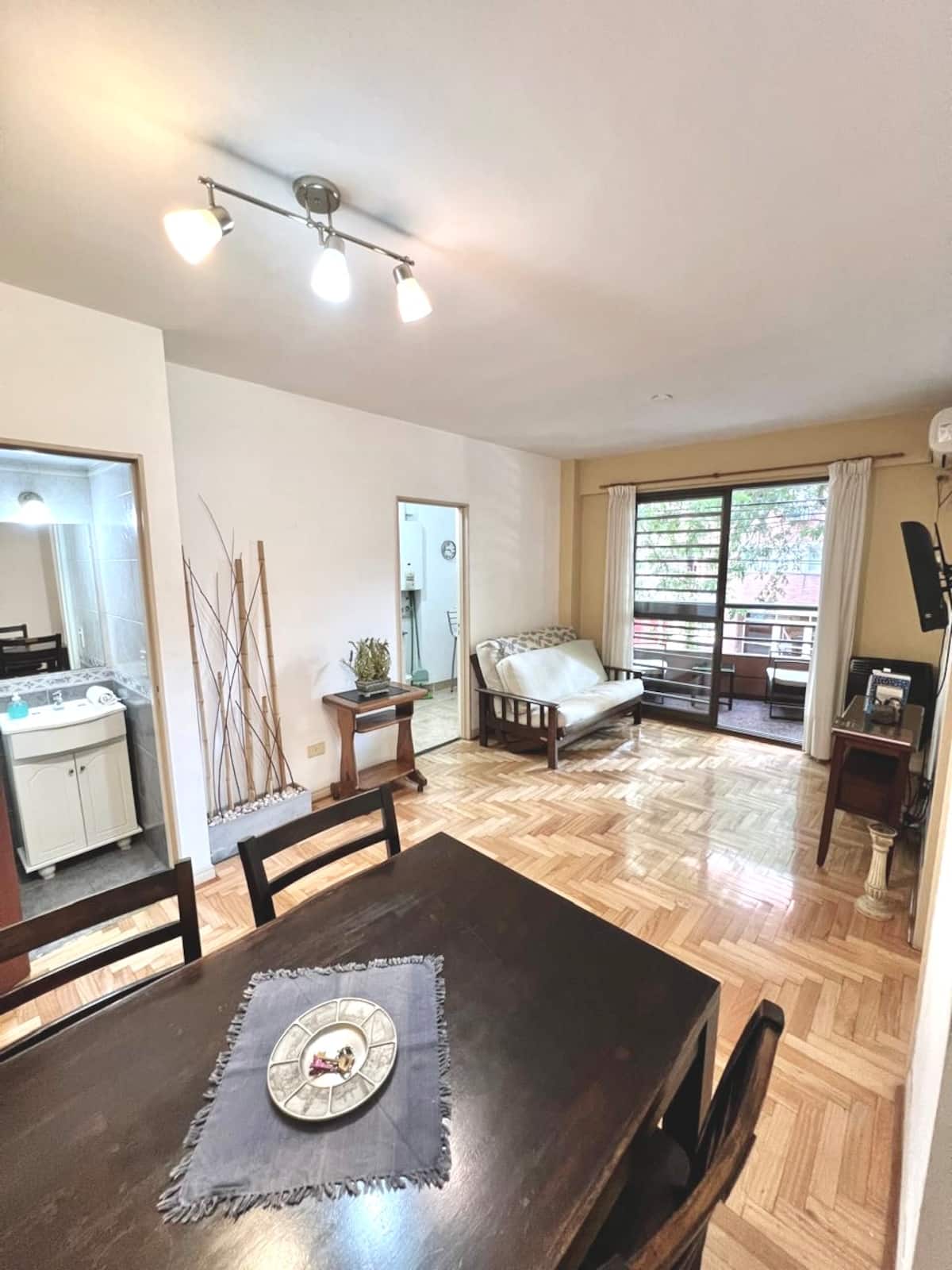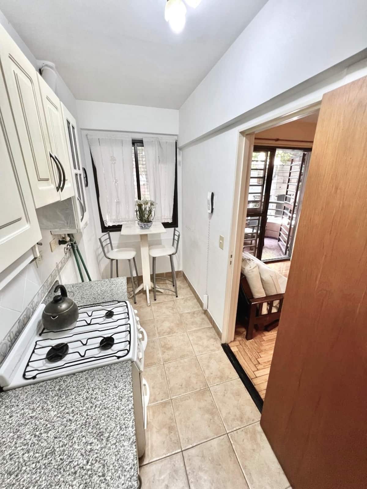 Furnished, fully equipped one-bedroom apartment in Colegiales. Street-facing rooms with an en-suite master bedroom featuring a queen-size bed, TV, closets and linens; the bathroom includes a full bathtub, bidet and storage. The living room has a balcony, cable, Wi-Fi (internet), air conditioning and heating, a telephone, and a sofa that converts into a double bed; there is also a reception toilet. The kitchen includes a fridge, freezer, microwave, toaster, iron, coffee maker and blender. The apa