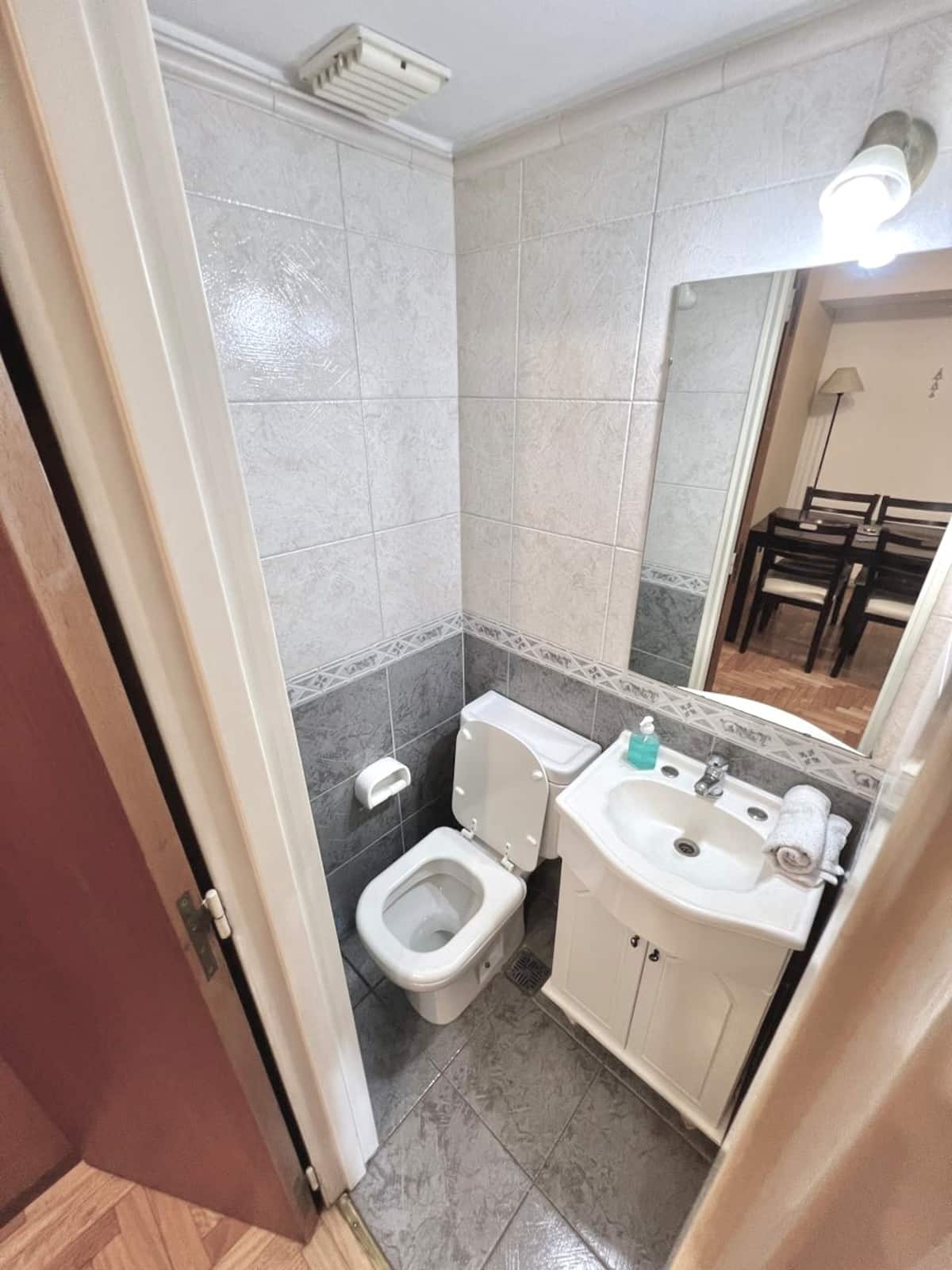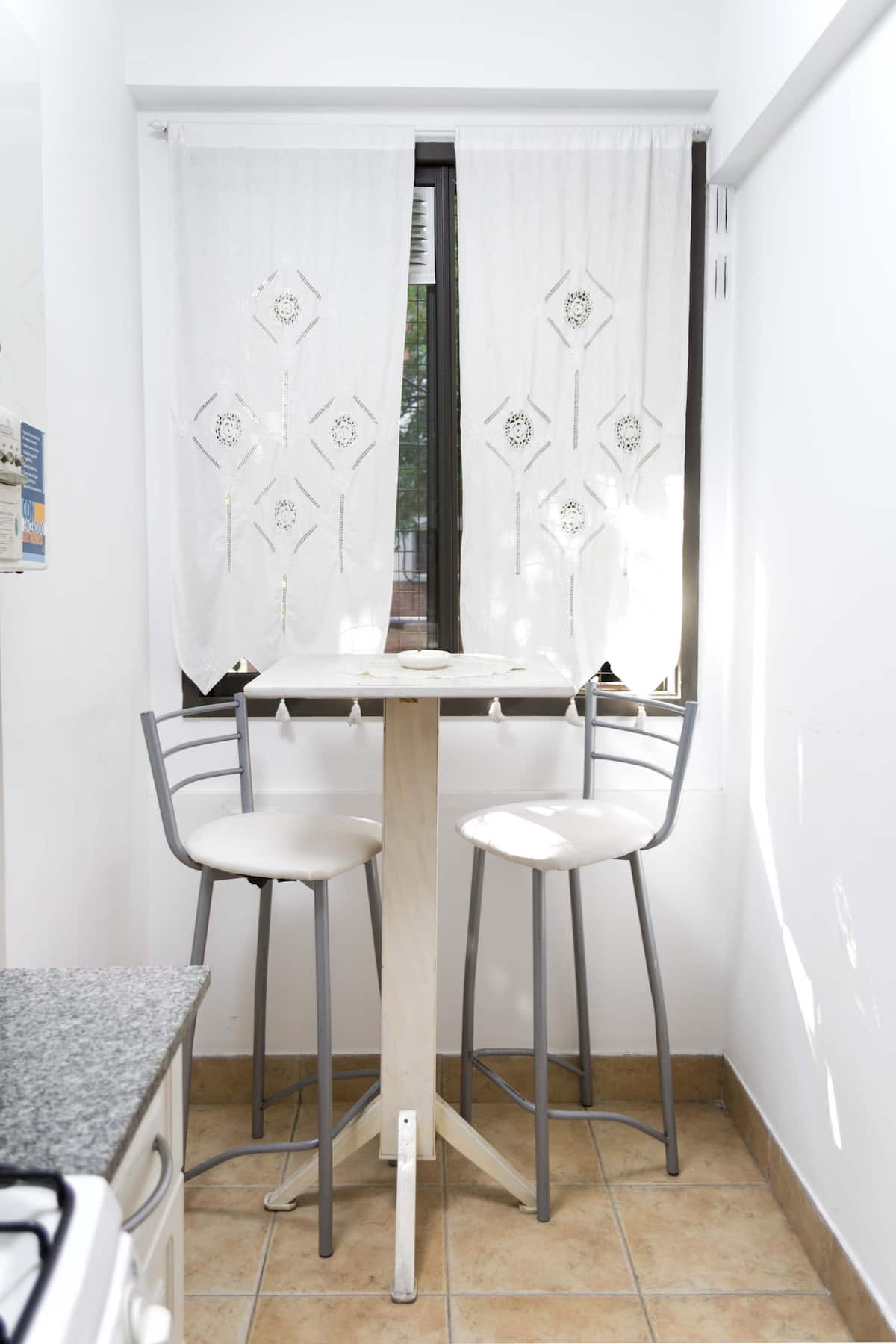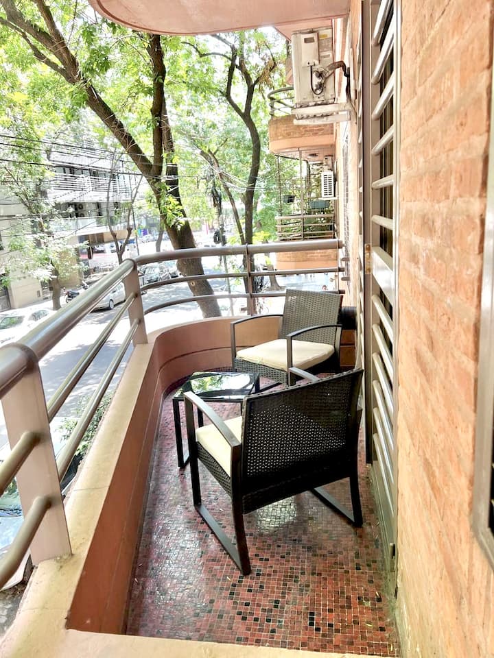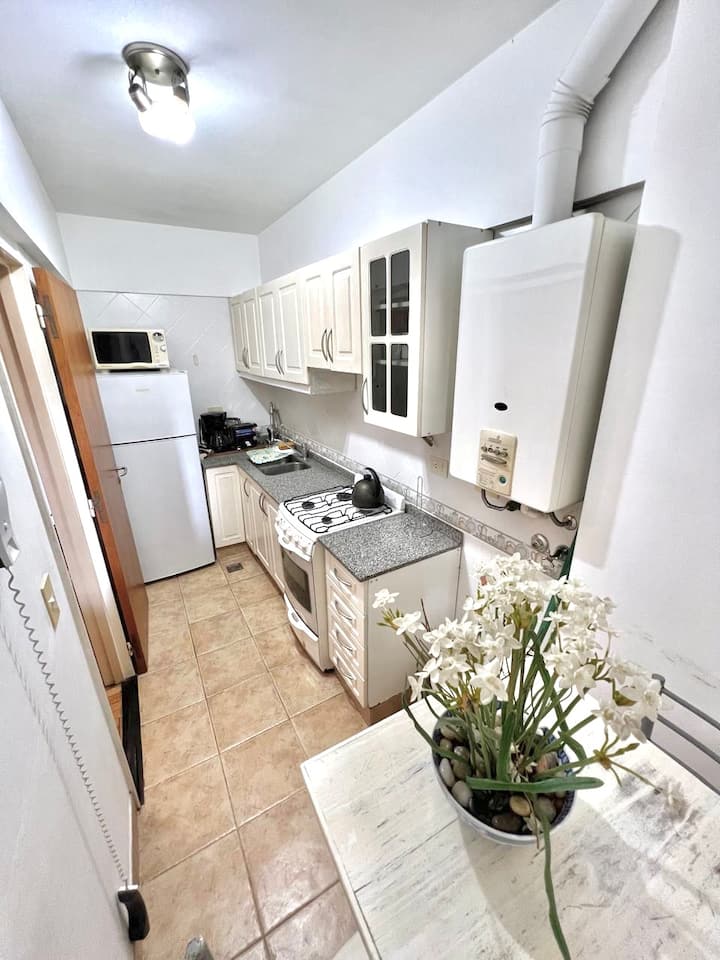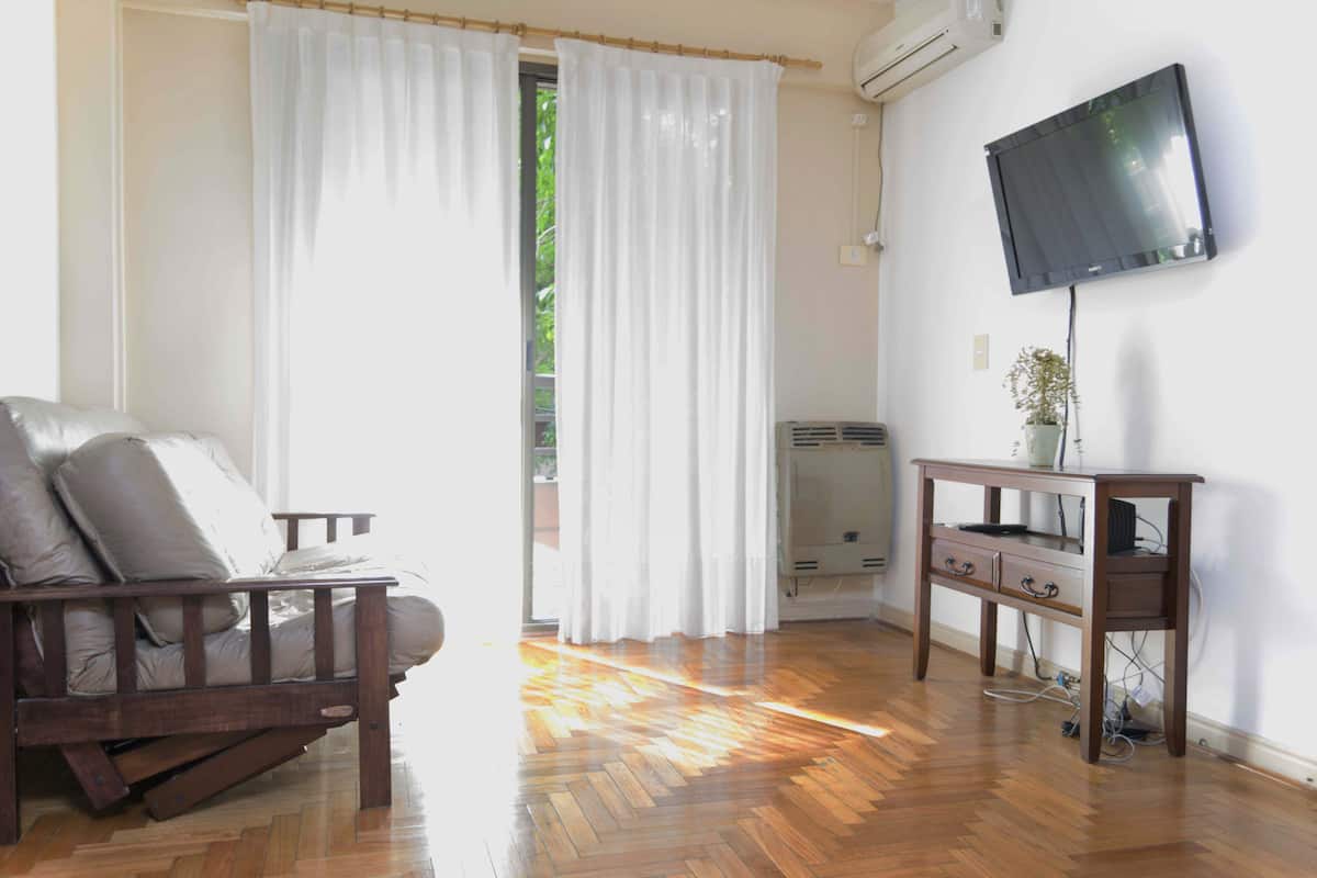 Furnished, fully equipped one-bedroom apartment in Colegiales. Street-facing rooms with an en-suite master bedroom featuring a queen-size bed, TV, closets and linens; the bathroom includes a full bathtub, bidet and storage. The living room has a balcony, cable, Wi-Fi (internet), air conditioning and heating, a telephone, and a sofa that converts into a double bed; there is also a reception toilet. The kitchen includes a fridge, freezer, microwave, toaster, iron, coffee maker and blender. The apa