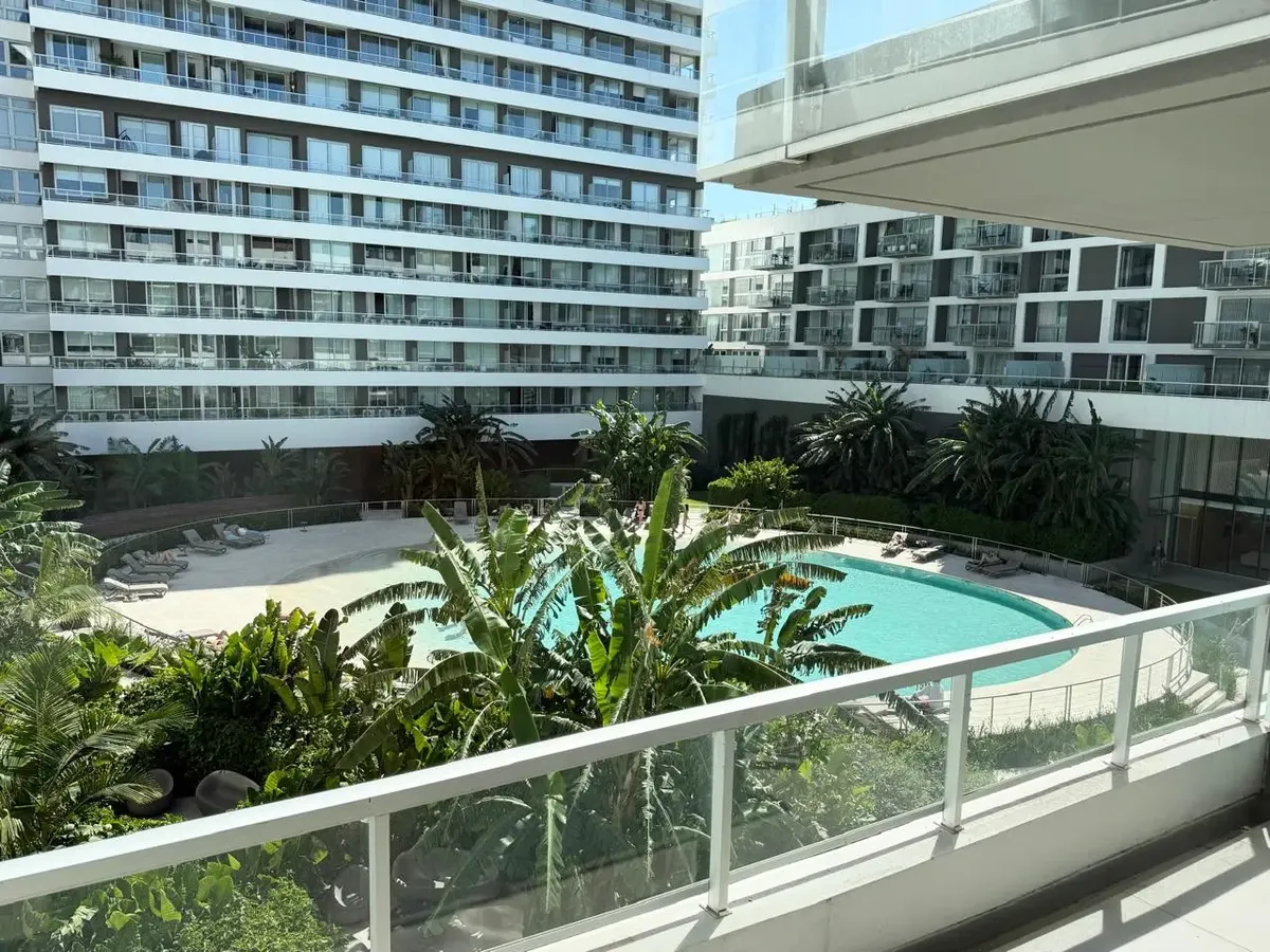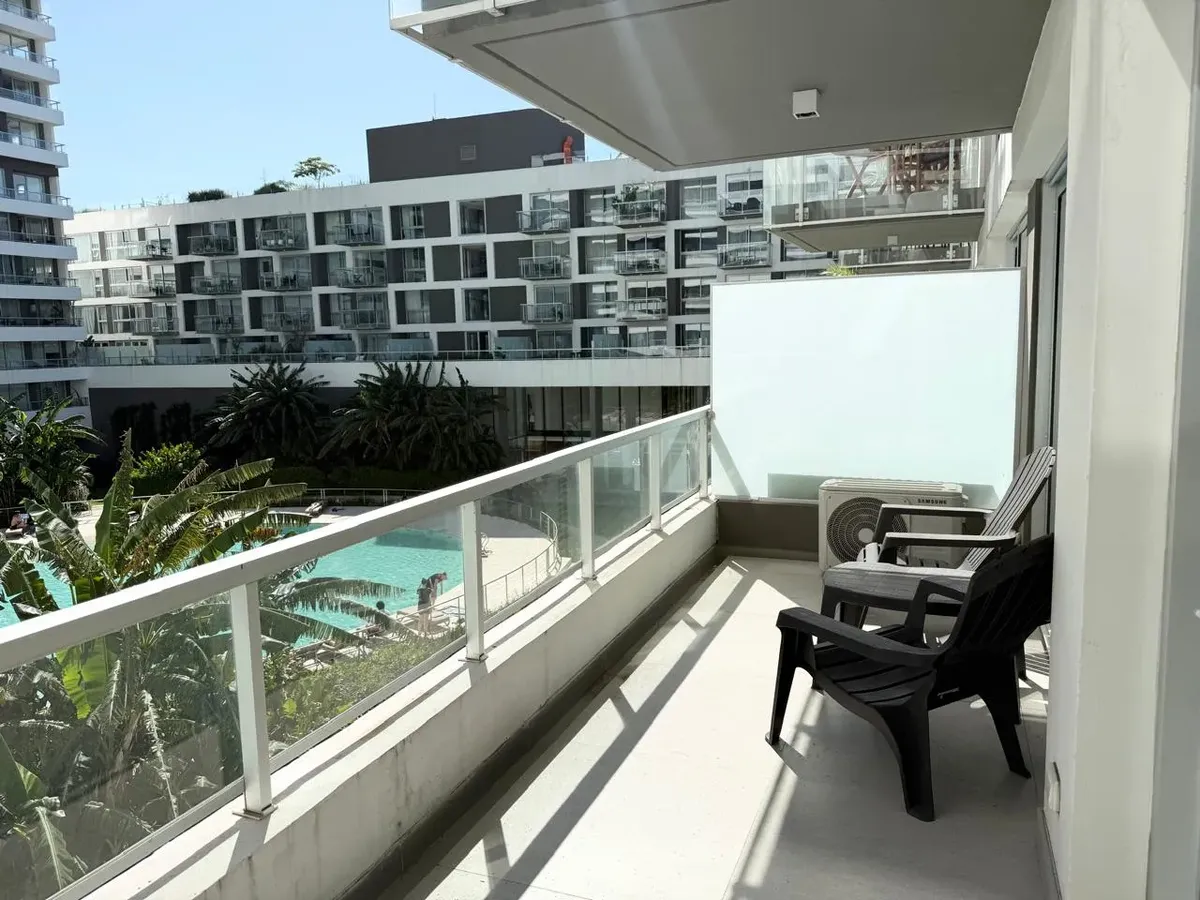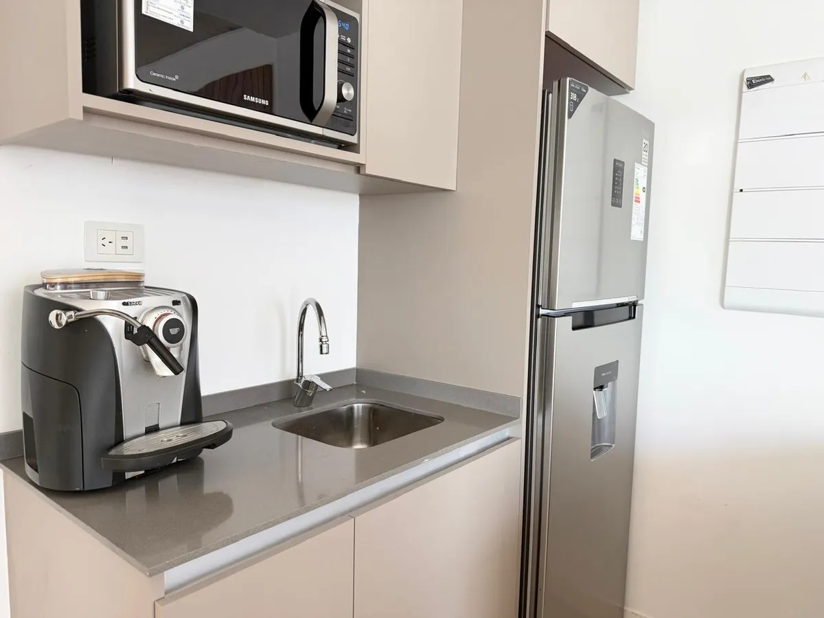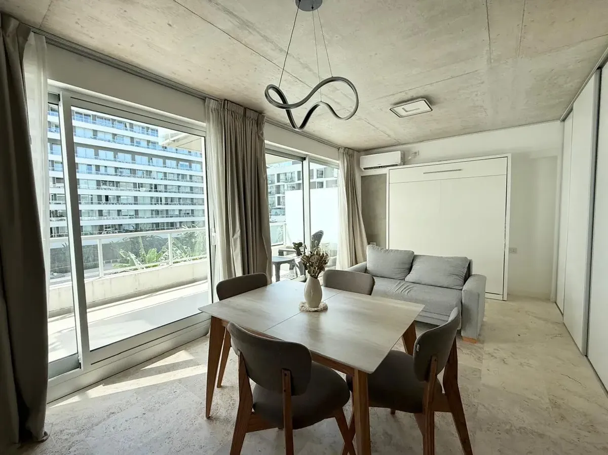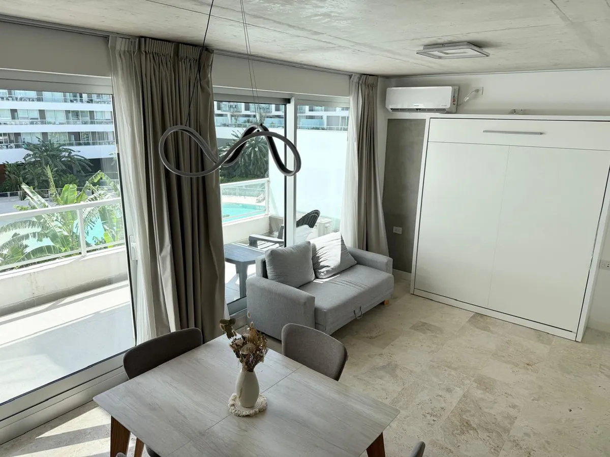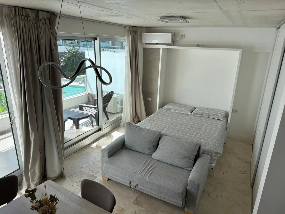 Studio apartment with 1 bathroom in a Concepción Live complex in Colegiales, furnished and equipped. It has an integrated living-dining area with access to a terrace-like balcony, and a kitchen within the same space; the bedroom area is set up with a fold-down bed and floor-to-ceiling wardrobes. The building offers outdoor pool, heated indoor pool, jacuzzi, spa with sauna, gym, coworking areas, private cinema, event rooms, games room, laundry and landscaped green areas. Monthly rent does not inc