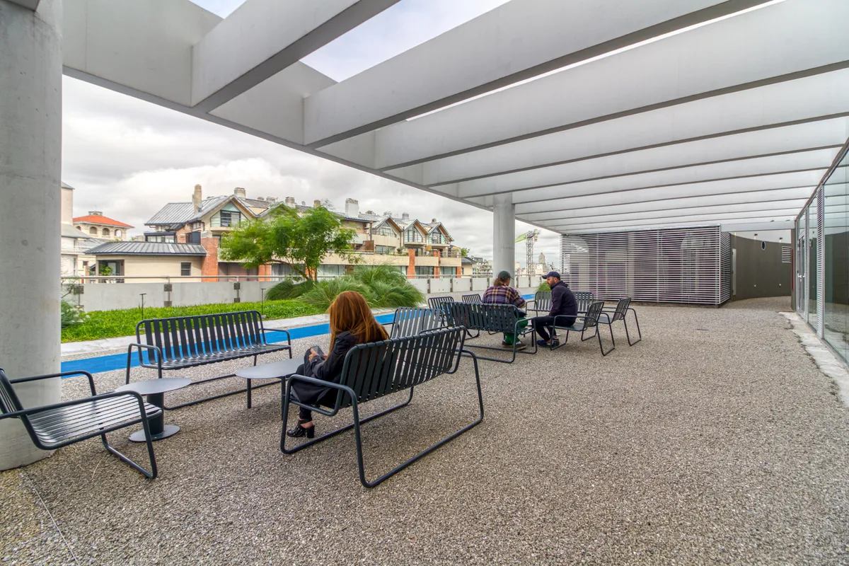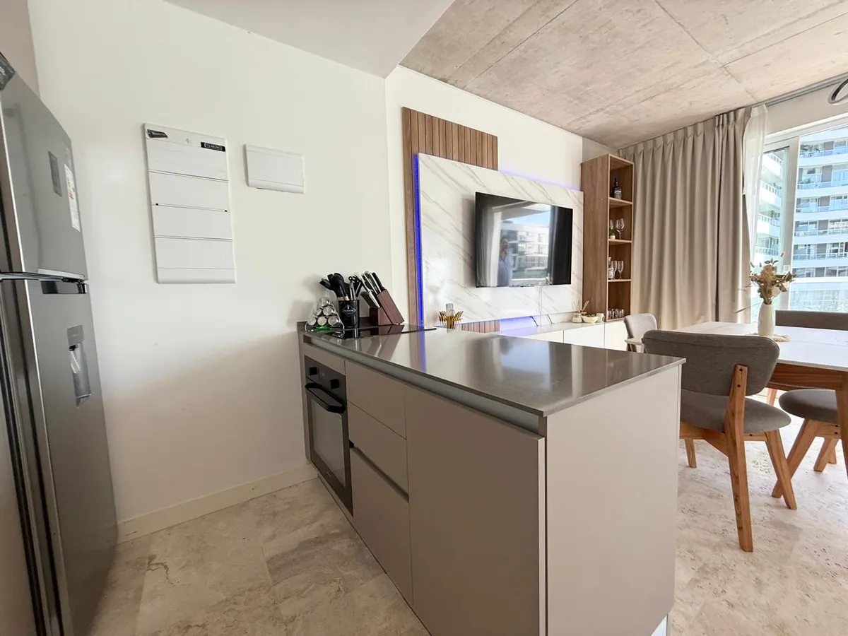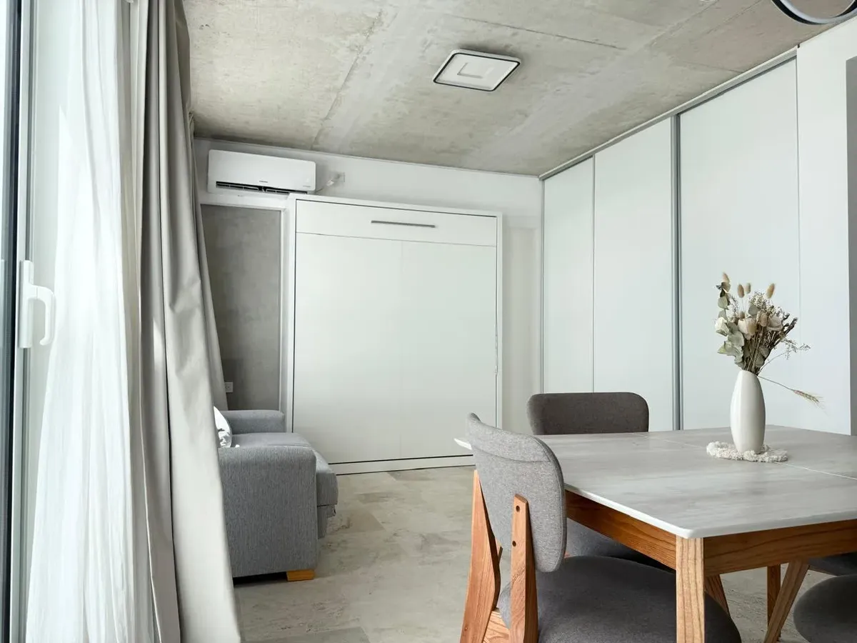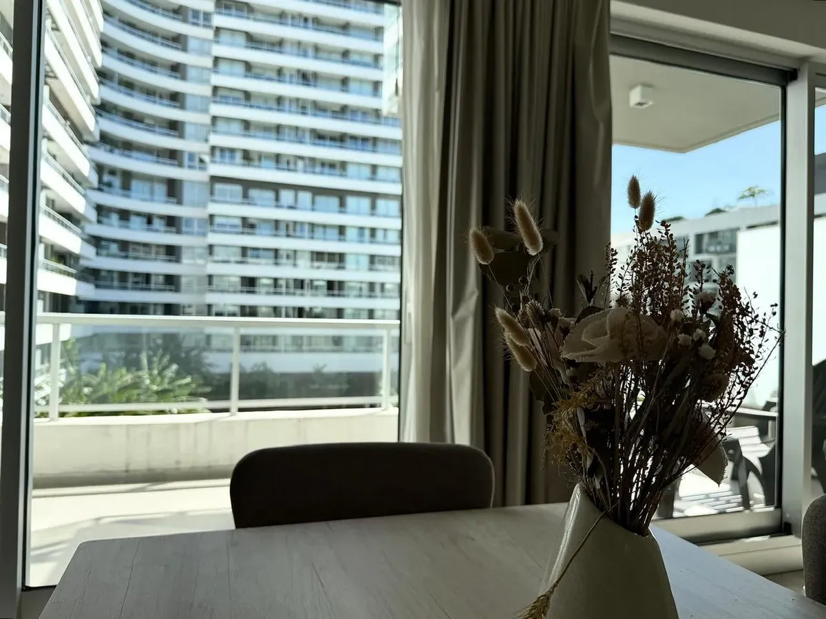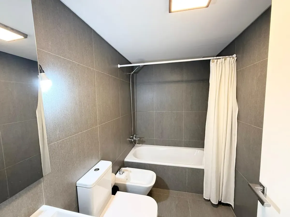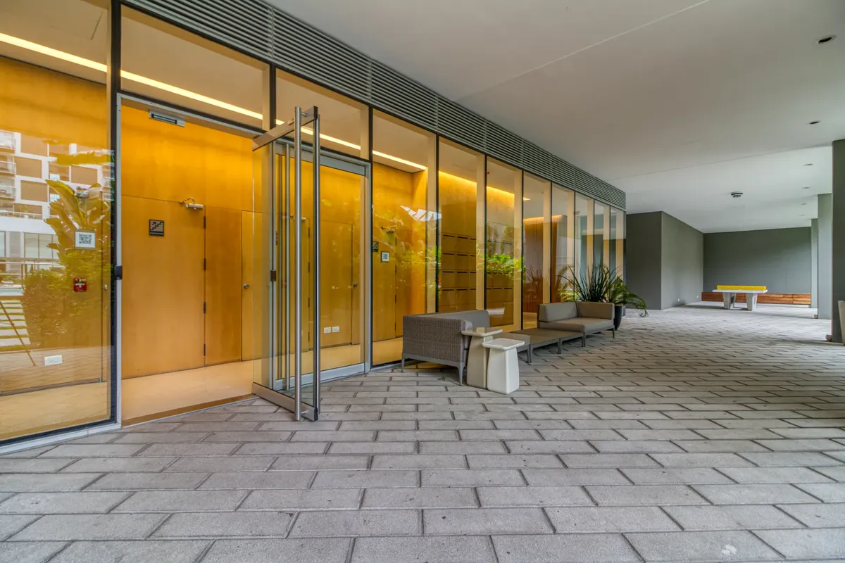 Studio apartment with 1 bathroom in a Concepción Live complex in Colegiales, furnished and equipped. It has an integrated living-dining area with access to a terrace-like balcony, and a kitchen within the same space; the bedroom area is set up with a fold-down bed and floor-to-ceiling wardrobes. The building offers outdoor pool, heated indoor pool, jacuzzi, spa with sauna, gym, coworking areas, private cinema, event rooms, games room, laundry and landscaped green areas. Monthly rent does not inc