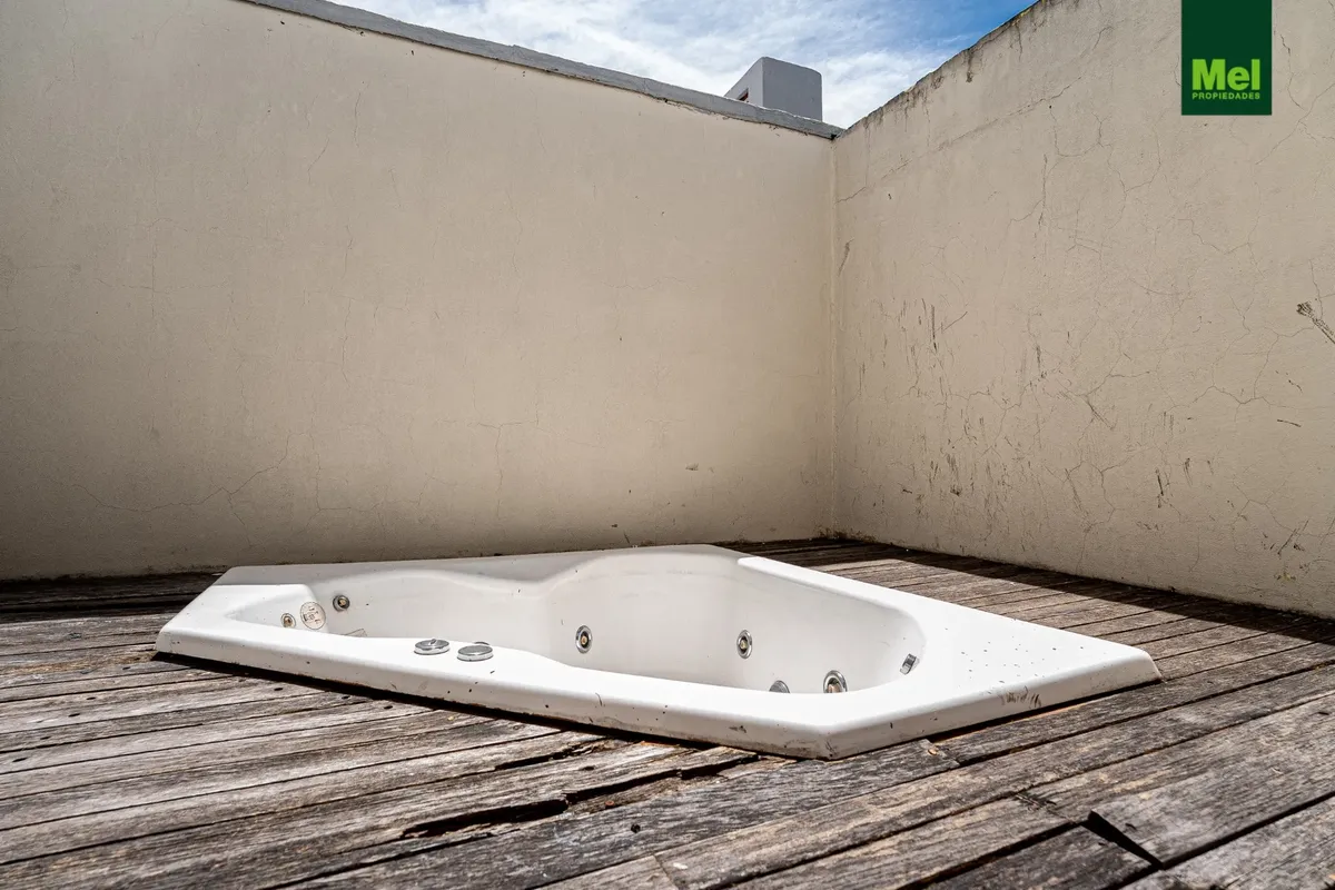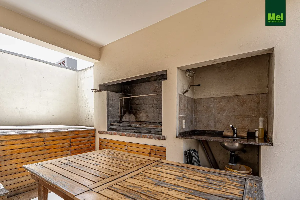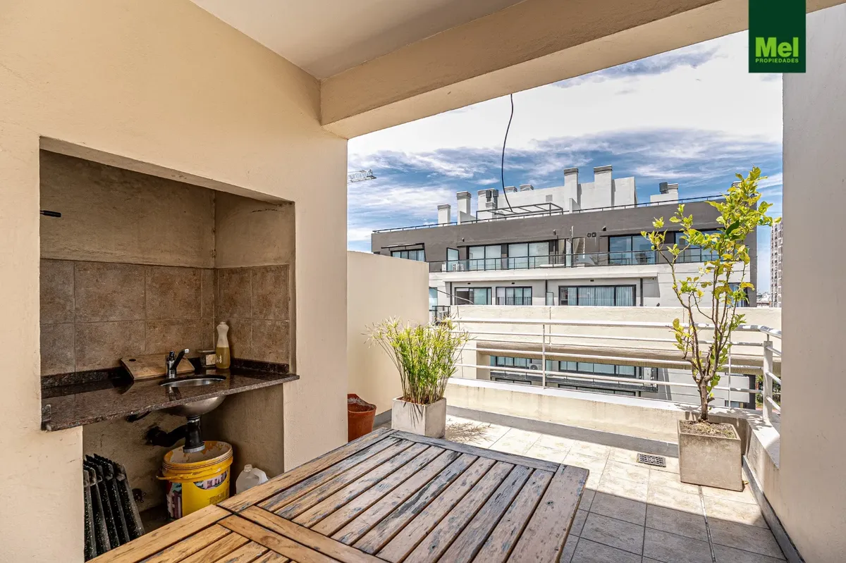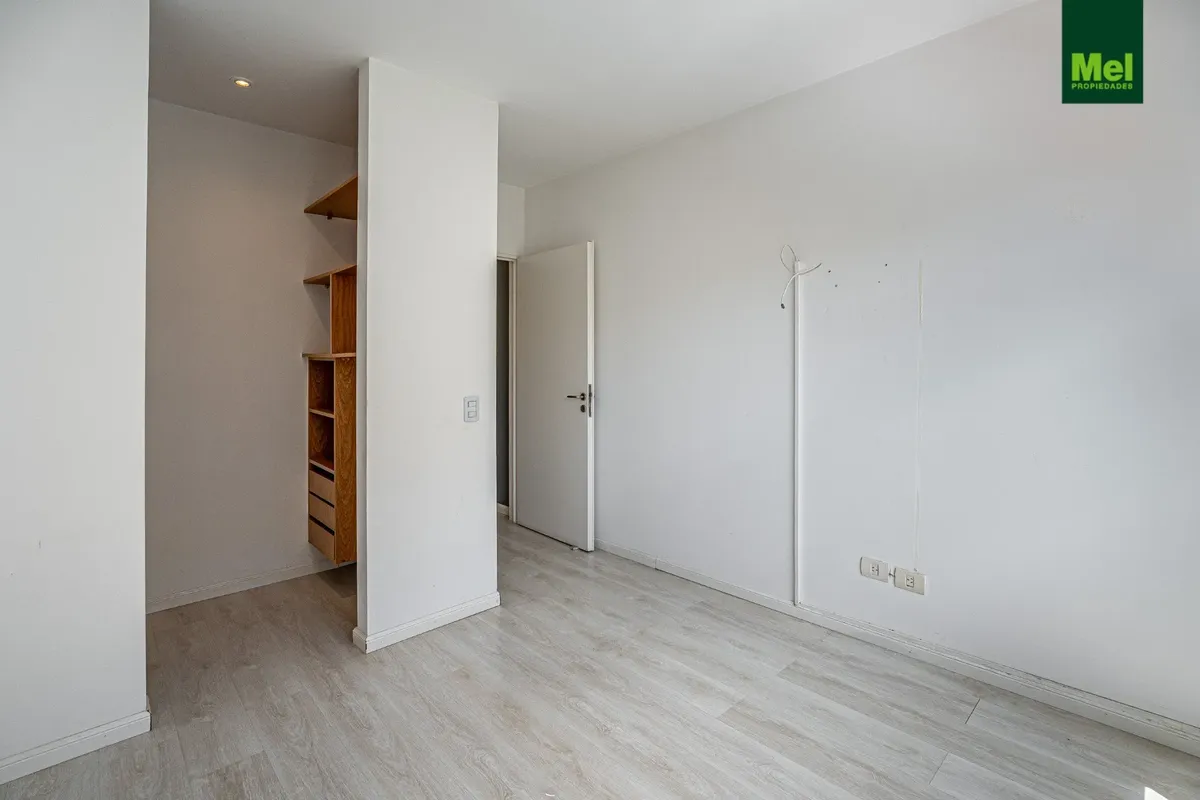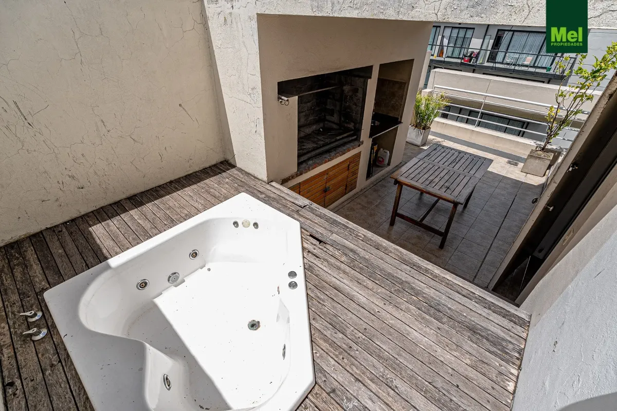 Two-room apartment with 1 bedroom in Colegiales. The unit has a living-dining room with access to a balcony, a fully equipped integrated kitchen with electric cooktop (anafe) and oven, and a full bathroom. The bedroom includes a walk-in closet and there is a storage room (baulera). Building amenities include a grill area, solarium and jacuzzi.