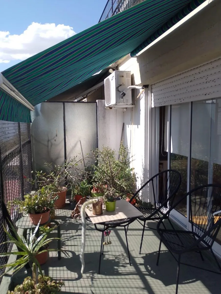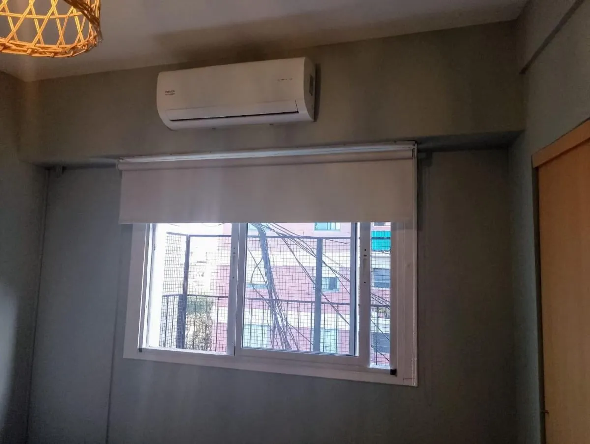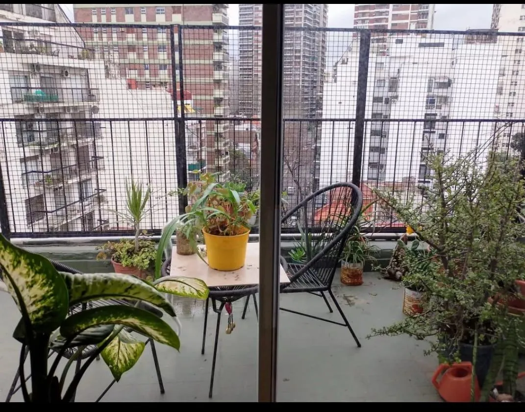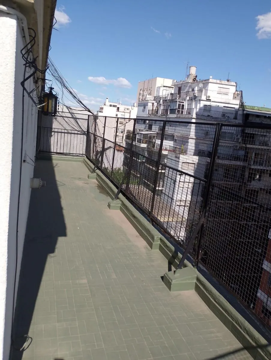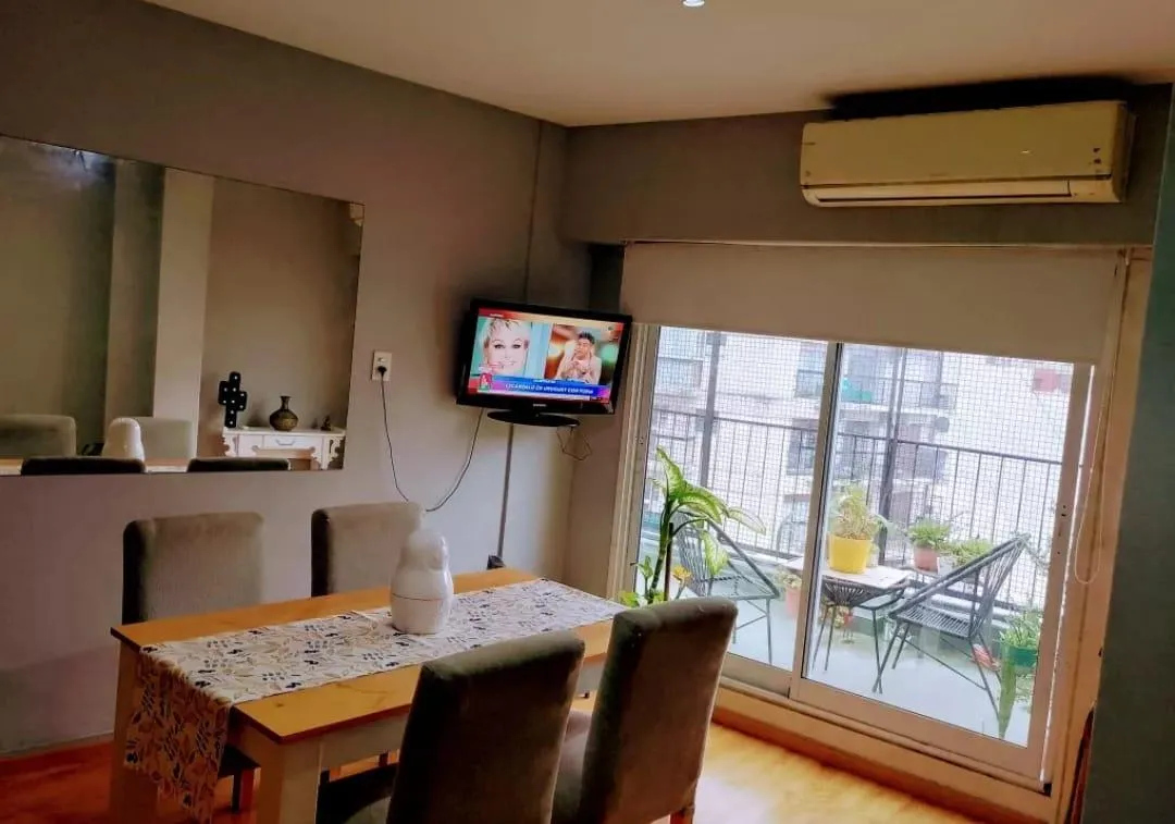 One-bedroom apartment on a high floor in Colegiales, not on the top floor. It has a terrace balcony measuring 7 x 4 m, street-facing views of the avenue, and enclosed windows with sound insulation and blackout curtains. Separate fully equipped kitchen with fridge-freezer, gas stove and oven, cookware and tableware, plus pantry and under-counter storage. Living-dining area with extendable dining table, TV, Wi-Fi, and an air-conditioning unit with hot/cold, while the bedroom has a queen bed with s
