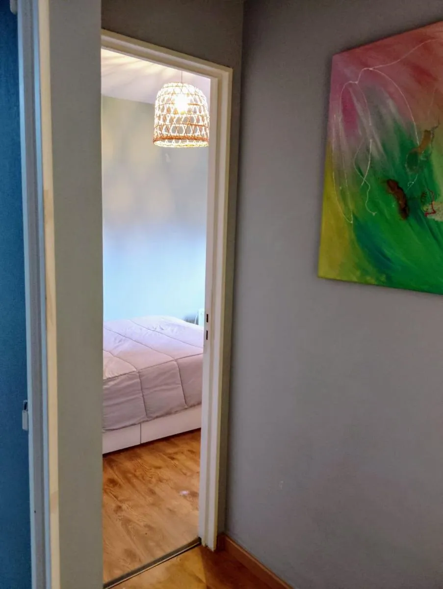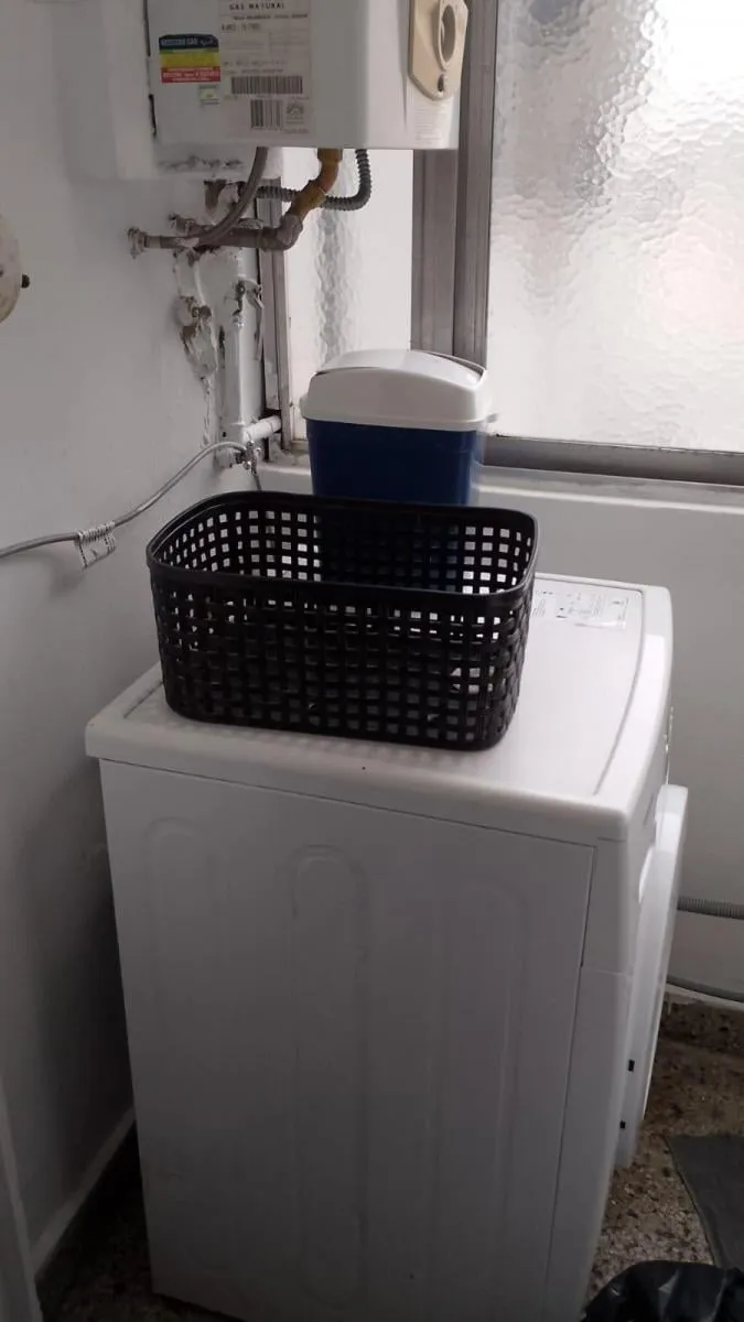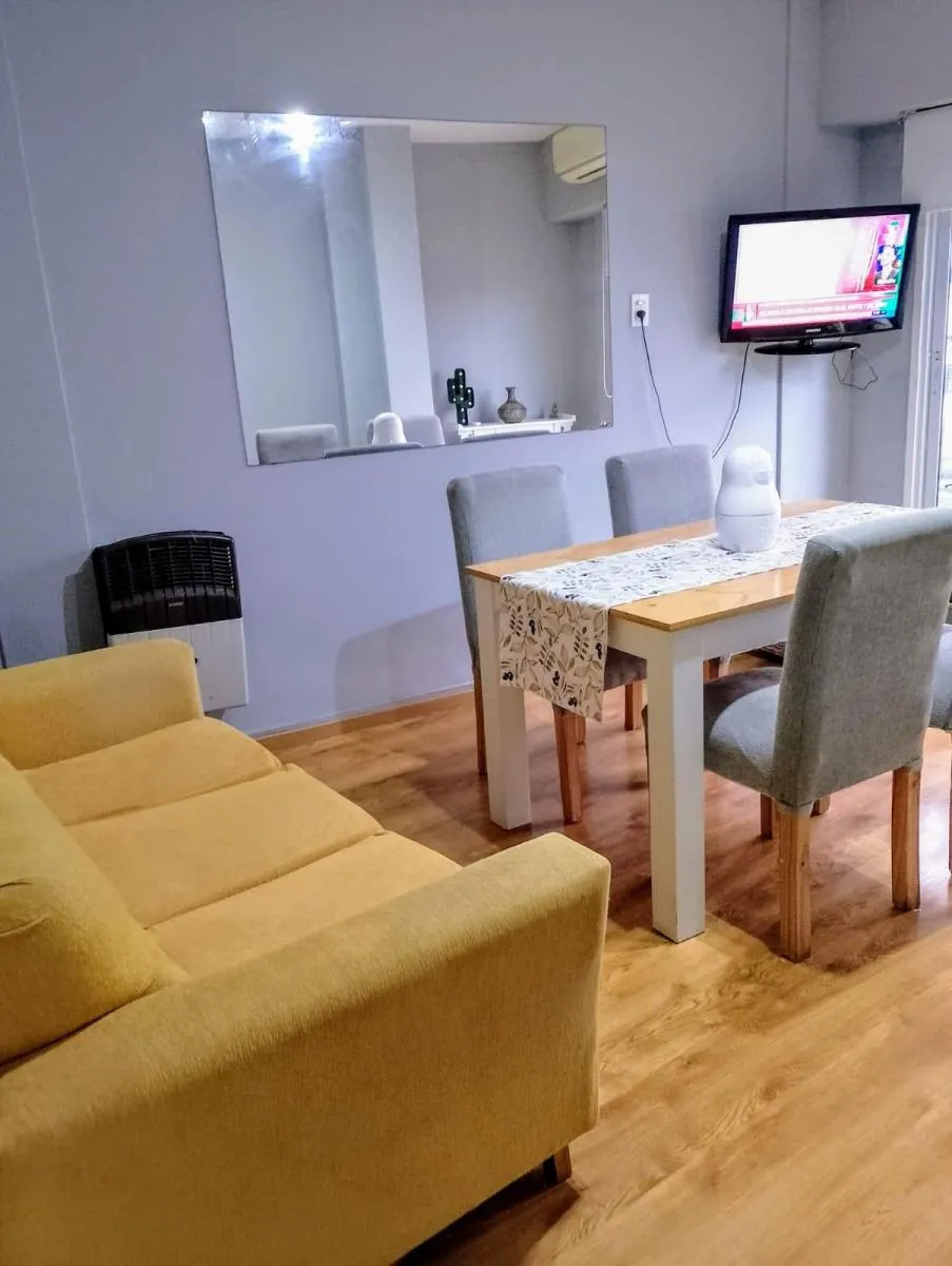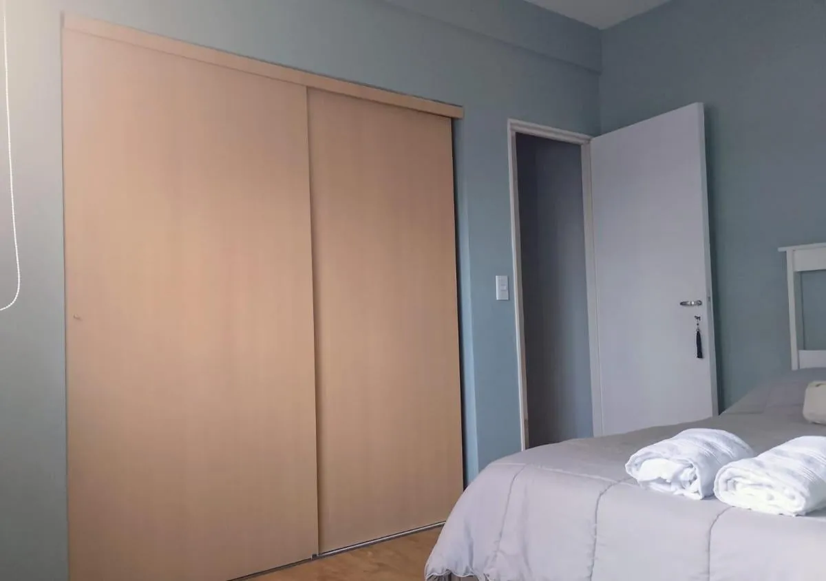 One-bedroom apartment on a high floor in Colegiales, not on the top floor. It has a terrace balcony measuring 7 x 4 m, street-facing views of the avenue, and enclosed windows with sound insulation and blackout curtains. Separate fully equipped kitchen with fridge-freezer, gas stove and oven, cookware and tableware, plus pantry and under-counter storage. Living-dining area with extendable dining table, TV, Wi-Fi, and an air-conditioning unit with hot/cold, while the bedroom has a queen bed with s