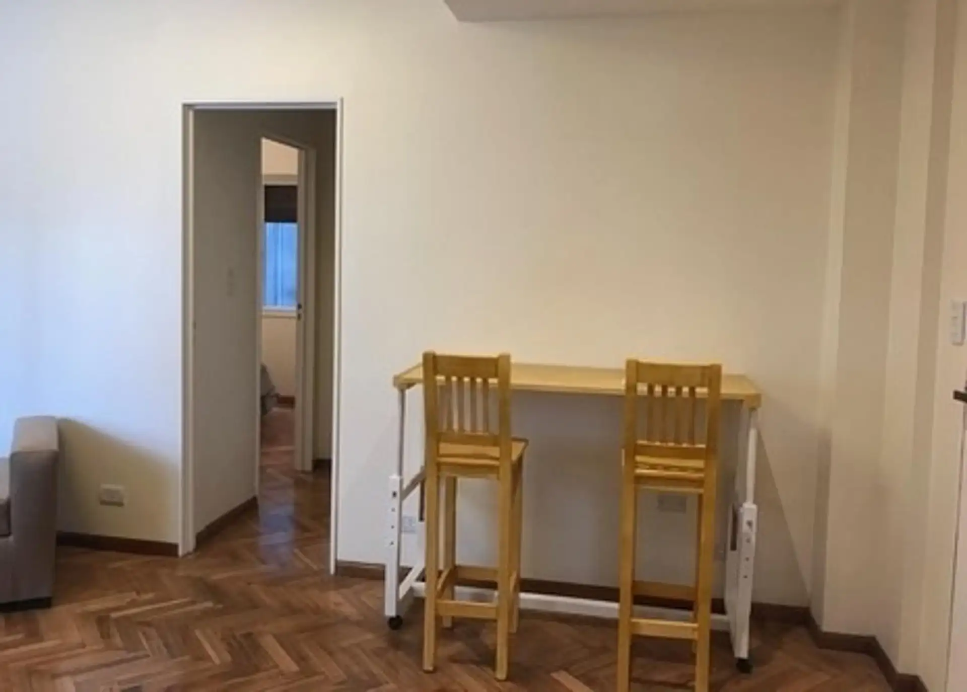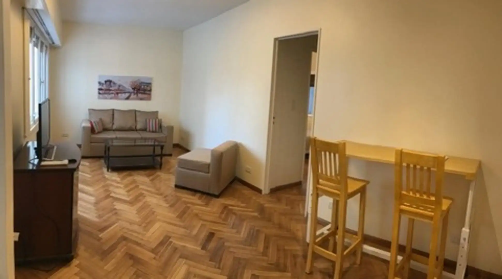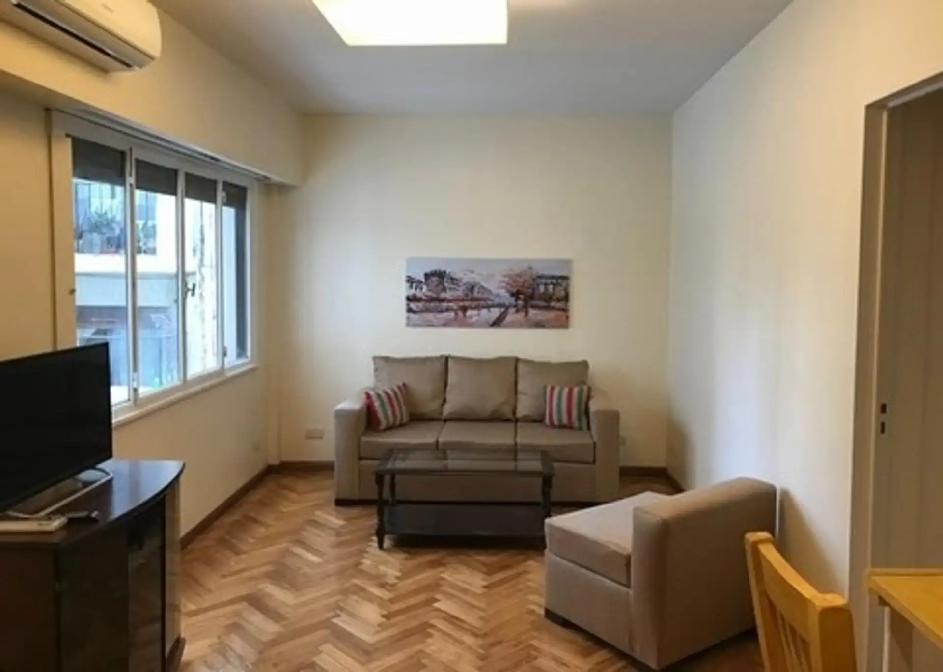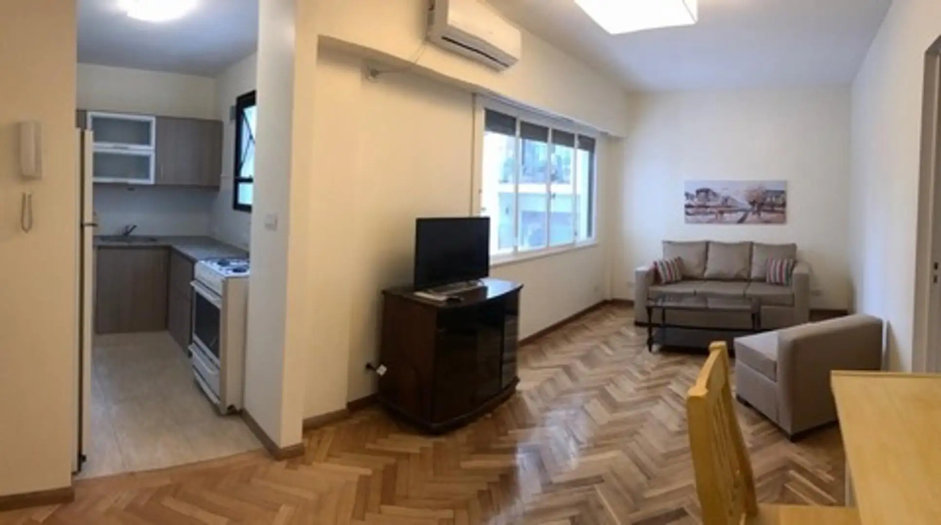 Furnished two-room apartment for up to 2 people, with 48 m² total covered area. It has 1 bathroom, 2 bedrooms and air conditioning with hot/cold settings. The kitchen is equipped with a fridge with freezer, microwave and tableware; the bedroom includes a 2-seat sommier bed and a 32-inch LED TV. The building has 2 lifts and is located in Colegiales, with services nearby.