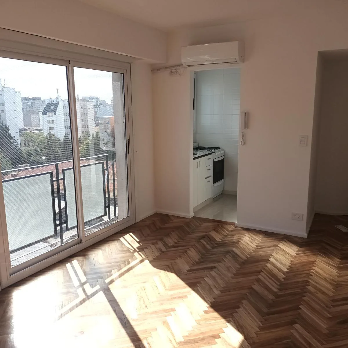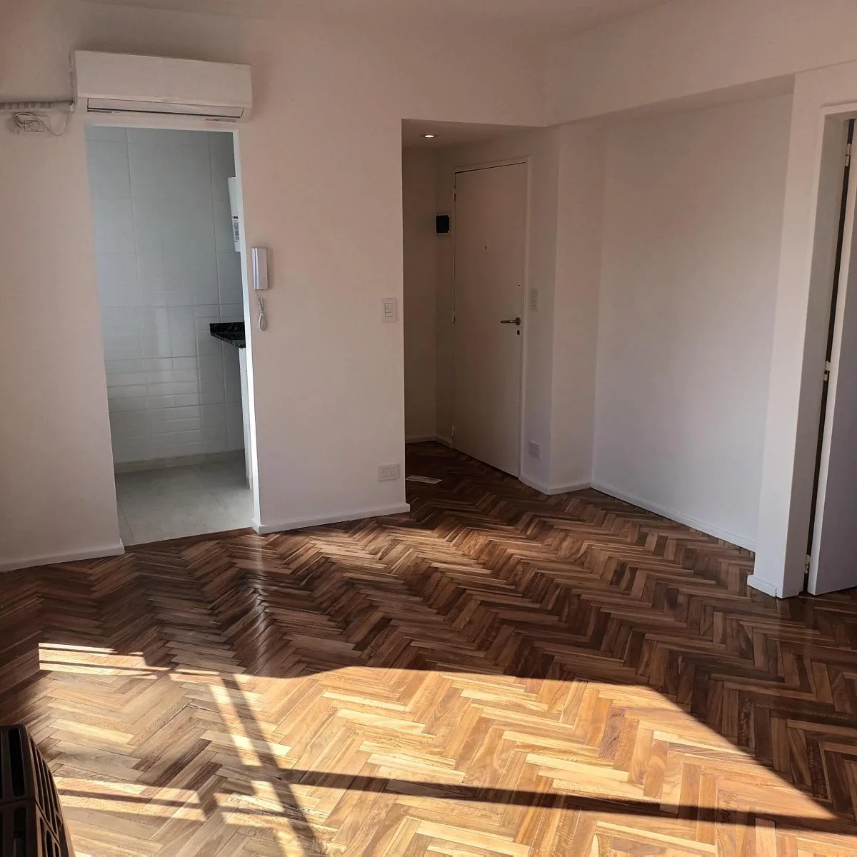Two-room apartment in Constitución, rented unfurnished. It has a front view with the living room fitted with 1 air conditioning unit. Located 50 metres from Subte Línea E, estación San José, and 100 metres from Subte Línea C, estación San Juan.