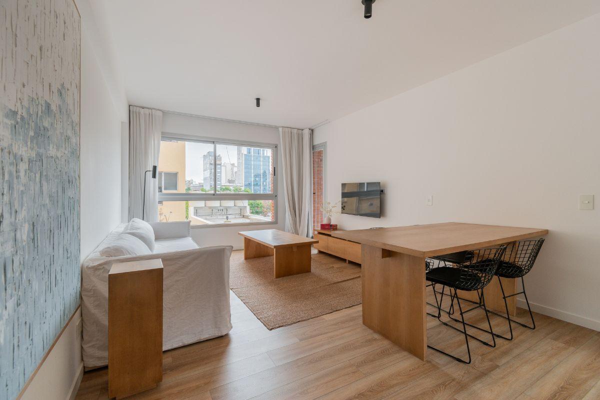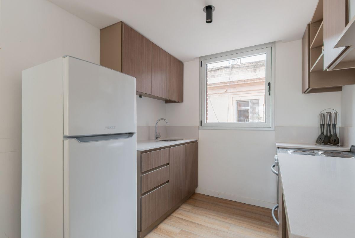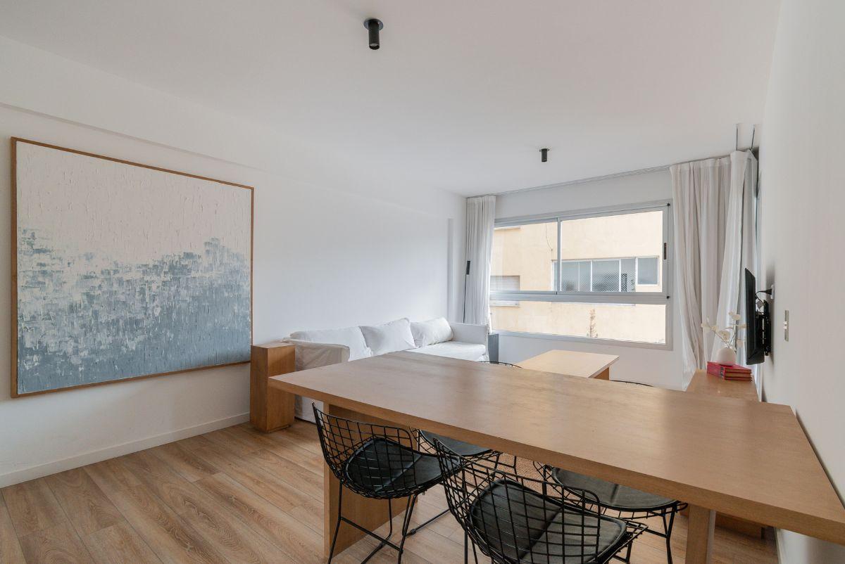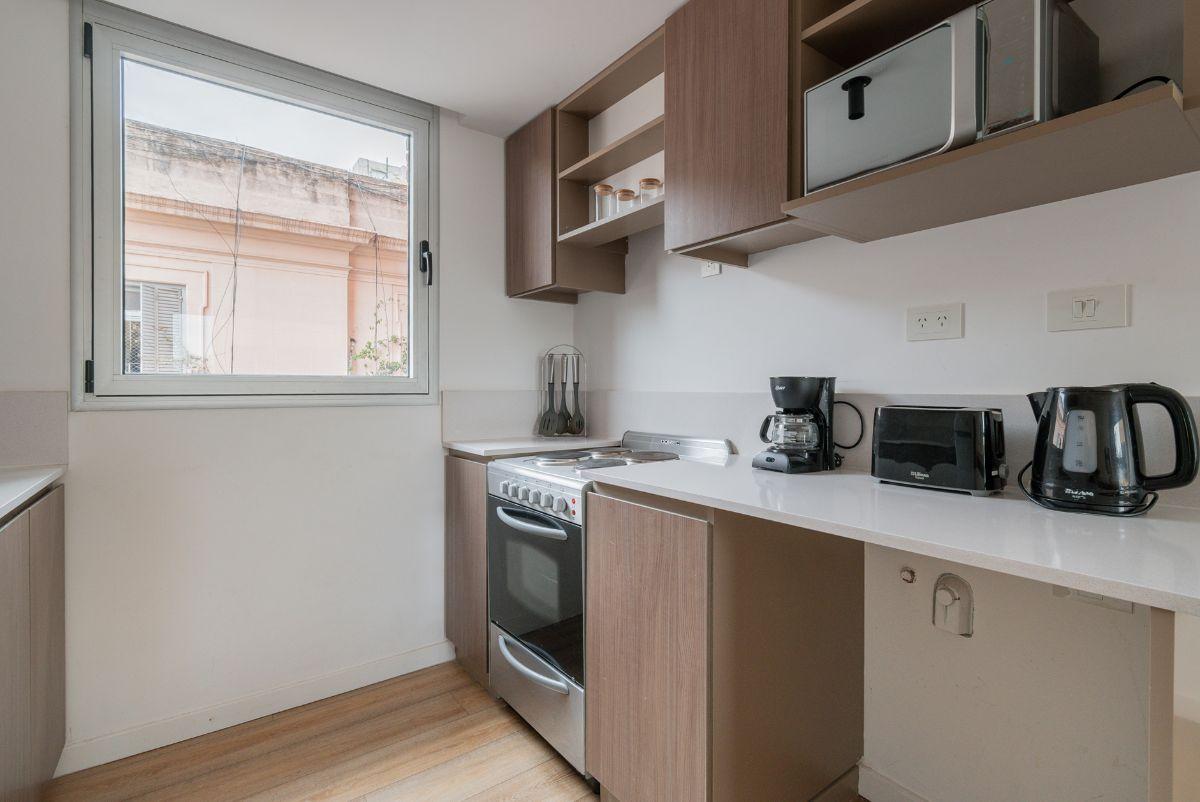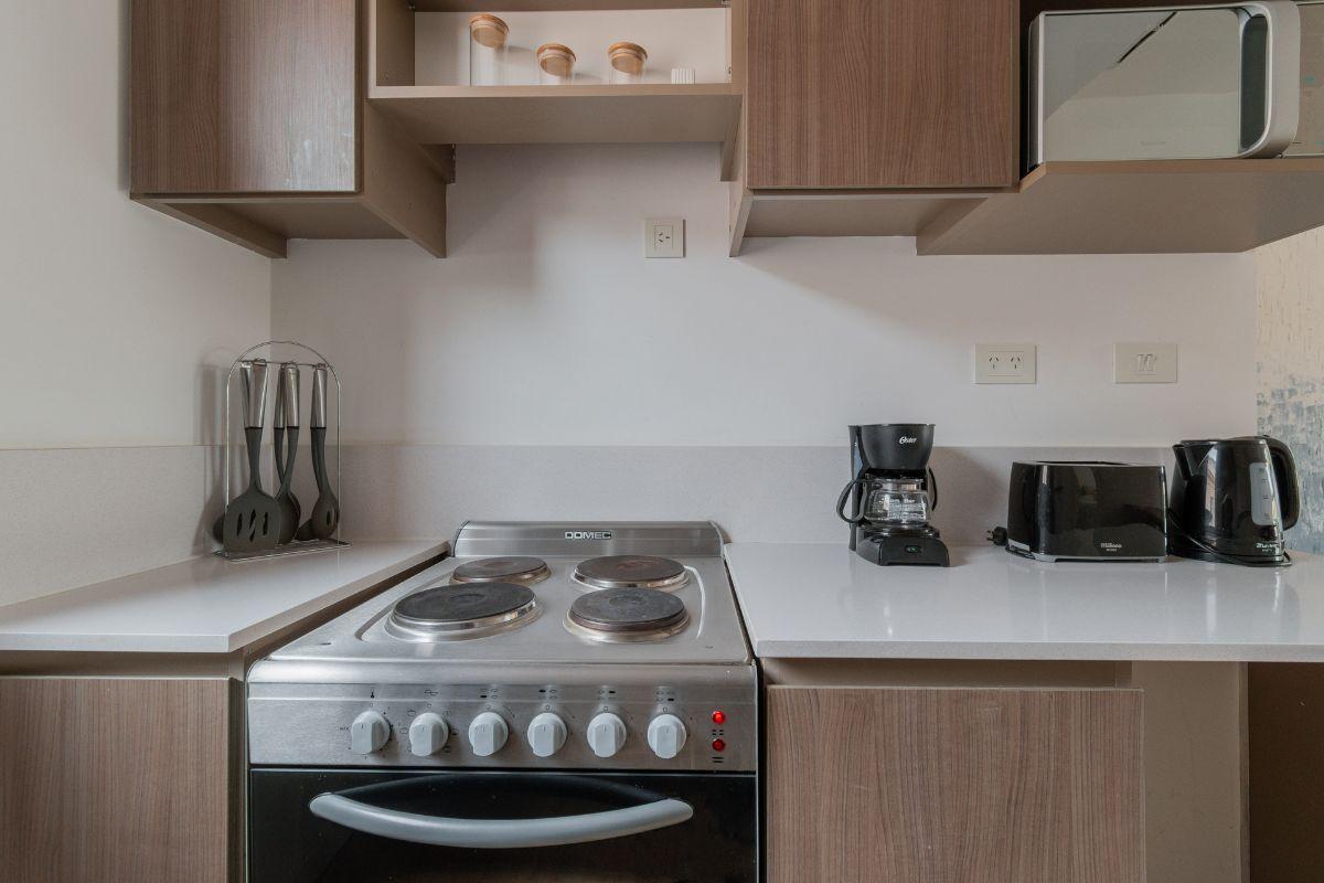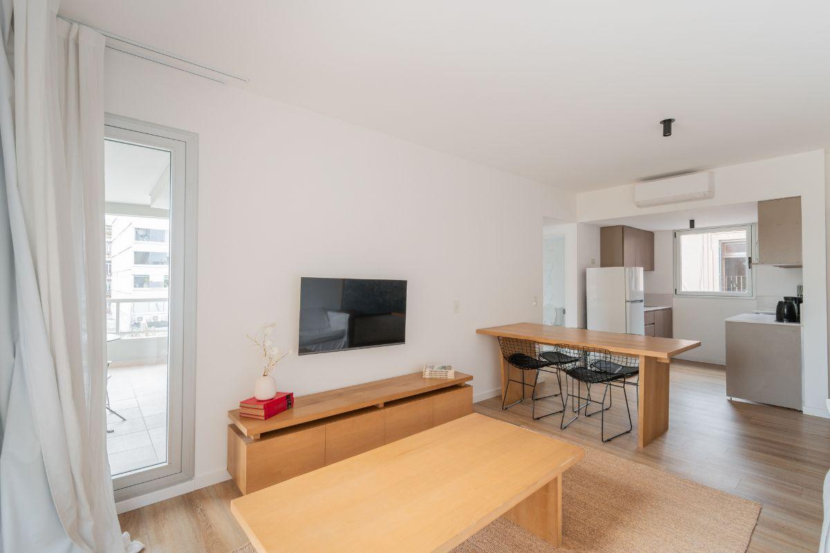 Two-room apartment furnished throughout with a north-facing balcony and two entrances, from the bedroom and from the living room. The bedroom has air conditioning and a built-in dressing area. The integrated electric kitchen opens to the living area, with central hot water and electric cooking; it includes a full set of kitchen items such as a microwave, fridge with freezer, toaster, kettle, coffee maker and dishes. The listing states 1 air conditioner and 1 TV in each room, plus two elevators a