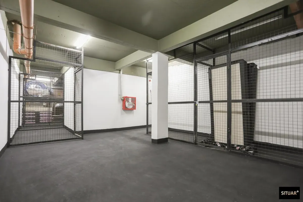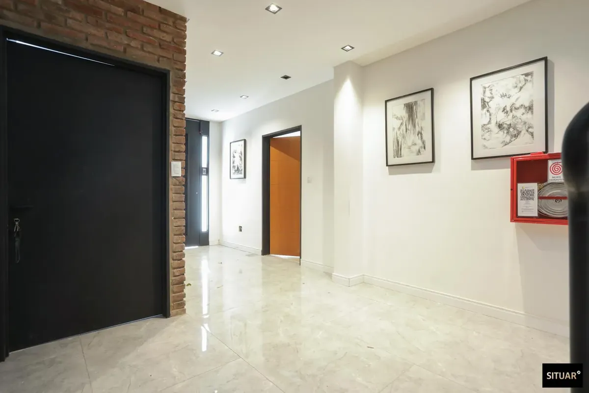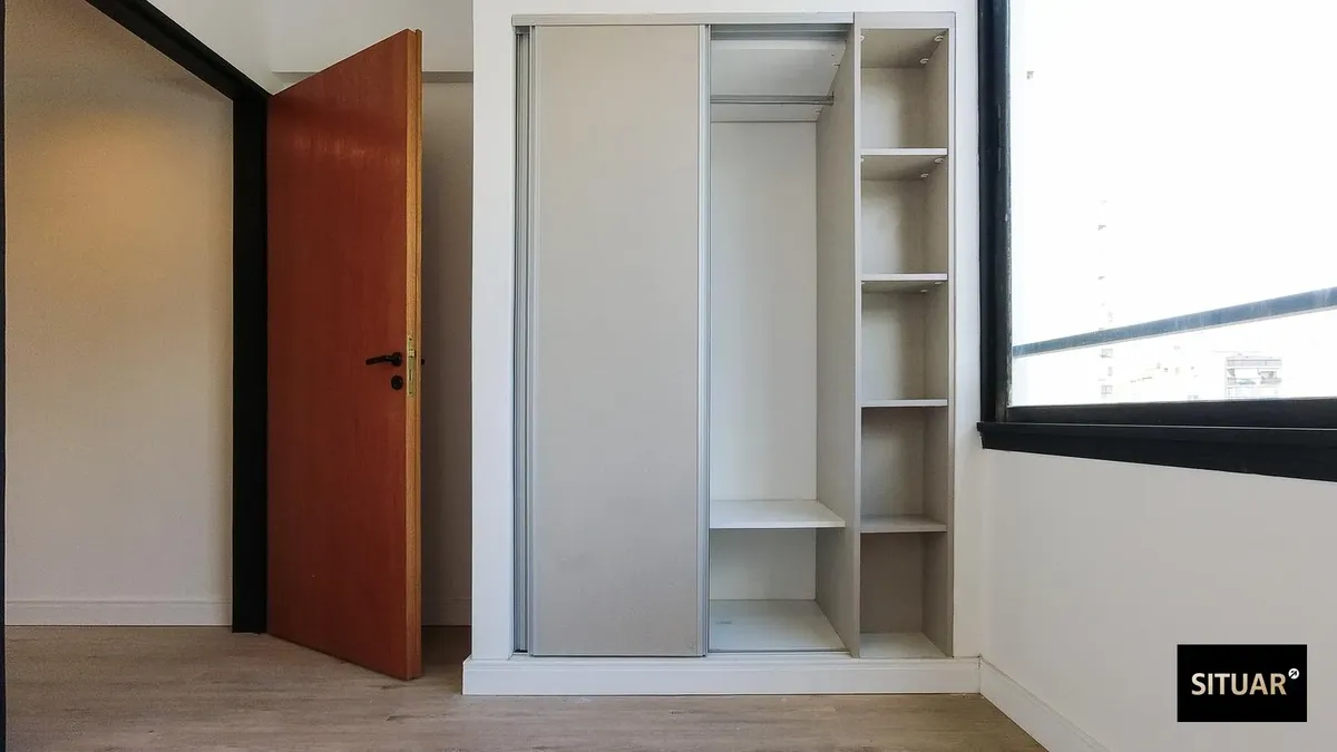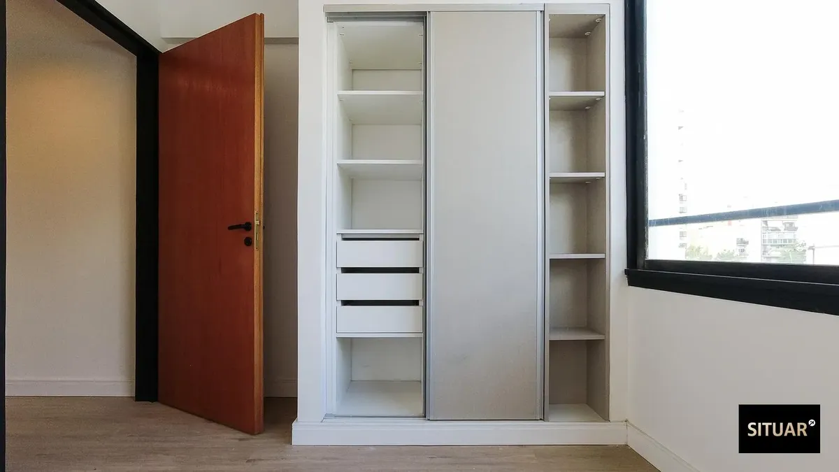 New one-bedroom apartment. Balcony is courtyard-facing, with a grill. It has a full bathroom with a bathtub, built-in wardrobes in the bedroom with sliding doors, and ceiling lights already installed. Air conditioning is in the living room, and there is a connection for a washing machine. The building has a shared grill on the top floor and access is via electronic lock.