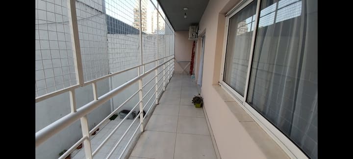 One-bedroom apartment in Flores. The unit is described as quiet and bright, with a bedroom set up with a queen bed and 2 sofa beds in the living-dining room. It has an equipped kitchen, an independent laundry room, a covered balcony with child protection and a bathroom with a bathtub. It is stated to be within walking distance of the Av. Rivadavia subway and the Metrobus, and near Avellaneda Mall.